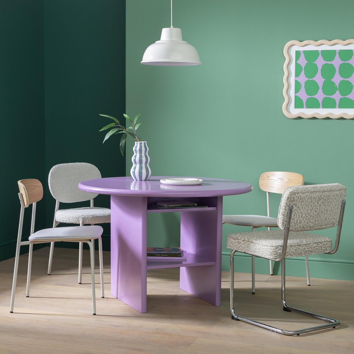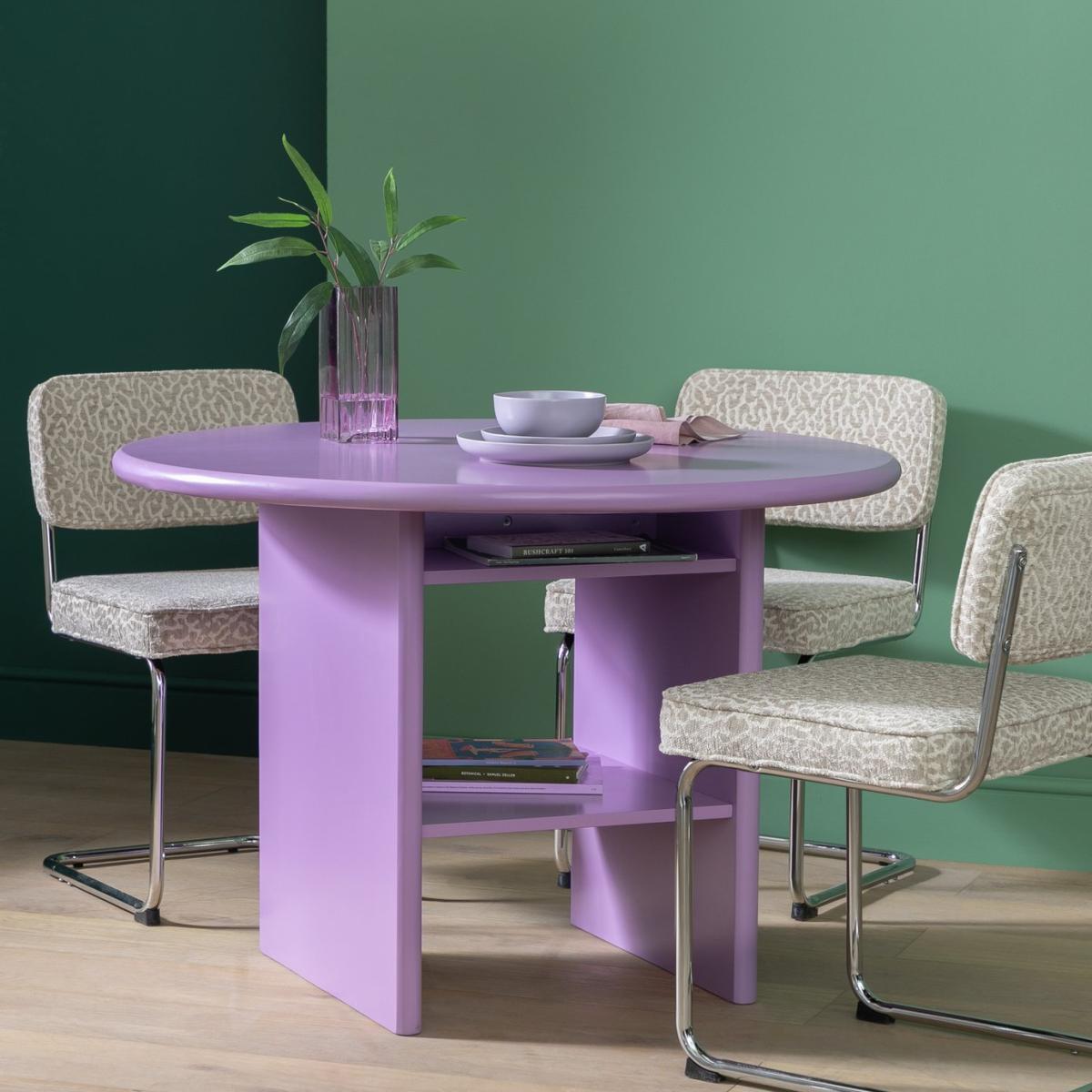 Compact in size, big on colour. Our Geller 2-seater adds a pop of fun personality to your home. It's all clean lines and painted wood. The punchy purple positively zings. Laid-back dinners or competitive board games, Geller will carry you through. Go from working from home, to dining in an instant, just slip laptops and papers on the shelf below. Good design doing its thing. Part of the Geller collection. Table: Table size: H75, L110, W110cm. Diameter 110cm. Solid wood table with solid wood legs. Solid wood table top finish. Self-assembly - 2 people recommended. Weight of table 43.95kg. Package Dimensions: Table packaging size: H13.5, W119, D118cm. General information: By choosing FSC certified products, you are supporting responsible management of the world's forests. Manufacturer's 2 year guarantee.