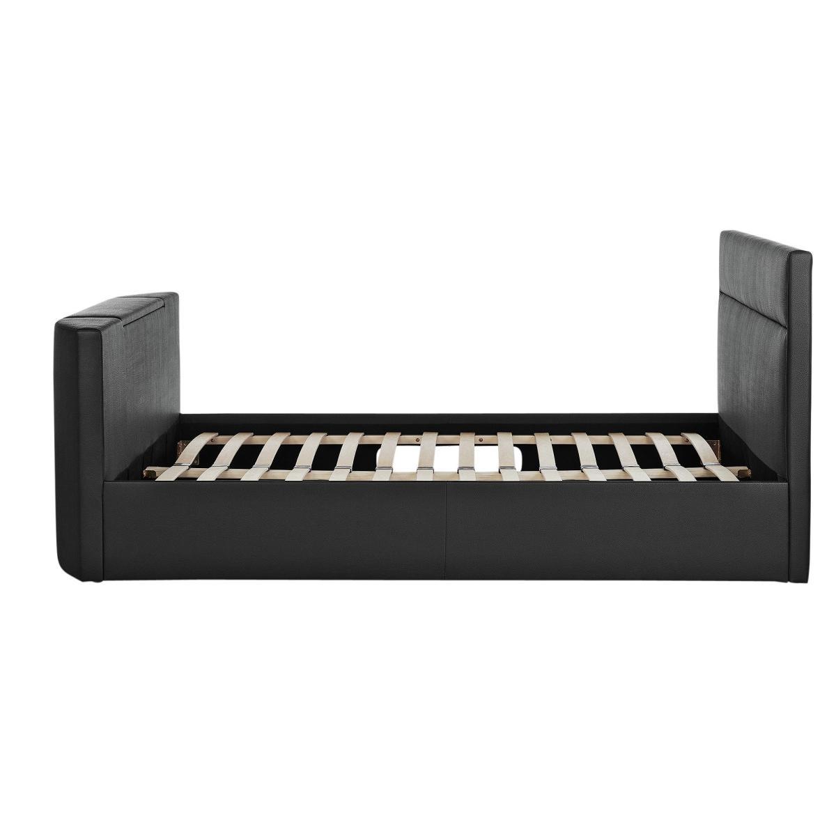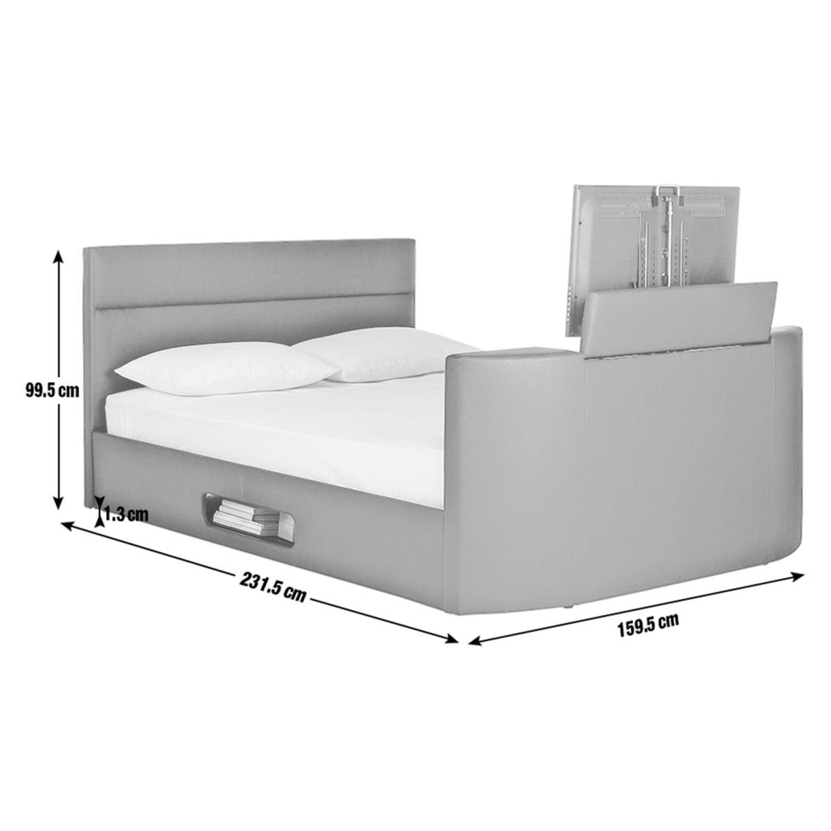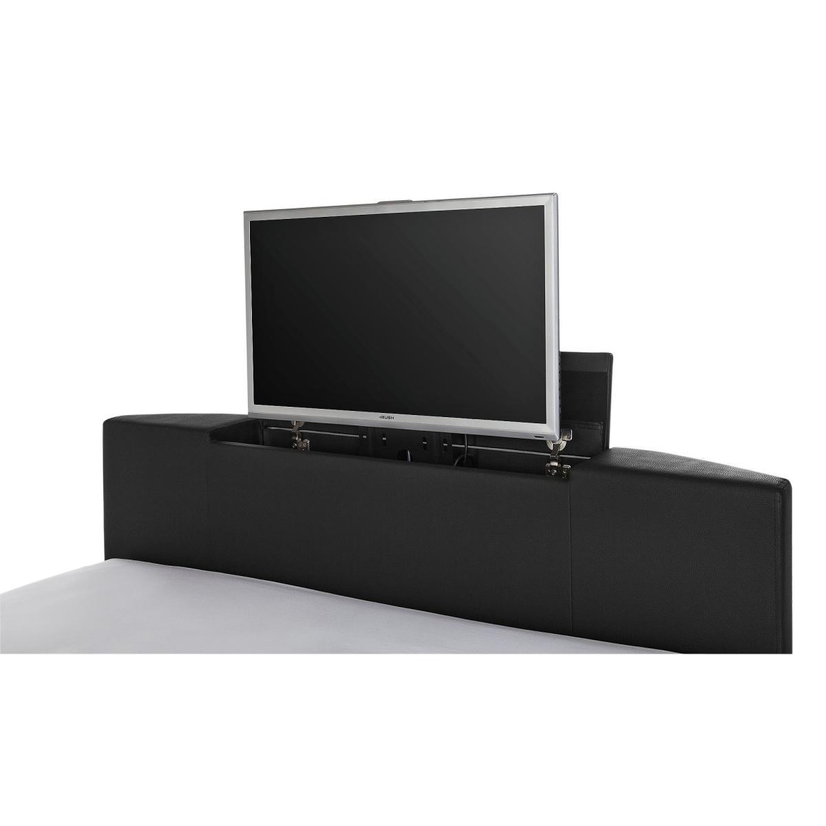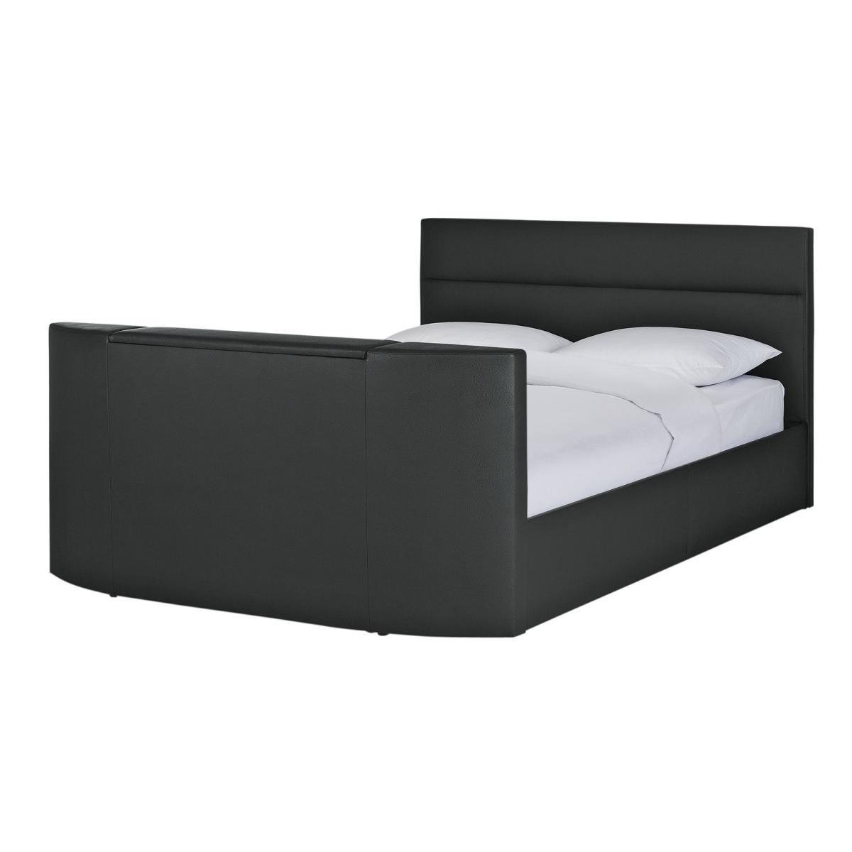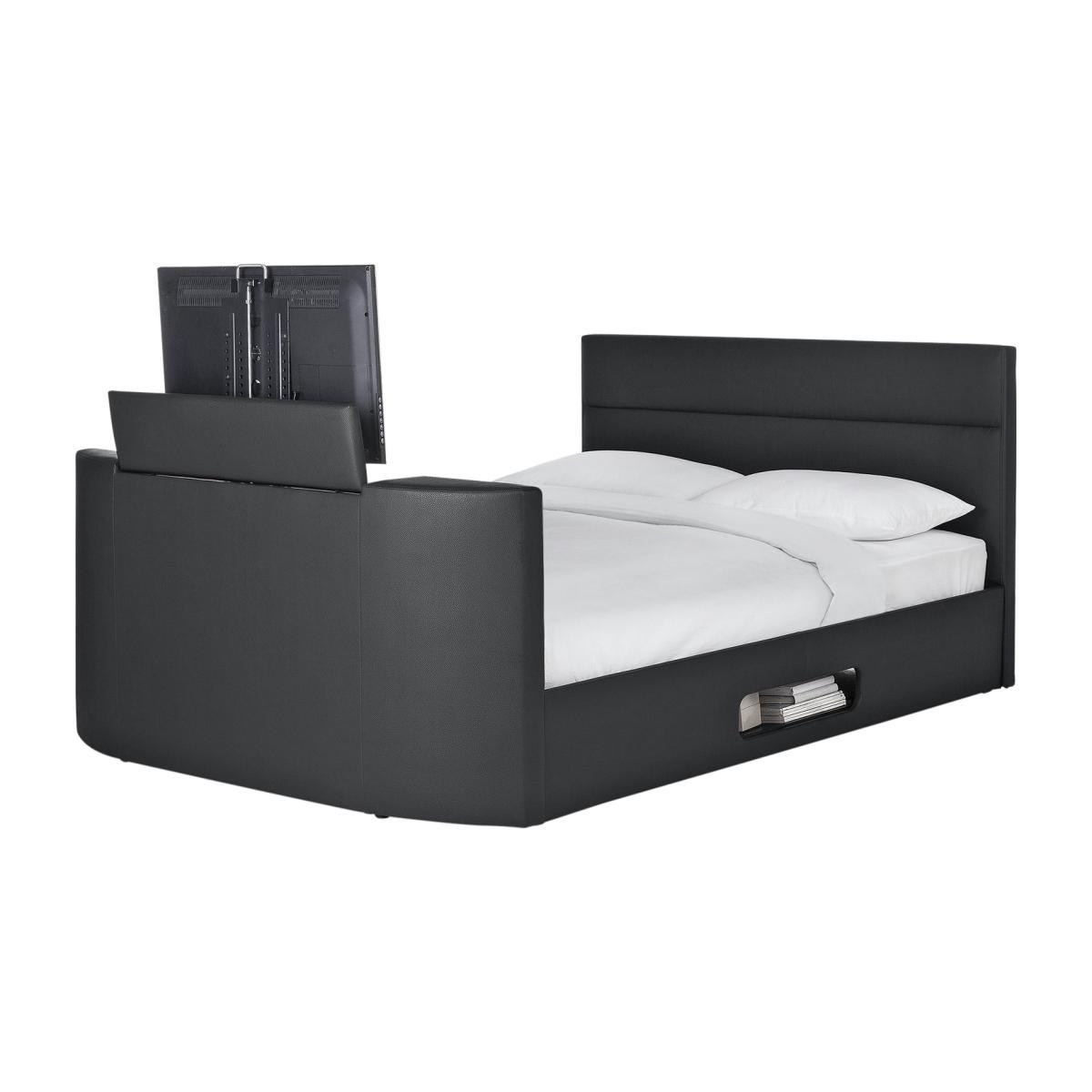 Tuck up, snuggle down and watch yourfavouriteTV show in bed. It's one of life's little luxuries and easy with our cable-ready TV bed. TV lift up by the handle, mechanism will reveal and retract any TV up to 32. When screens are off, sleep well and enjoy the comfort and style of our black faux-leather 5FT bedframe, perfect for contemporary bedrooms. A compartment underneath holds a DVD player, satellite box or games console. Is it a bed or is it an entertainment centre?