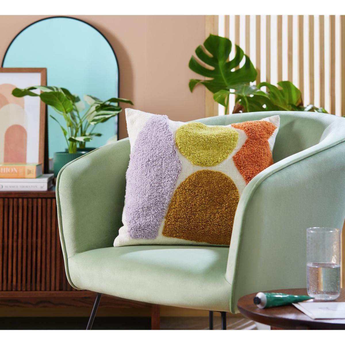 This cushion is a great way to introduce a playful, textured element into a range of interiors. I love its multicoloured, abstract design and soft variety of textures, which work well in both contemporary and bohemian spaces. It's perfect for adding a pop of colour to a neutral sofa or bed, and its 43x43cm size makes it versatile for mixing and matching with other cushions. Styling tips include pairing it with solid-coloured cushions to let the design stand out or layering it with textured throws for a cosy, inviting look. Its tactile surface also makes it ideal for creating a relaxed, curated vibe in living rooms and bedrooms alike.