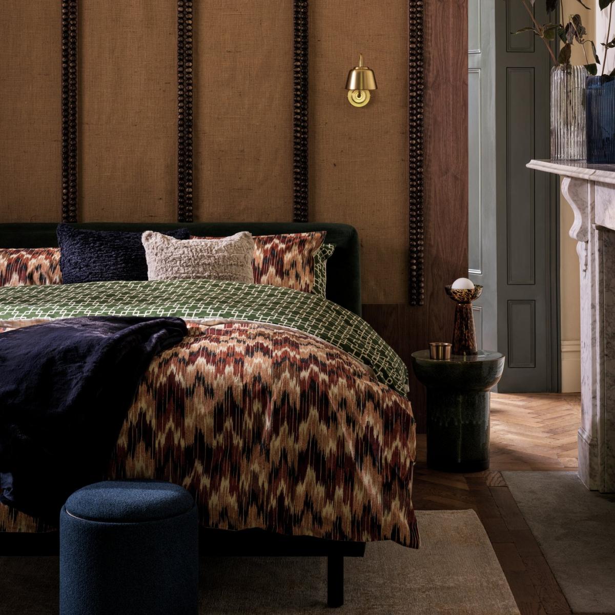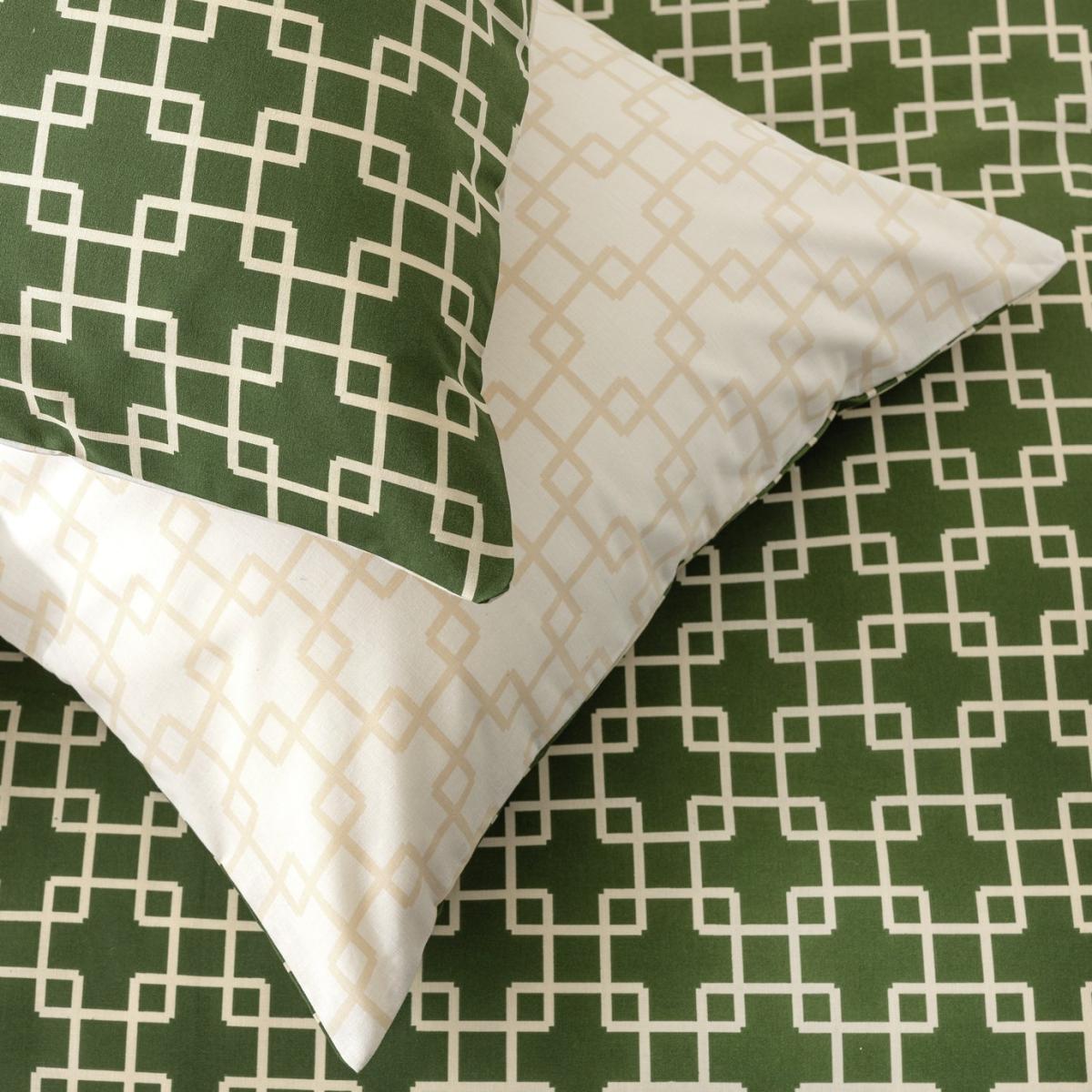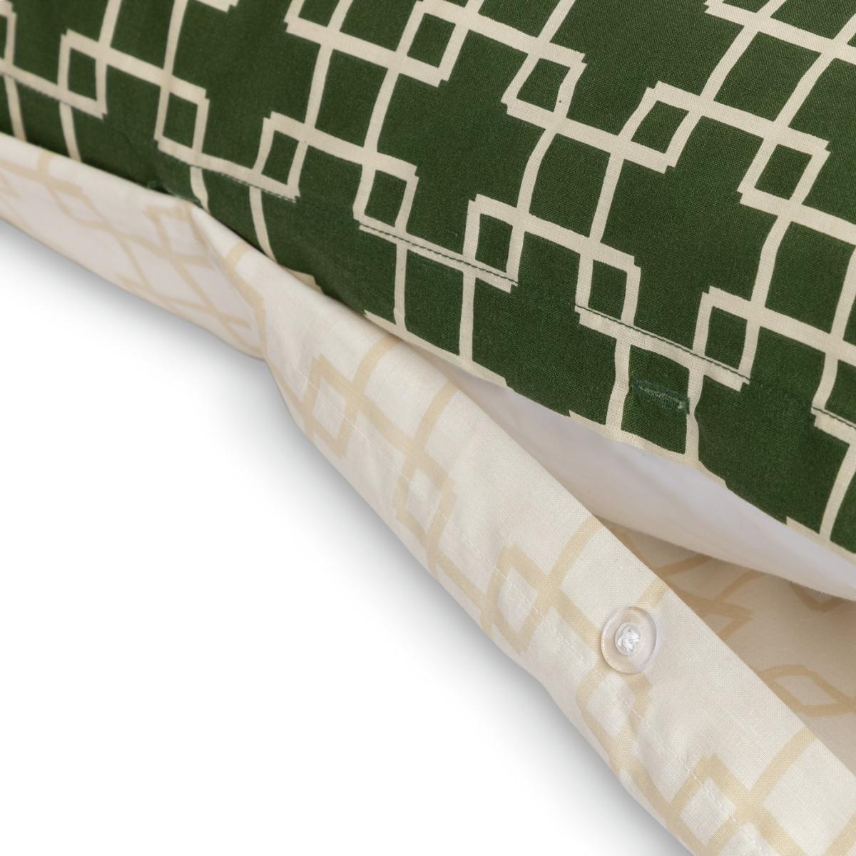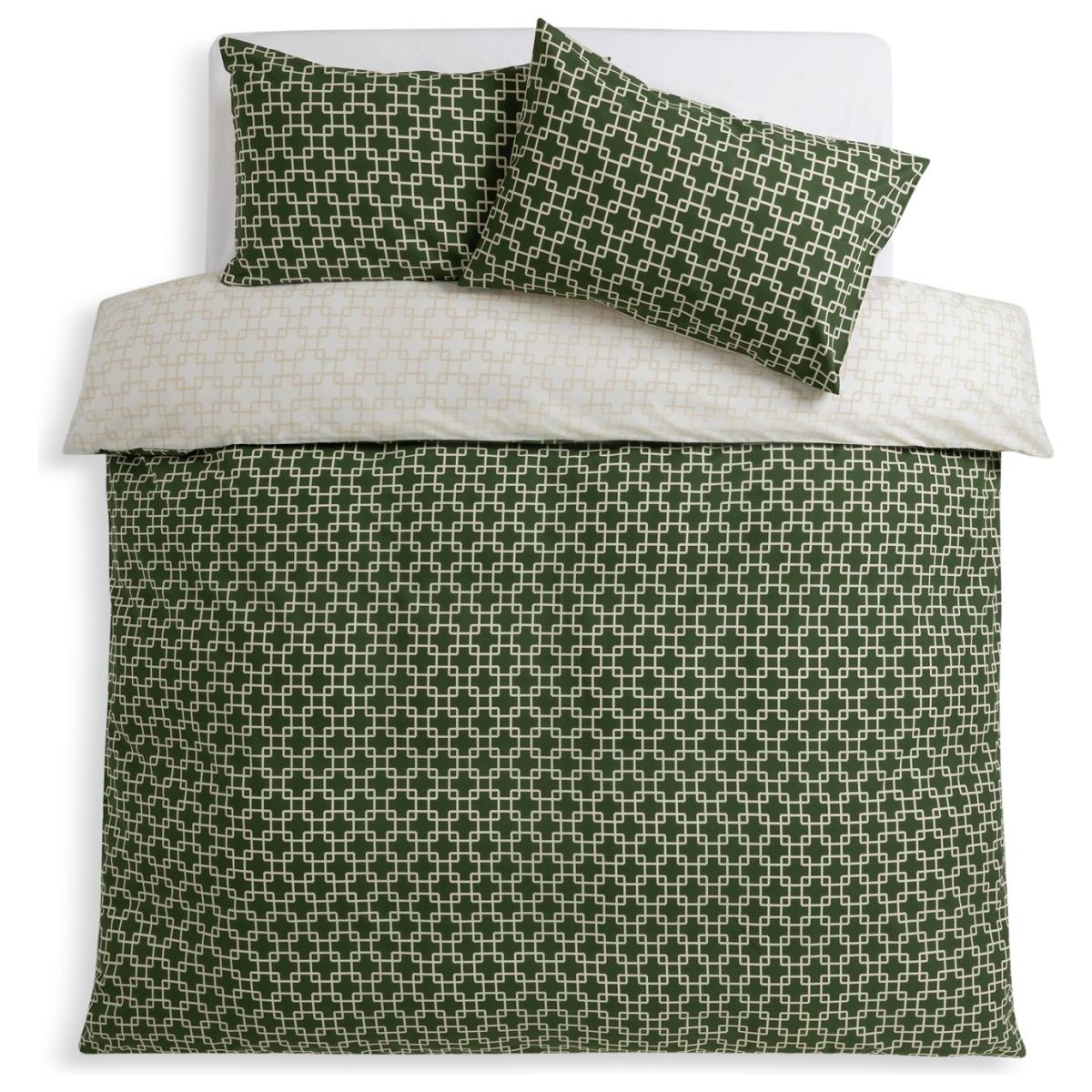 Dress your bed in striking geo style. This repeat trellis print duvet set brings a fresh, retro charm to a bedroom. The blend of contemporary design and vintage green creates an impressive focal point. Fancy a quick change? Flip it over to display the same on-trend pattern in softly muted shades. One set, two looks. That's doubly smart. This item carries the STANDARD 100 by OEKO-TEX logo, which means you can be certain that every component has been tested for harmful substances and is therefore harmless to human health. Fabric finish: percale. 52% recycled polyester, 48% cotton. 144 thread count. Set includes 1 duvet cover and 1 pillowcase. Bed size: double. Length 200cm, Width 200cm. Normal confection edging detail. Reversible. Buttons for fastening. Standard pillowcase (s). Pillow case length 75cm, Width 50cm. Machine washable at 40 C. Suitable for tumble drying.