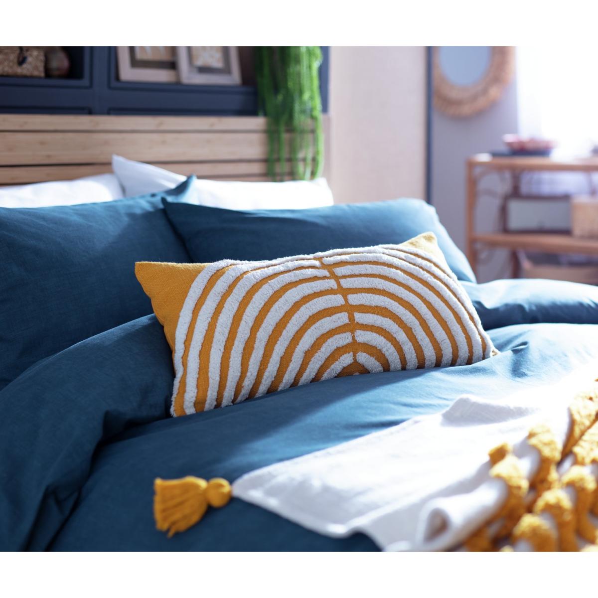 Our rectangle cushion is all about texture and comfort. The white tufted geo design adds depth and dimension and creates a stunning contrast against the vibrant yellow base. Very relaxed, very boho.