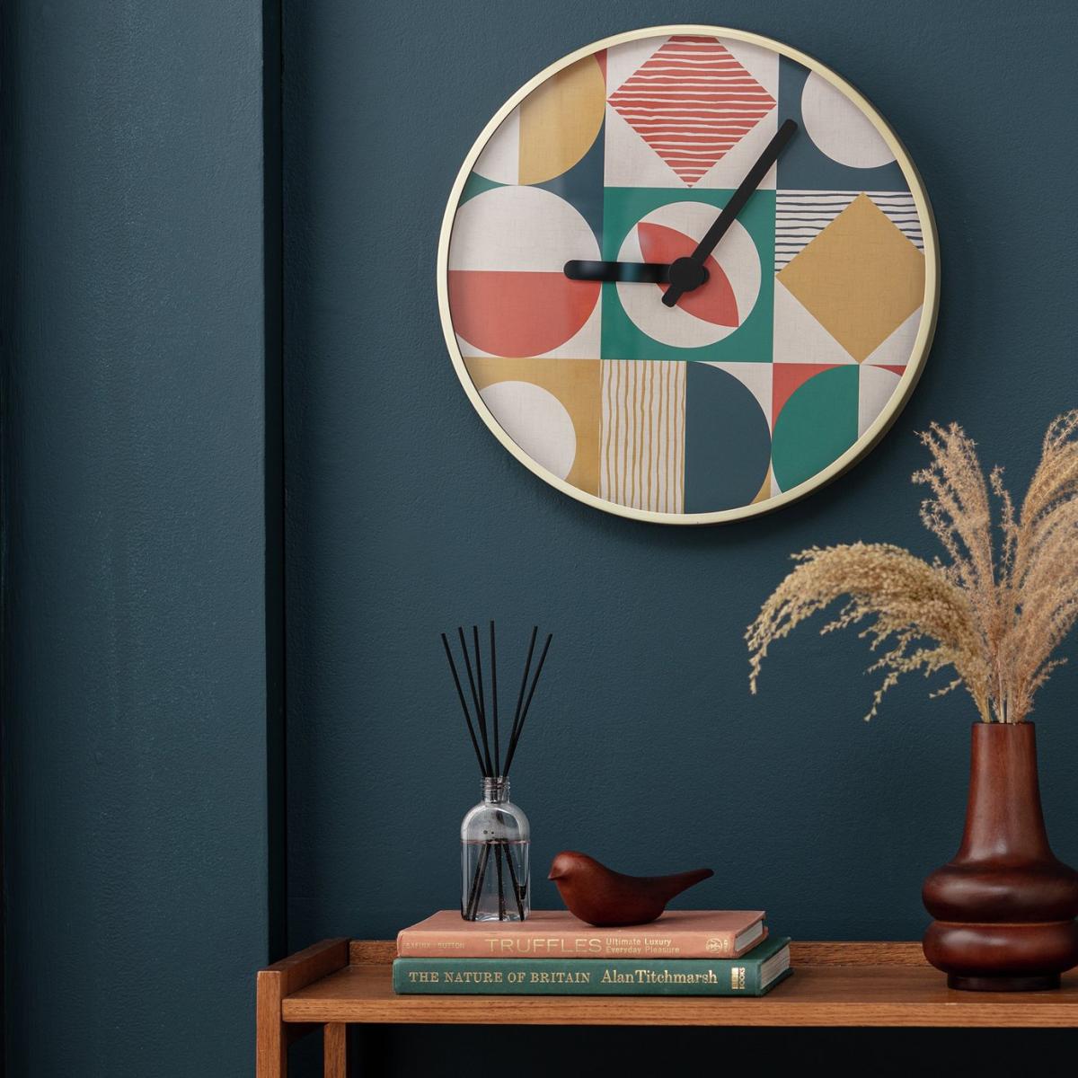I love this wall clock for its bold geometric pattern and chic gold frame, which make it a stylish focal point in various interiors. It works particularly well in modern or contemporary spaces due to its sleek design, but it can also add a touch of visual interest in eclectic or minimalist settings. When styling, consider placing it on a neutral wall to let the pattern and gold accents stand out or pairing it with complementary colours in your decor. Practical tip: hang it at eye level in living rooms, kitchens, or home offices where you want a functional piece that also doubles as art. Its striking design makes it a versatile addition that can effortlessly elevate the aesthetic of a space.