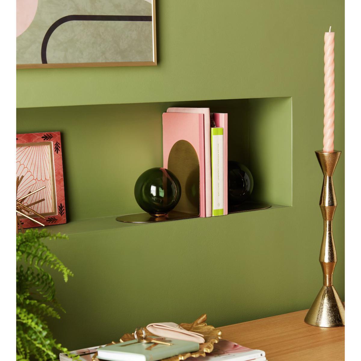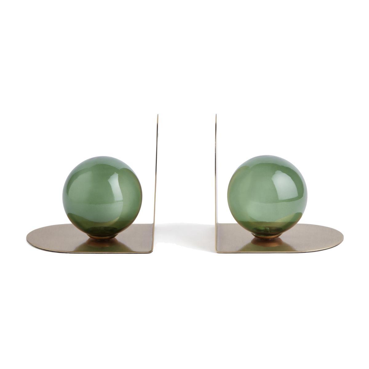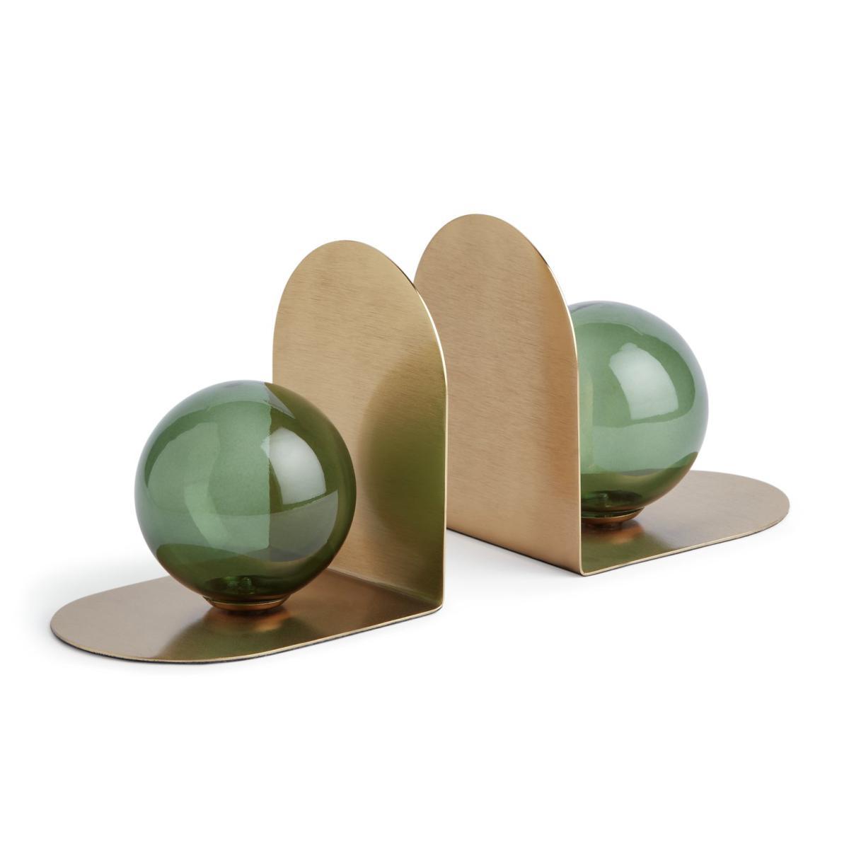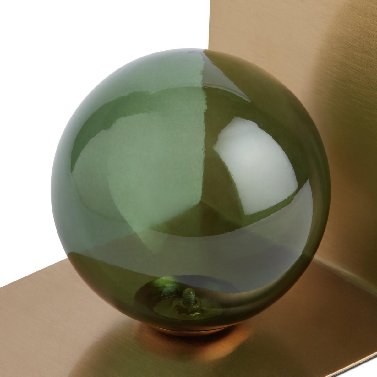 Line up those spines with our elegant green glass ball bookends. See how these opulent orbs sit beautifully within the gold metallic right angles of the stands. We love it. A touch of luxe for your shelf or sideboard. One for the style books for sure. Love a striking statement? Bring on the vibrance with more in our collection. Size H12, W12, D30.5cm. Weight 1300g.