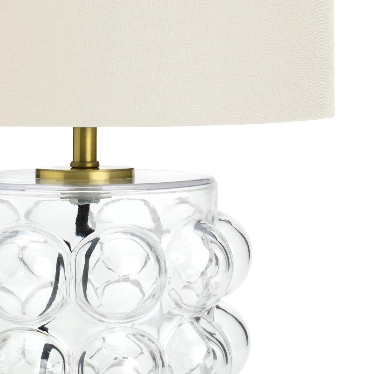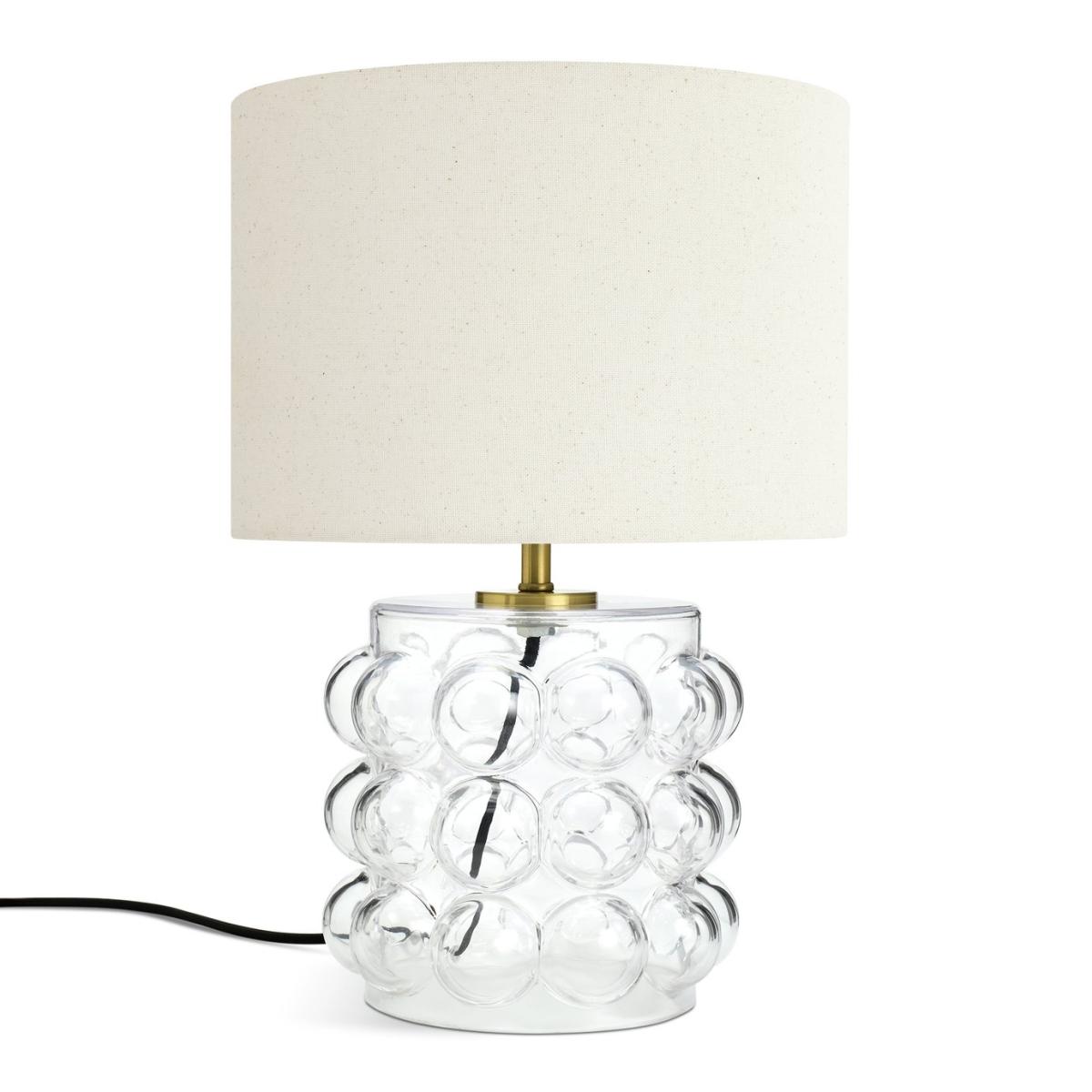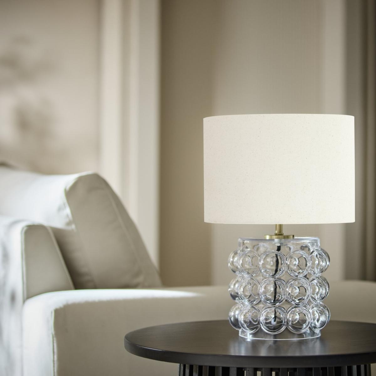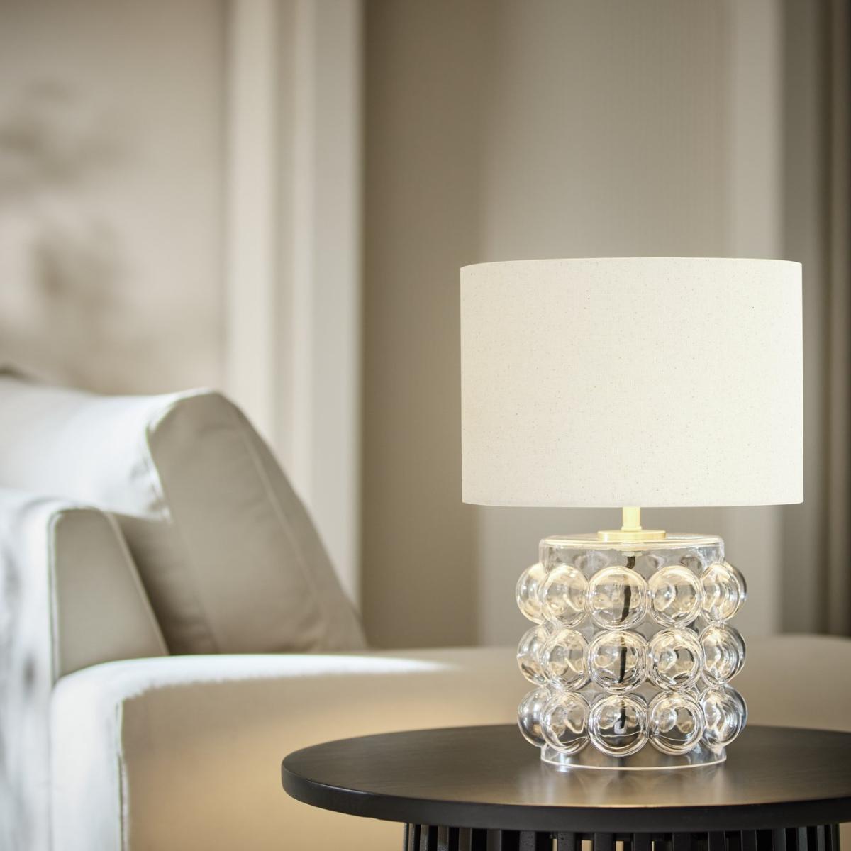 Bold, bobbled and beautiful. The striking clear glass base pairs dramatically with the cream linen like shade. Could our little glass bobble table lamp be just the accent piece you've been looking for? Dimensions: W25.5cm. Diameter 25.5cm. Shade size H18, D25.5cm. Diameter of base 17.7cm. Cord length 1.8m. Bulb Information: Bulbs required 1 x candle E14 small edison screw LED bulb(s)(not included). Recommended maximum wattage: 10 watts. LED bulb only. General Information: Shade colour: cream. Base colour: clear glass. Shade material: polyester. Base material: glass. In-line switch. IP rating 20. Minimal assembly. Product is mains powered plug in. This lighting product is a class 2 fitting. Manufacturer's 1 year guarantee.