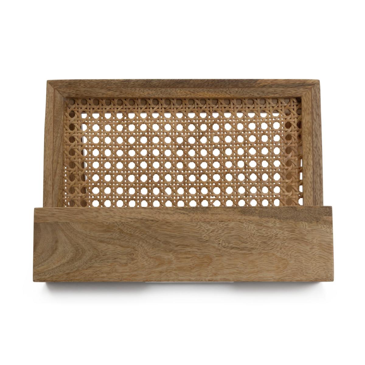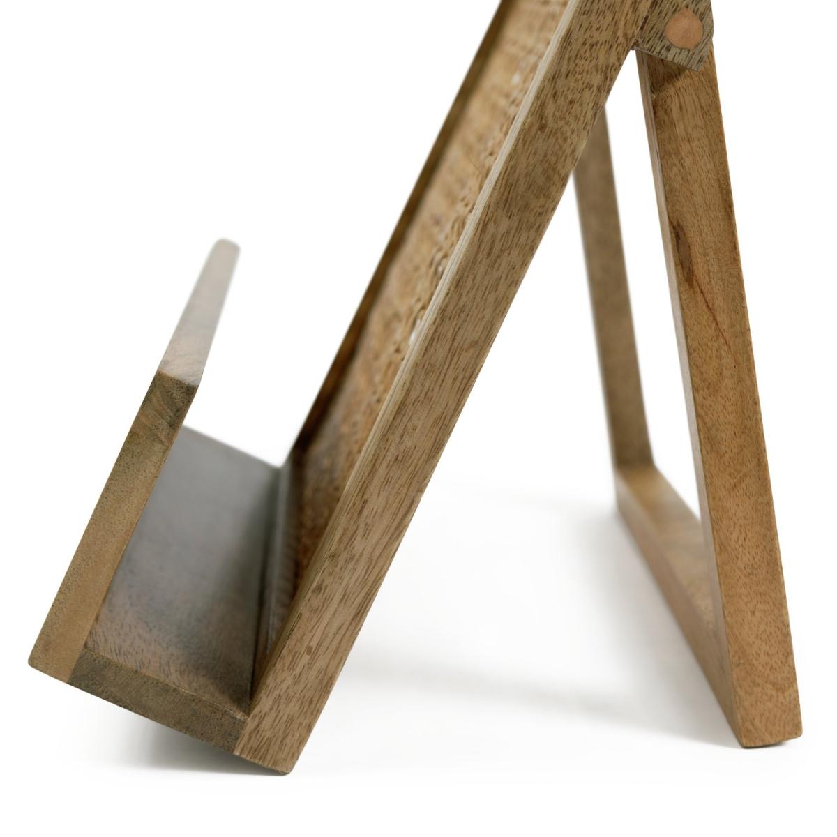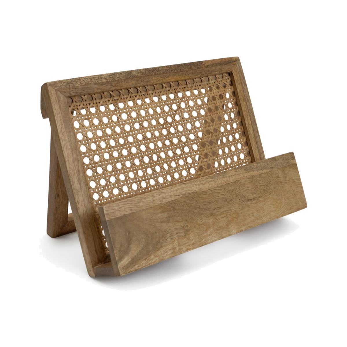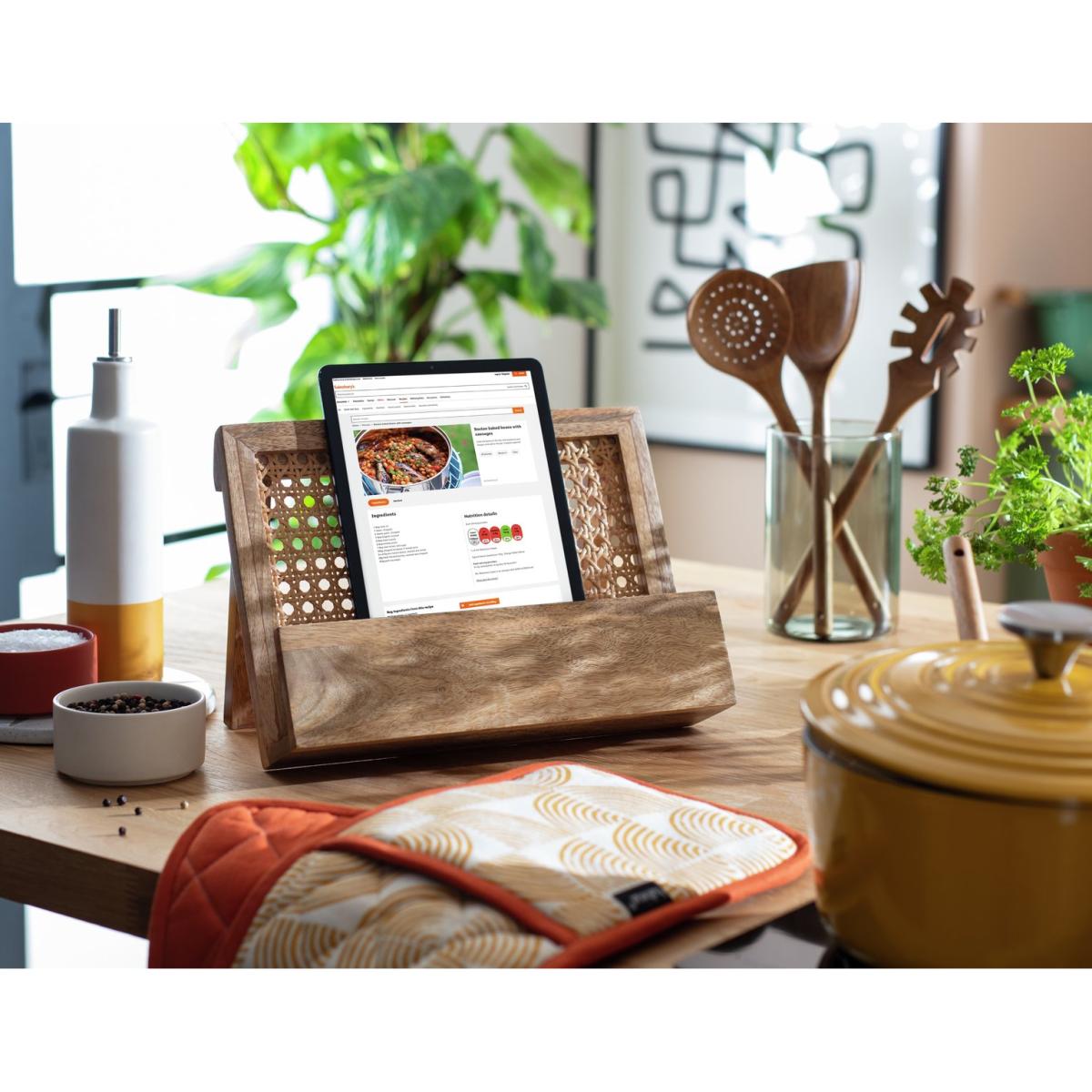 What's cooking. Pop your tablet (or book) on our smart mango wood stand and follow your step-by-step recipe with ease. With a rattan back for both decoration and ventilation, this is a tablet stand that shouts style. Recipe complete but still busy in the kitchen? Then use this stand to watch a movie or music video. Wood. Size H22, W30, D18cm. Handwash only. Manufacturer's 1 year guarantee.