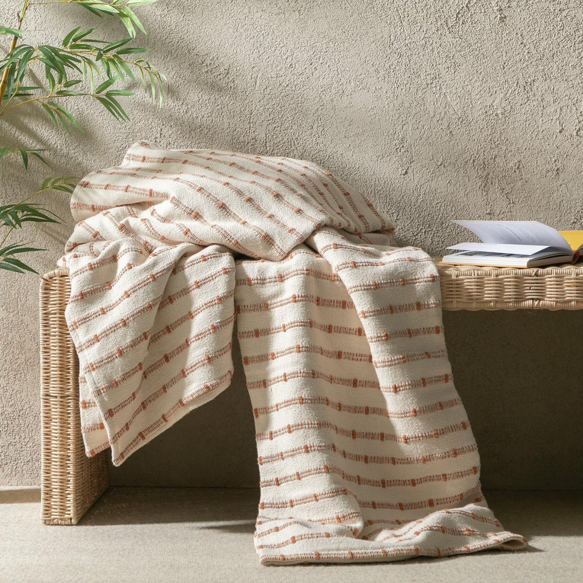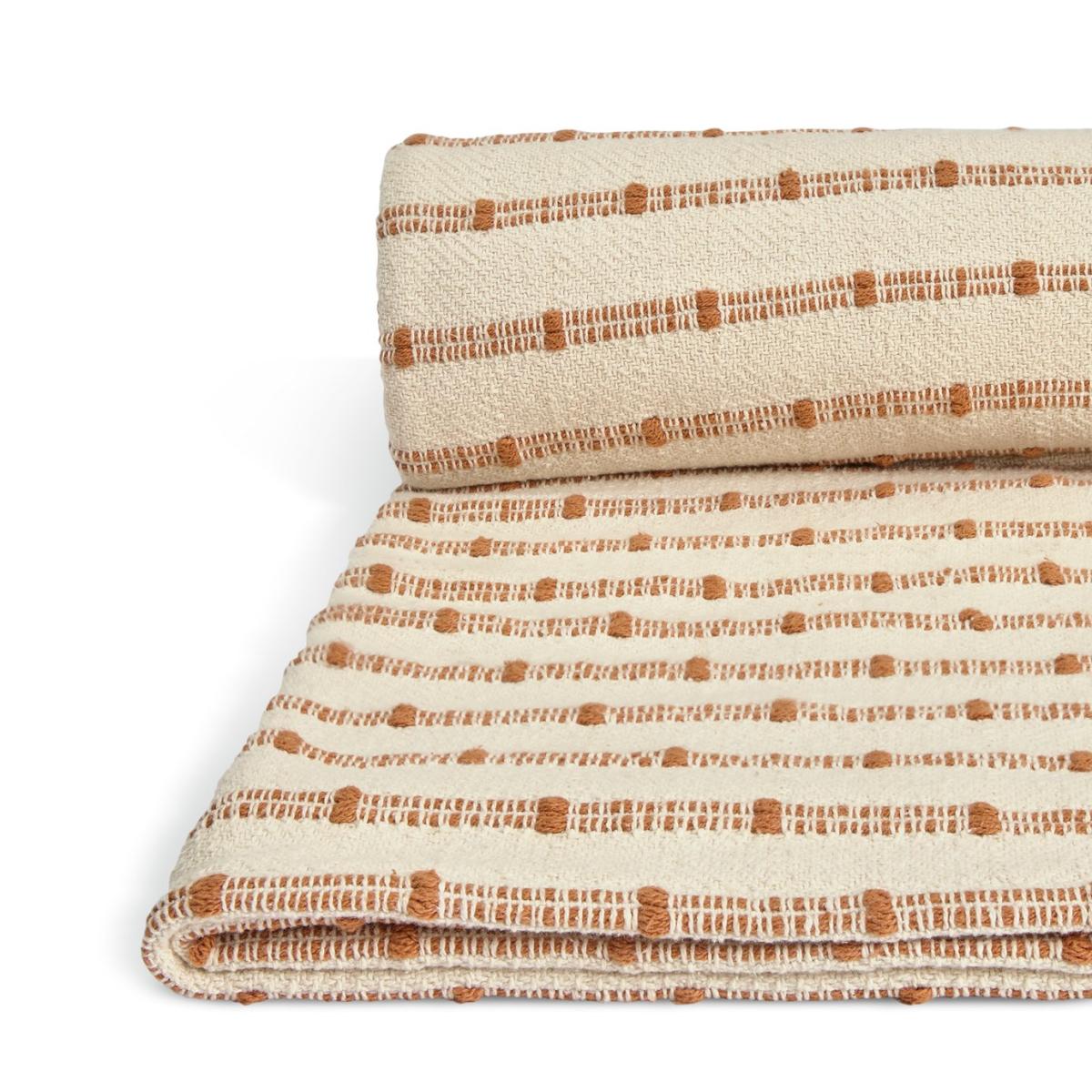 Beautifully woven in 100% cotton, our throw features a ribbed pattern in its weave. Finished with hemming for extra style. Neutral and rust nice to snuggle up with. Suitable for a king sized bed. 100% cotton. Size L220, W200cm. Machine washable.