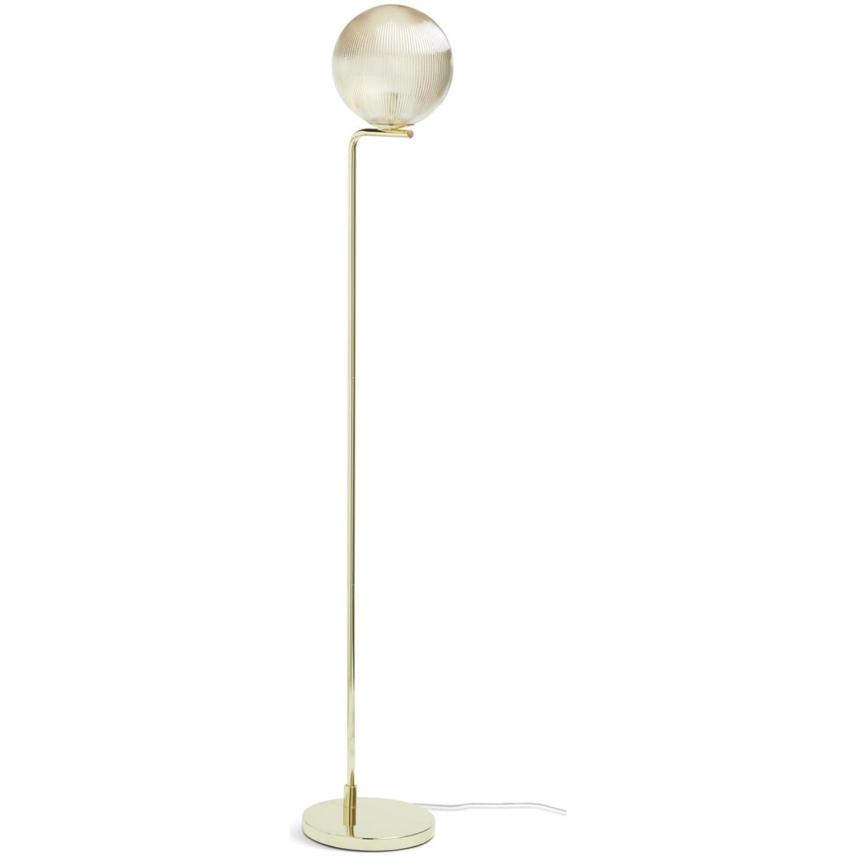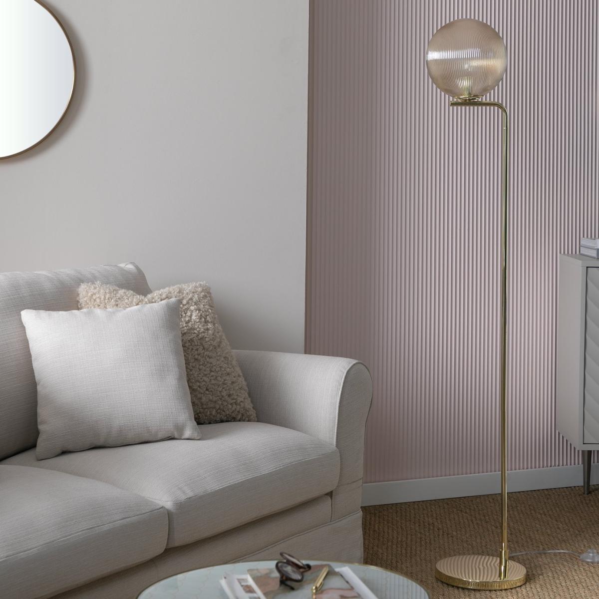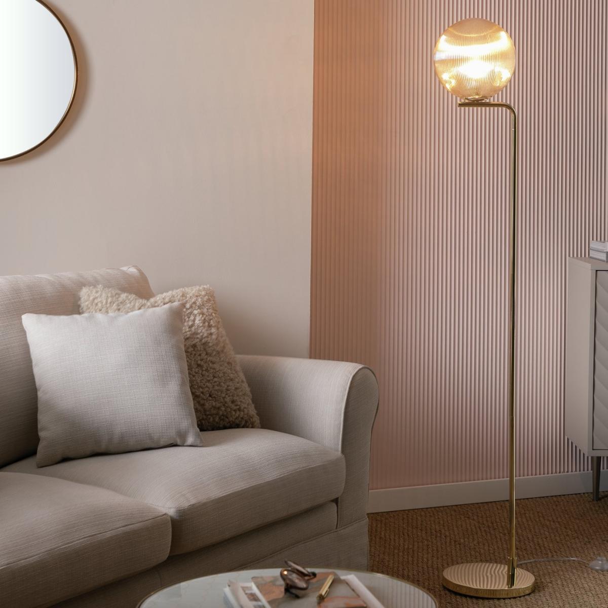 Here's a floor lamp that knows how to shine. Nestled on top of a slender brass stand, the curvaceous champagne ribbed glass shade has an opulent look. While the warm tinted glass diffuses the light, resulting in a softened glow. A touch luxe? You bet. No reaching up to turn this floor lamp on or off. It has a floor switch for easy control. Dimensions: Size H154, Diameter 27.5cm. Diameter of base 25cm. Shade size H22.5, D22.5cm. Cord length 1.8m. Bulb Information: Bulb required 1 x candle E14 small edison screw LED (not included). 6 watts. (bulb not included). LED bulb only. General Information: Foot switch. IP 20 - not suitable for bathroom use. Self-assembly. This lighting product is a class 2 fitting. Weight 4kg. Globe Glass. Manufacturer's 1 year guarantee.