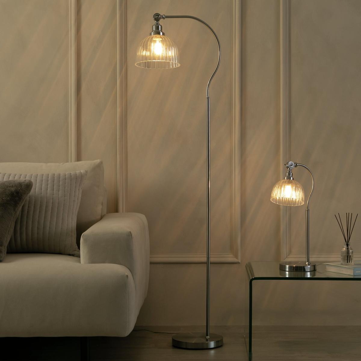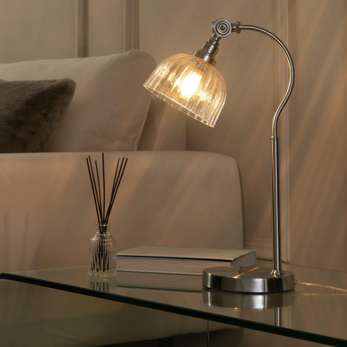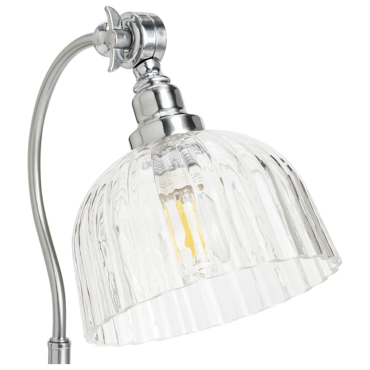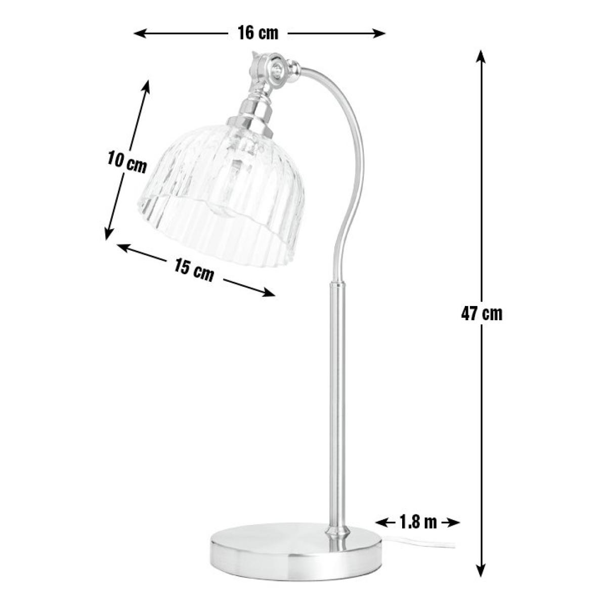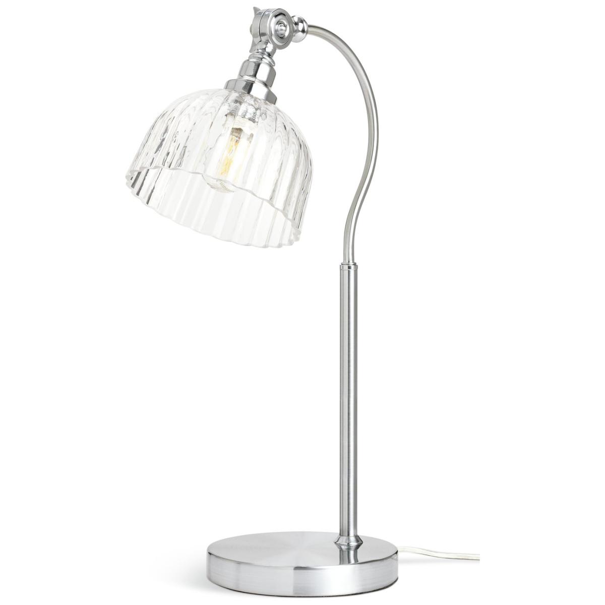 Bring some vintage looks home. Our gooseneck table lamp offers an update on a British classic. In modern chrome with a curved and inclined neck and topped with a clear, ribbed glass shade, it offers high-end looks. Perfect to throw warm light onto a special spot. Dimensions: Overall size H47, Diameter 16cm. Shade size H10, D15cm. Diameter of base 16cm. Cord length 1.8m. Bulb Information: Bulbs required 1 x E14 small edison screw filament LED bulb(s) (not included). Recommended maximum wattage: 8 watts. LED bulb only. General Information: Shade colour: glass. Base colour: chrome. Shade material: glass. Base material: metal. In-line switch. IP rating 20 - not suitable for bathroom use. Supplied assembled. Product is mains powered plug in. This lighting product is a class 2 fitting. Gooseneck. Manufacturer's 1 year guarantee.
