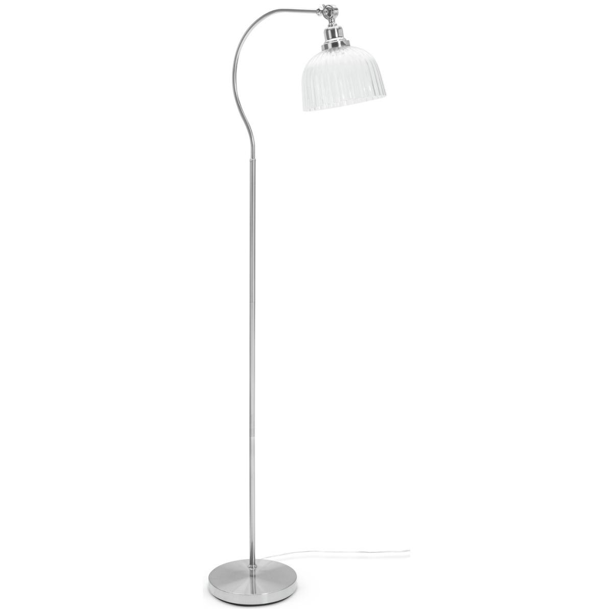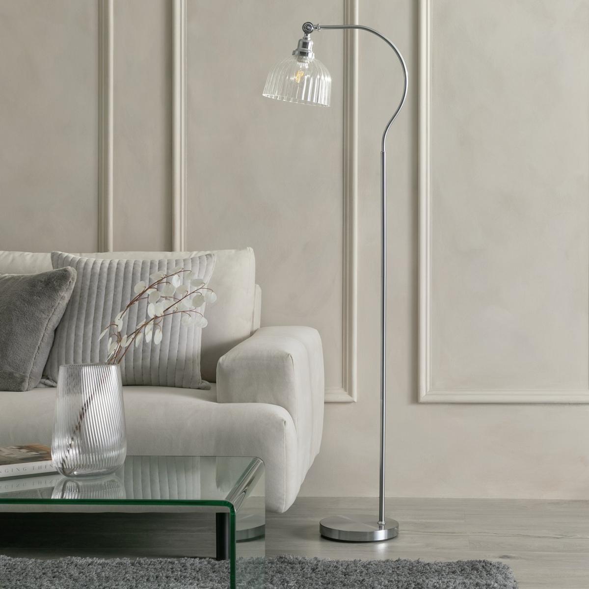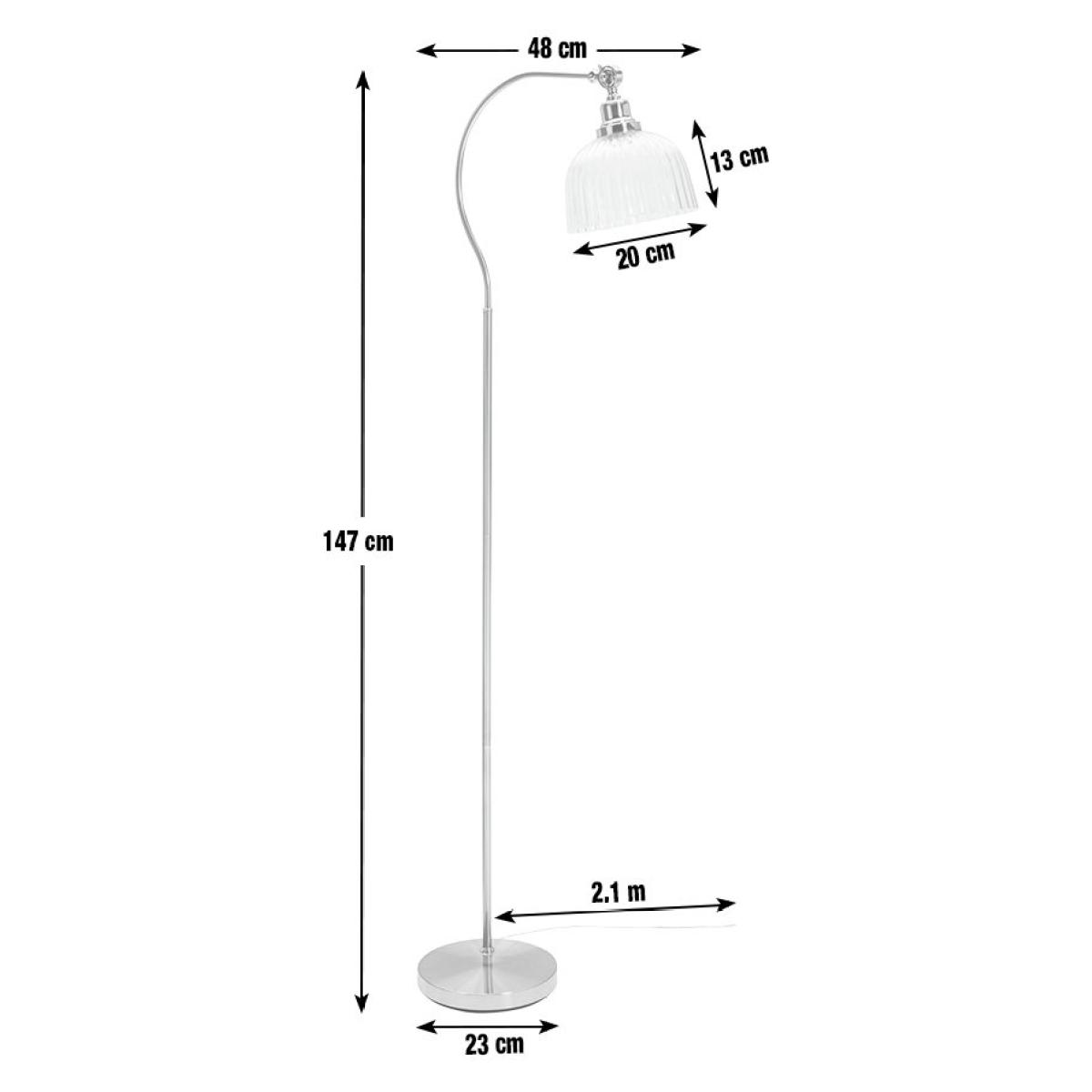 Bring some vintage looks home. Our gooseneck floor lamp offers an update on a British classic. Crafted from top to bottom in modern chrome and topped with a ribbed glass shade, it offers high-end looks. Perfect to radiate warm light just where you want it. Dimensions: Size H147, Diameter 48cm. Diameter of base 23cm. Shade size H13, D20cm. Cord length 2.1m. Bulb Information: Bulb required 1 x globe E27 edison screw LED (not included). 8 watts. LED bulb only. General Information: Push on/off switch. IP 20 - not suitable for bathroom use. Supplied assembled. Product is mains powered plug in. This lighting product is a class 2 fitting. Weight 4.9kg. Gooseneck. Manufacturer's 1 year guarantee.