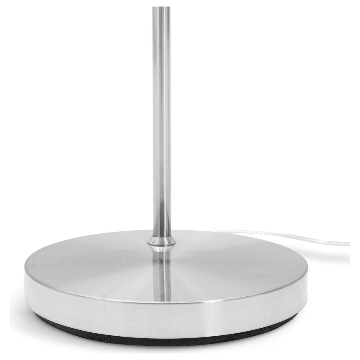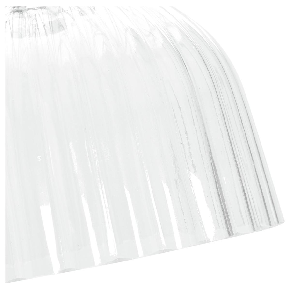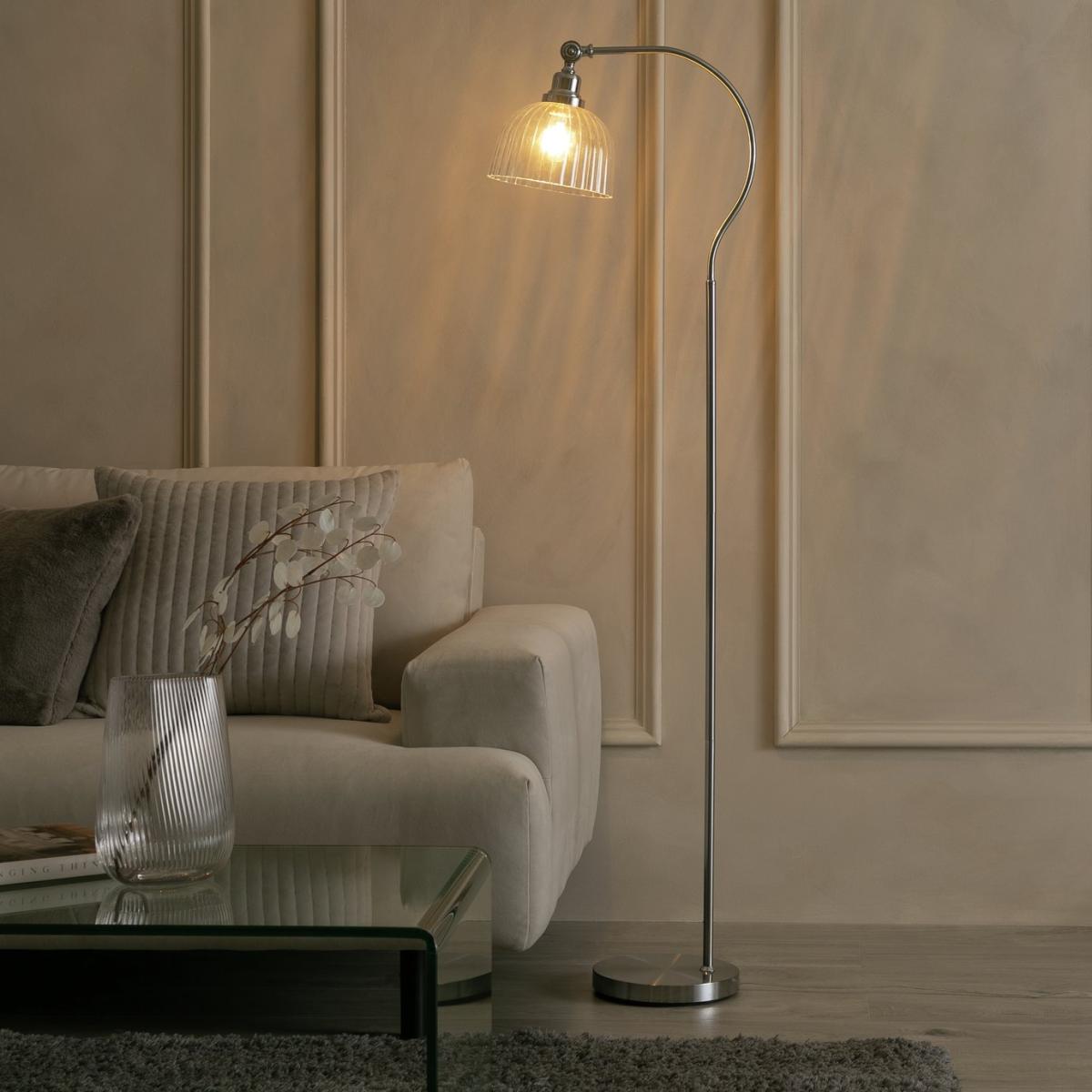 Bring some vintage looks home. Our gooseneck floor lamp offers an update on a British classic. Crafted from top to bottom in modern chrome and topped with a ribbed glass shade, it offers high-end looks. Perfect to radiate warm light just where you want it. Dimensions: Size H147, Diameter 48cm. Diameter of base 23cm. Shade size H13, D20cm. Cord length 2.1m. Bulb Information: Bulb required 1 x globe E27 edison screw LED (not included). 8 watts. LED bulb only. General Information: Push on/off switch. IP 20 - not suitable for bathroom use. Supplied assembled. Product is mains powered plug in. This lighting product is a class 2 fitting. Weight 4.9kg. Gooseneck. Manufacturer's 1 year guarantee.