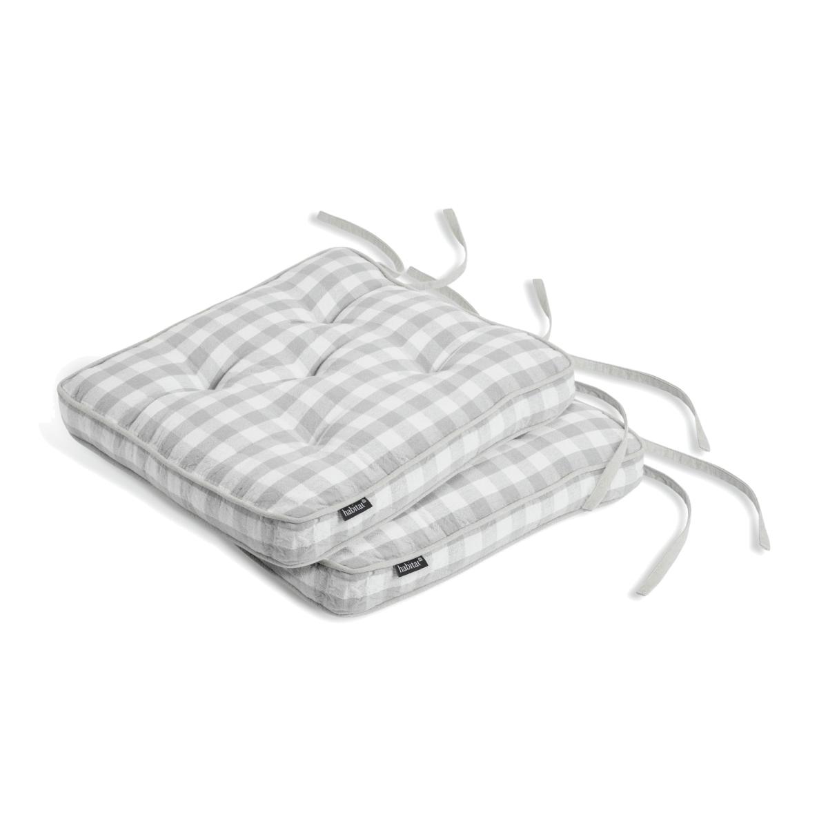Check this out. Give your chairs a smart makeover with our pair of gingham seat cushions. In light grey, they've got that fresh look with an added layer of comfort. Just tie them on and you're set. As easy as that. Cotton cover. Recycled polyester filling. Secured by ties. Size L40, W40cm. Wipe clean. Manufacturer's 1 year guarantee.