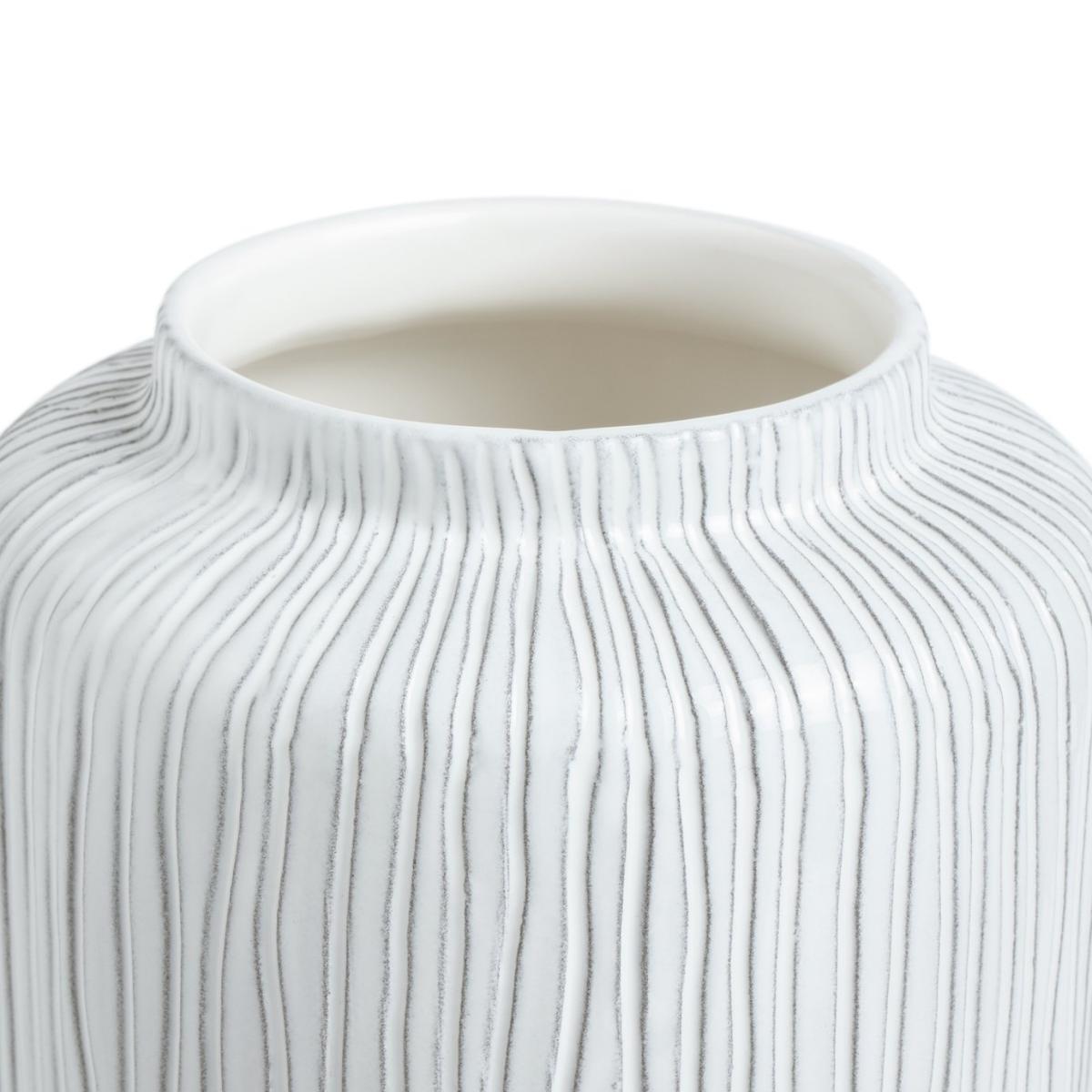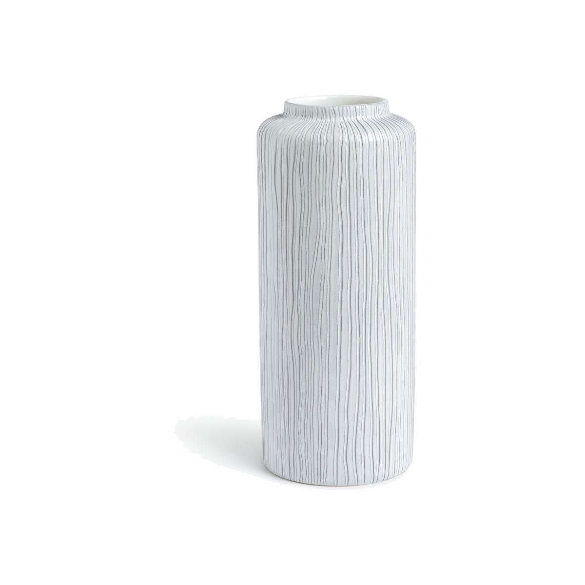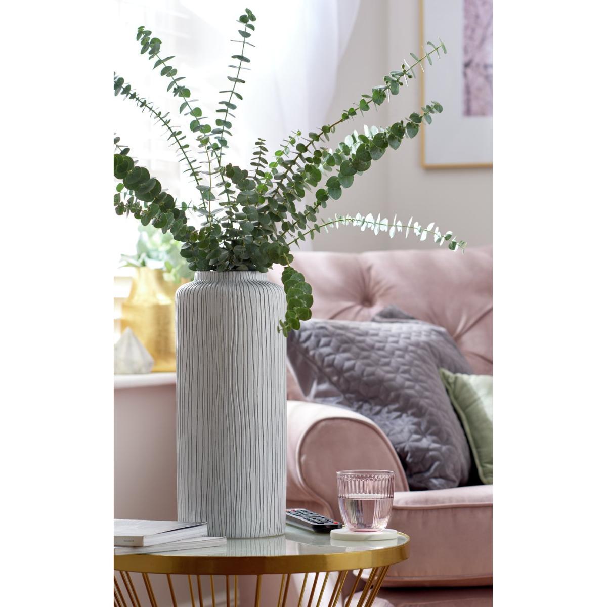Perfect for posies. With its decorative cylindrical design our grey earthenware vase brings natural style to your space. A striking centrepiece to your kitchen, console or side table. Subtle asymmetric line detailing adds textural interest to its understated, organic look. Lovely on its own or filled to the brim with fresh or dried flowers. A refreshing choice.
