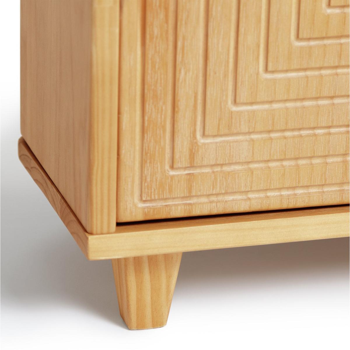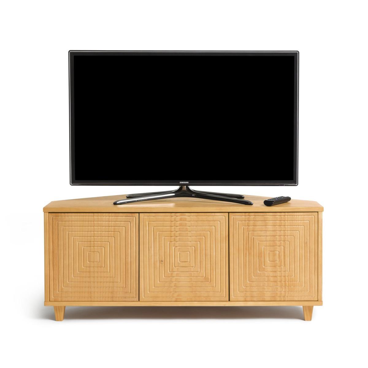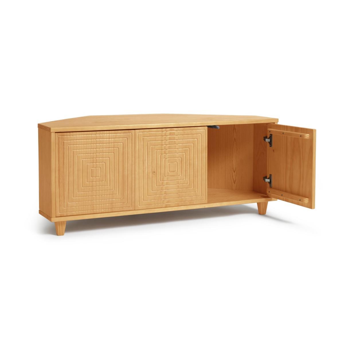Star performer! Showcase your TV on this super stylish entertainment unit. Built to take up to 40g in weight yet fit neatly into a corner of the room. The 3 streamlined cupboard doors feature a handsome groove design carved into the pine wood finish. Natural and neutral, it complements any country or Skandi decor. Behind the doors is plenty of space for a docking station, games console and all those box sets.
