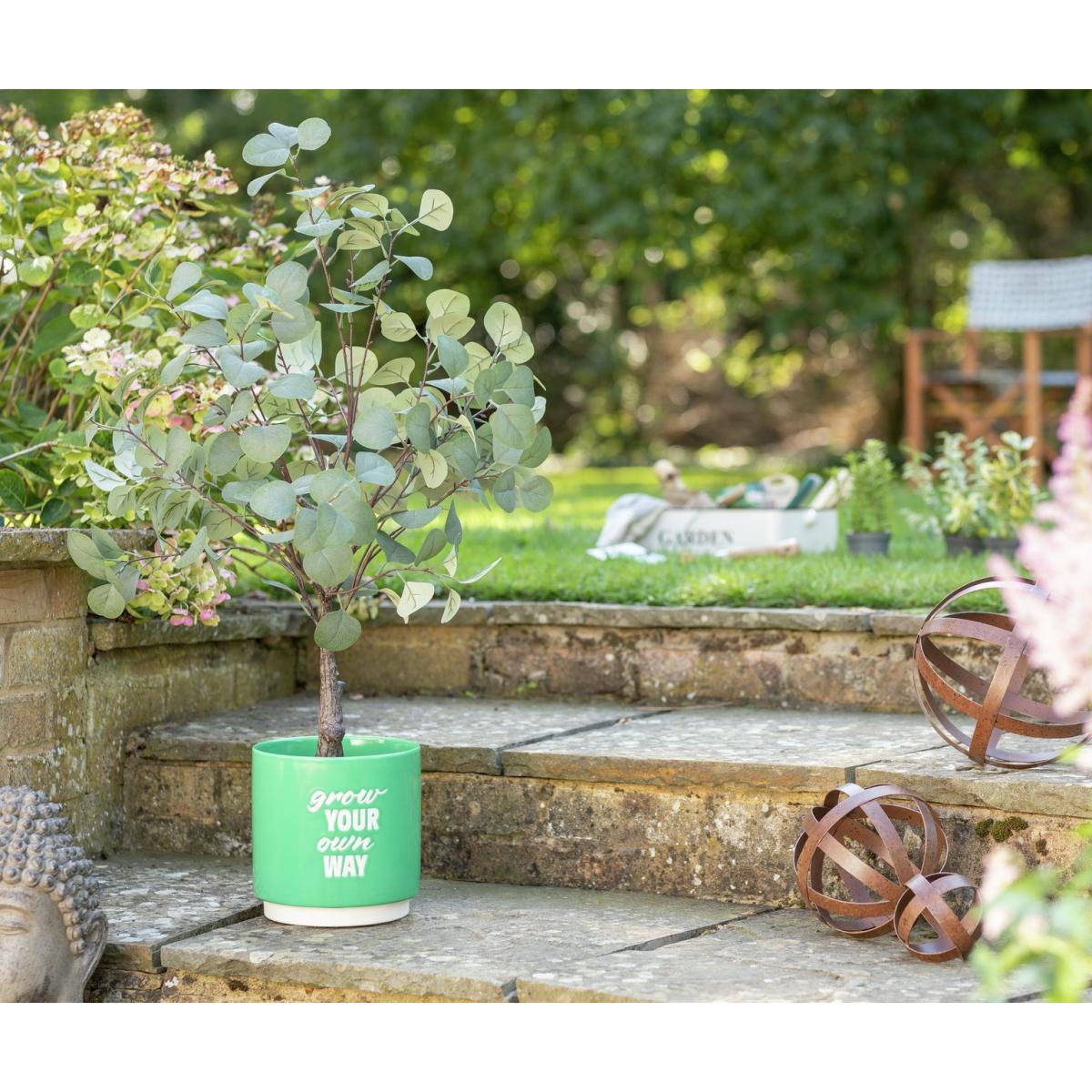 I love this ceramic pot for its clean, contemporary look and fun message, making it a versatile addition to a variety of interiors. Its bright green colour works particularly well in modern, minimalist, or Scandinavian schemes, bringing a pop of colour without overwhelming the space. It's excellent for both indoors and outdoor patios, and works well when paired with lush, vibrant greenery like ferns, succulents, or herbs. Practical styling tips include stacking it with other monochrome planters for a layered effect, or placing it on a simple woven mat or tray to give it some grounding. Its playful message adds character and personality, making it perfect for kitchens, desks, or bright corner displays.