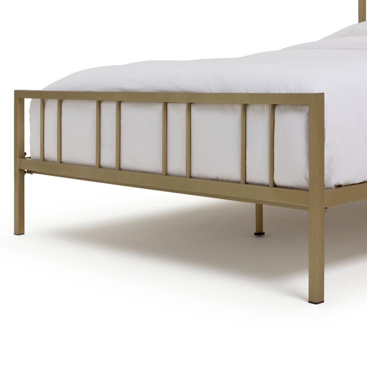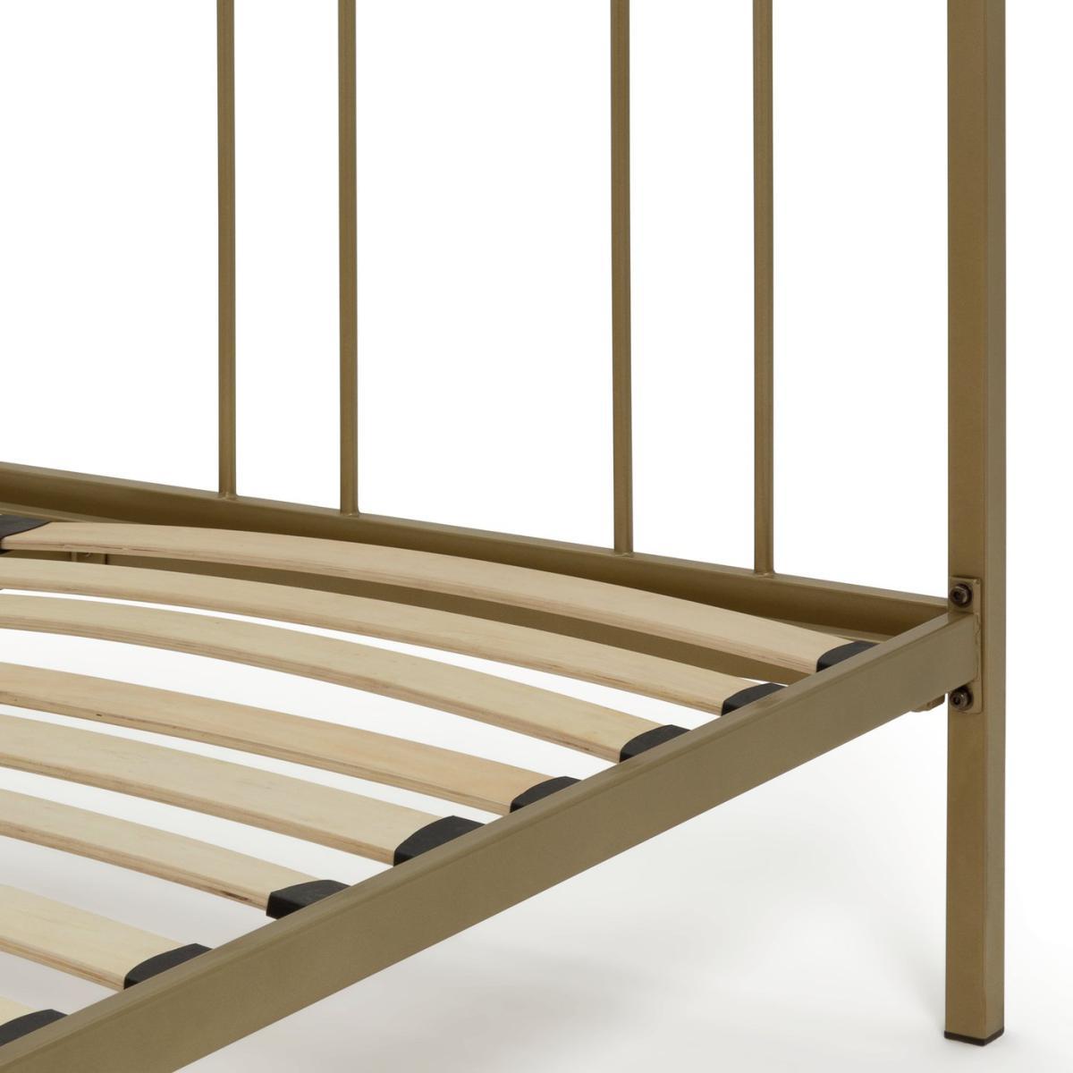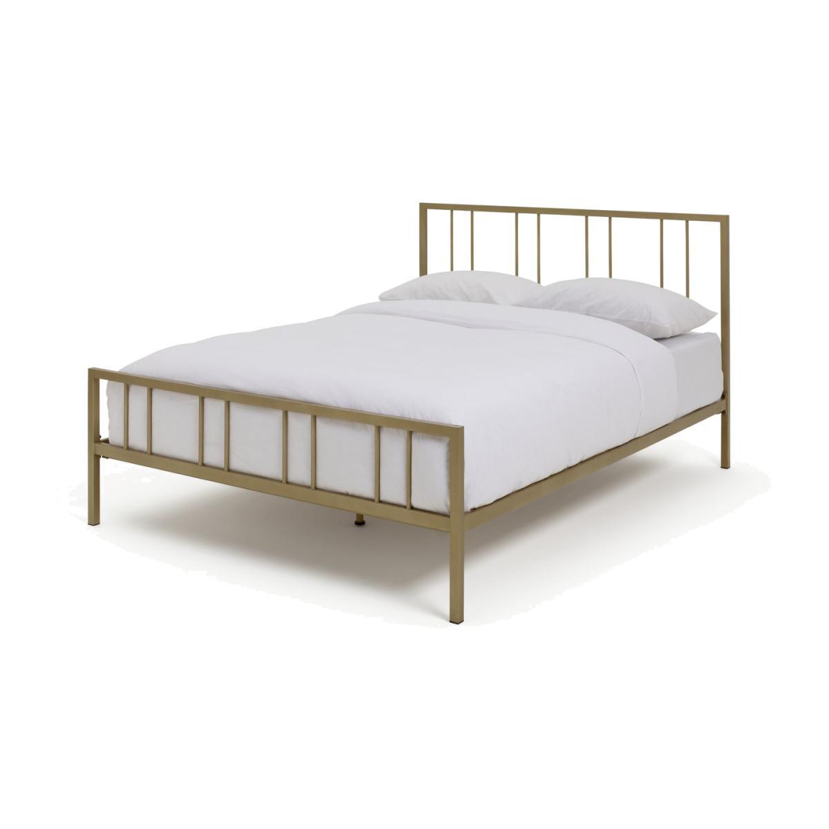 Sweet dreams are made of this. Our kingsize bed frame in gold metal is super simple but with a touch of glamour. It's ideal for a guest bedroom or a teenager who loves a bit of pizzazz. Dress it up with rich velvety throws or soften it with a pretty pastel duvet, this bed loves them all. The strong and sturdy frame has wooden slats to support your mattress. And here's a bonus, there's plenty of space underneath for extra storage. Just pop a big, bouncy mattress on top. Marvellous. Building your dream bedroom? Browse our collection and snuggle in. Part of the Halo collection. Metal frame. Base with wooden slats. Size W156, L207, H105cm. Height to top of siderail 30cm. 29cm clearance between floor and underside of bed. Drawer size H105, W156, D207cm. Weight 32.5kg. Maximum user weight 140kg. Self-assembly - 2 people recommended. Package Dimensions:Package 1 dimensions: H9, W111.5, D163cm. Package 1 weight: 23.8kg. Package 2 dimensions: H11, W11, D209cm. Package 2 weight: 8.7kg. General Information:Manufacturer's 2 year guarantee.