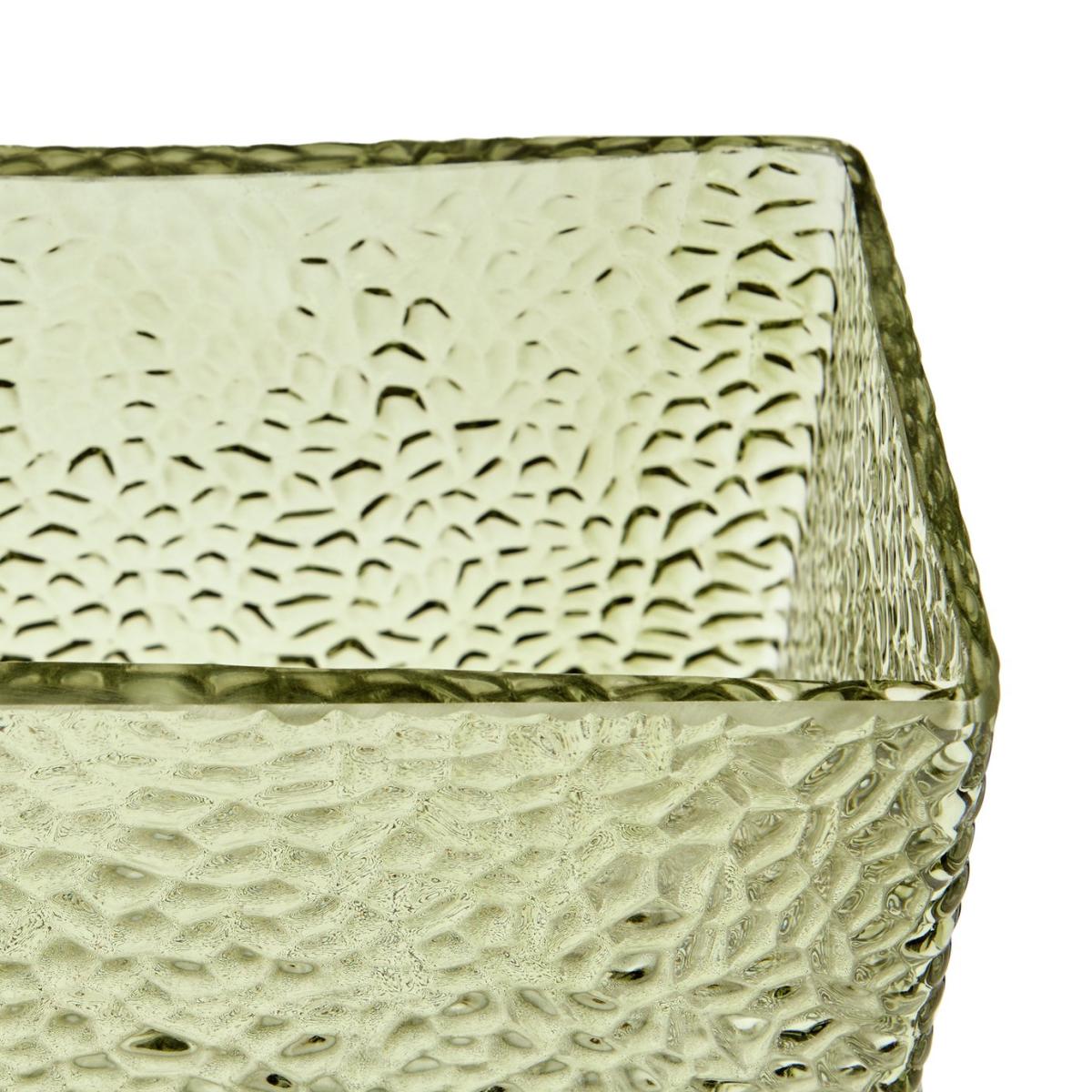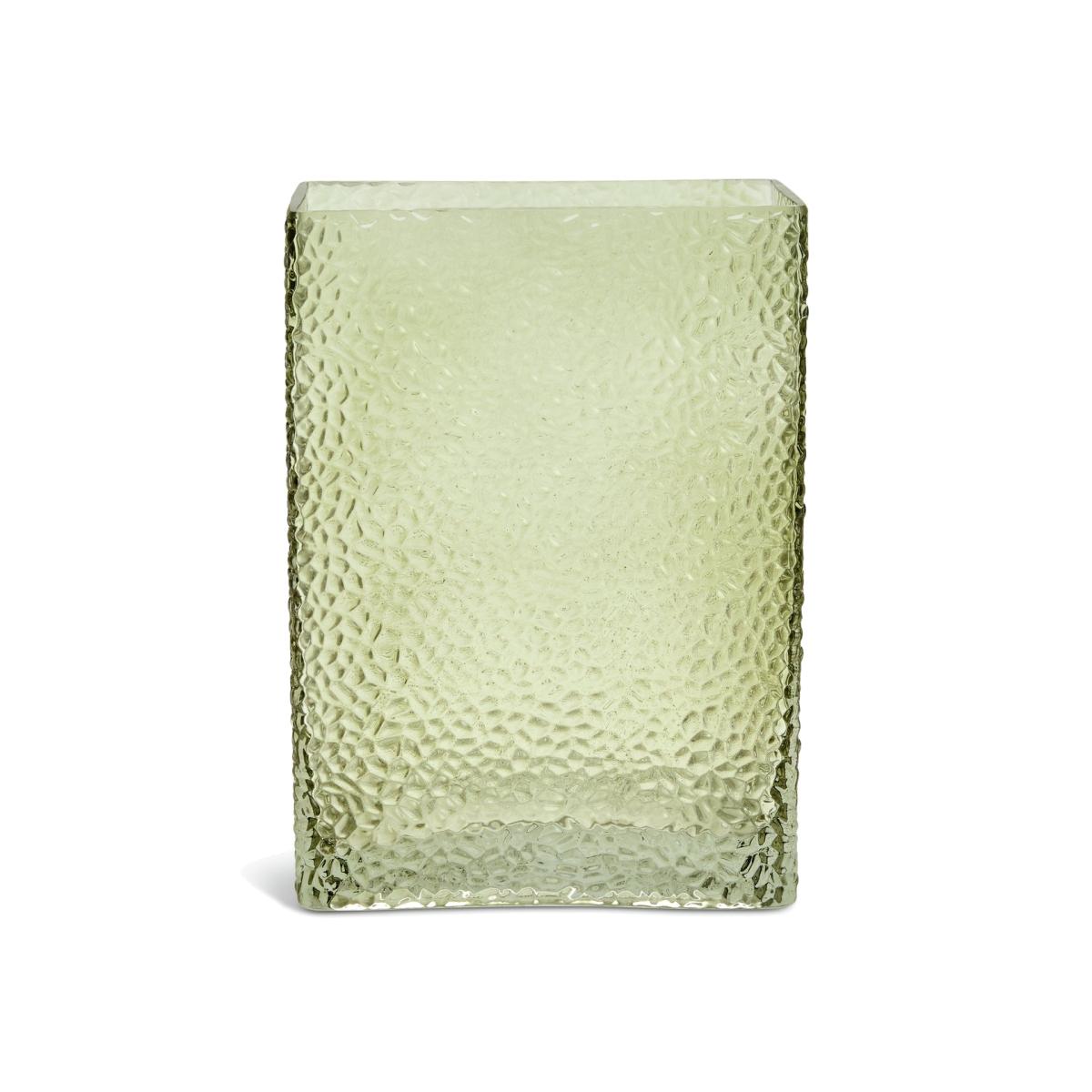 This hammered green glass vase is beautifully textured. We love the way the raised bubbles bounce light around within its rectangular silhouette. Whether you add a simple sprig or a cluster of blooms it will elevate any display. Size H28.3, W16, D16cm.