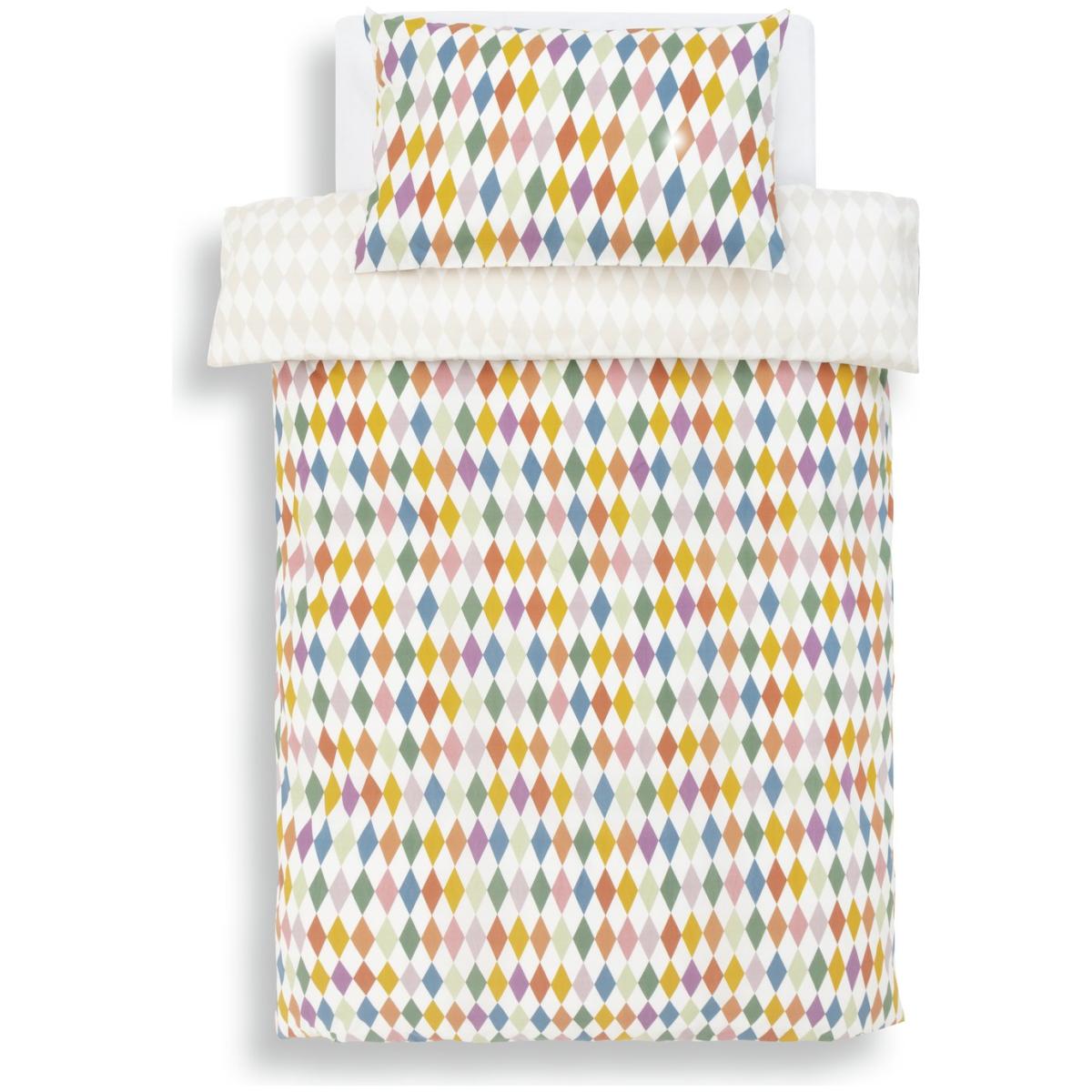 Hooray for Harlequin. Looking for colourful kids bedding that's not over cutesy? This is ideal. This single duvet cover and matching pillowcase has a vibrant, fun design with a subtle, storybook feel. This item carries the STANDARD 100 by OEKO-TEX logo, which means you can be certain that every component has been tested for harmful substances and is therefore harmless to human health. Set comprises of 1 duvet cover and 2 pillowcases. Multicoloured Color full printed boxes pattern. Finish: woven. Size L200 x W135cm. Pillow case length 75cm, Width 50cm. Standard pillowcase (s). Reversible pillowcase (s). Reversible. Buttons for fastening. Machine washable at 40 C. Suitable for tumble drying. 100% polycotton. percale.