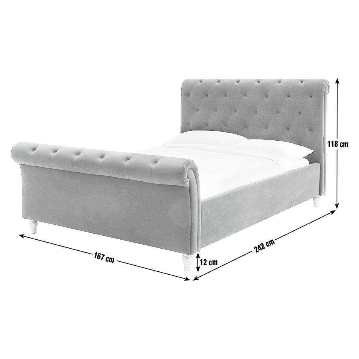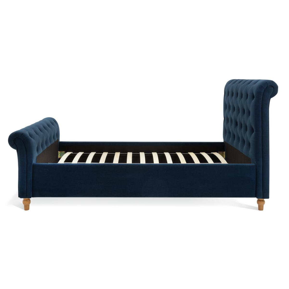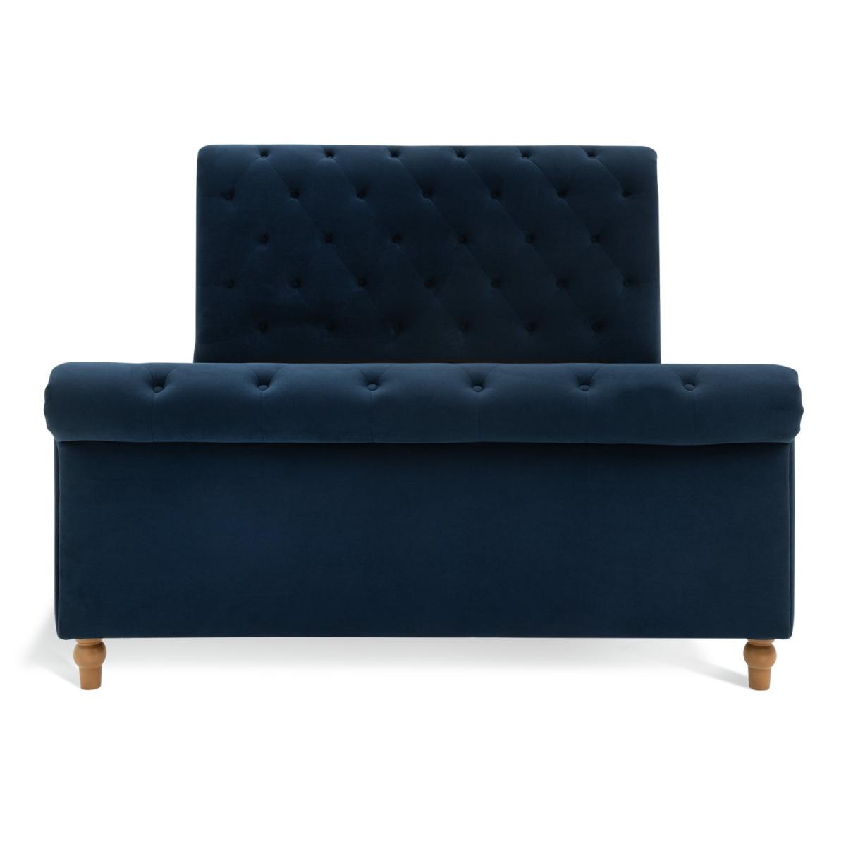 Turn up the dial on bedroom luxury. Our Harrogate sleigh bed frame will help transform your bedroom into an opulent sleep sanctuary. Upholstered by hand in elegant navy velvet, with a deeply padded, buttoned scroll head and footboard and set on classic wood turned legs. An elegant bed in a timeless design. Set on sprung wooden slats that give your mattress the support it needs while providing ample aeration. A very warm and sumptuous velvet, multiple colors available. Part of the Harrogate collection. Fabric frame. Velvet fabric - 100% polyester. Wooden feet. Base with sprung wooden slats. Size W167, L242, H118cm. Height to top of siderail 42cm. 12cm clearance between floor and underside of bed. Weight 69.7kg. Total maximum user weight 220kg. Self-assembly - 2 people recommended. Package Dimensions: Package 1 dimensions: H20.5, W156, D115cm. Package 1 weight: 29.5kg. Package 2 dimensions: H20, W156, D61cm. Package 2 weight: 18.5kg. Package 3 dimensions: H14.5, W210.5, D34cm. Package 3 weight: 21.7kg. General Information: We are excited to be welcoming some of our favourite HOME products into the Habitat range. Your product may arrive in Habitat or HOME packaging. Manufacturer's 1 year guarantee. FSC certified meaning the materials used for this product are responsibly sourced.