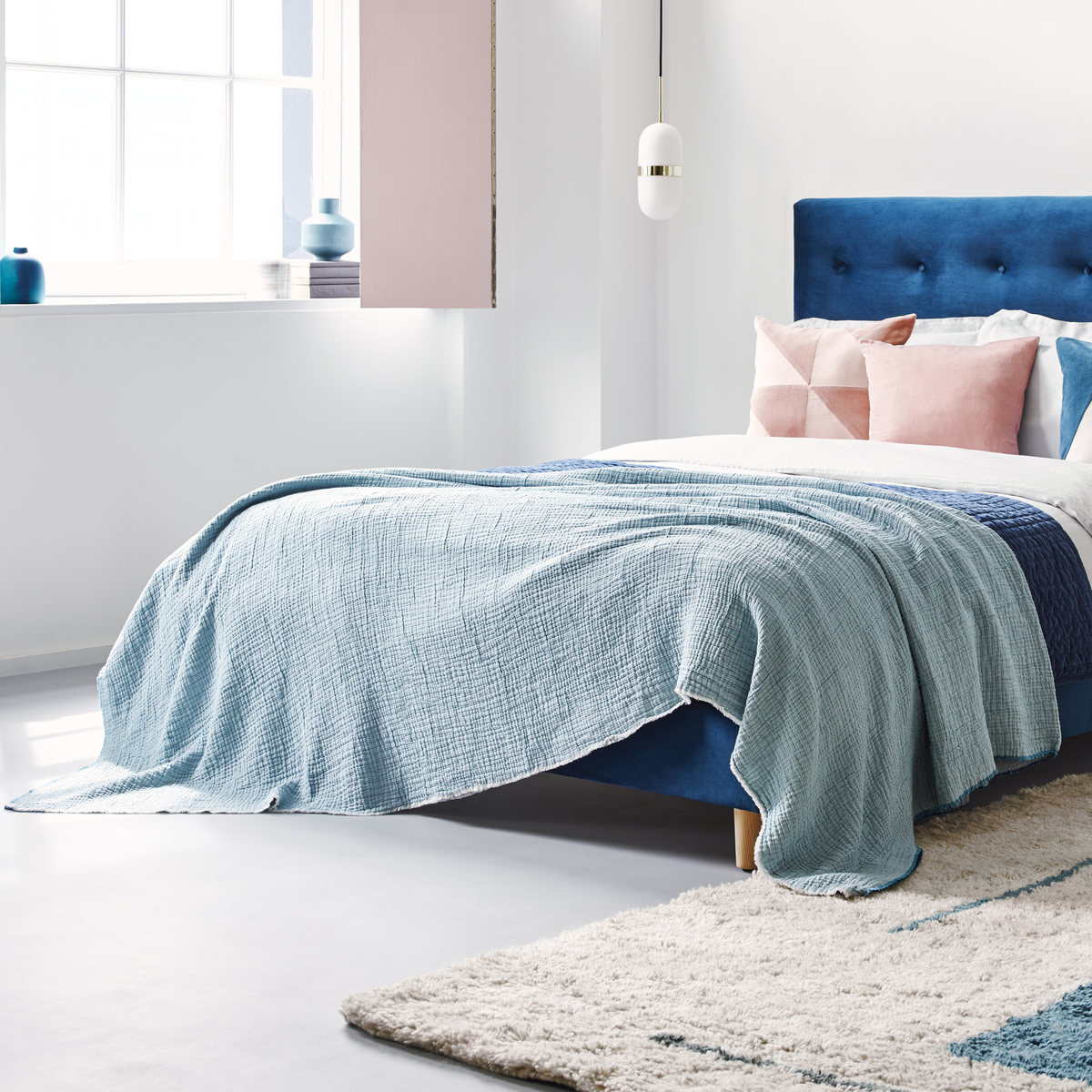 I love this bed for adding a pop of colour and a touch of elegance to both modern and eclectic interiors. The rich blue velvet provides a luxurious feel, making it a standout piece without overwhelming the space. It works particularly well in bedrooms with neutral palettes, where it can serve as the focal point, or in rooms with a bohemian vibe where layered textures and colours are embraced. To style around it, consider keeping bedding simple with crisp whites or soft greys, and add decorative cushions in complementary shades or metallics for dimension. Its understated wooden legs also make it versatile enough to pair with both mid-century modern and contemporary furniture styles.