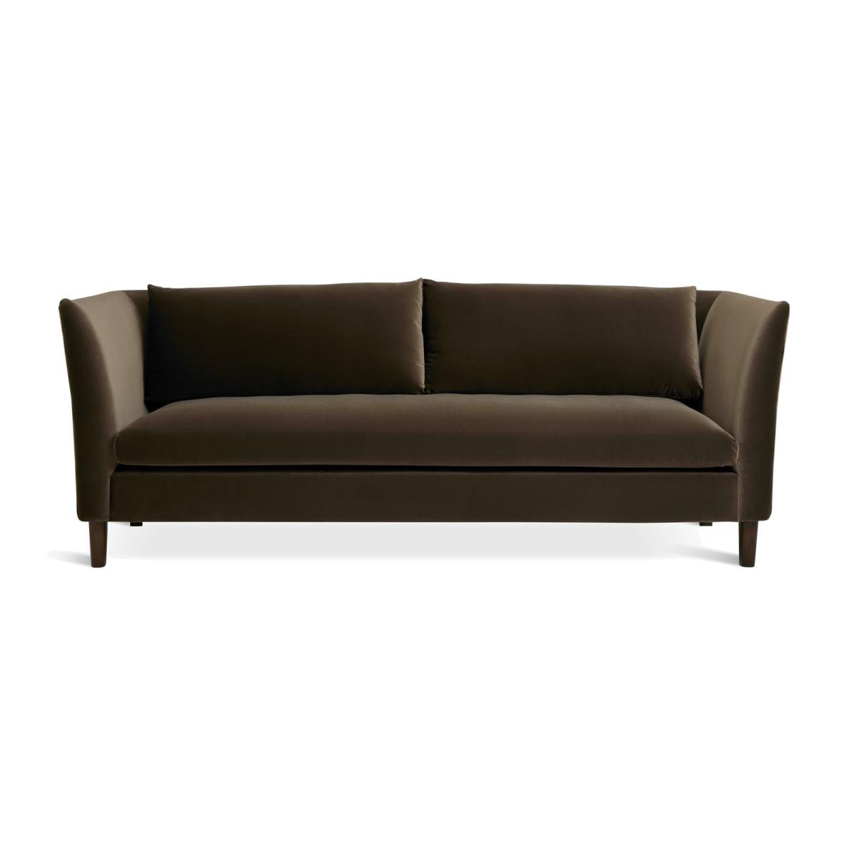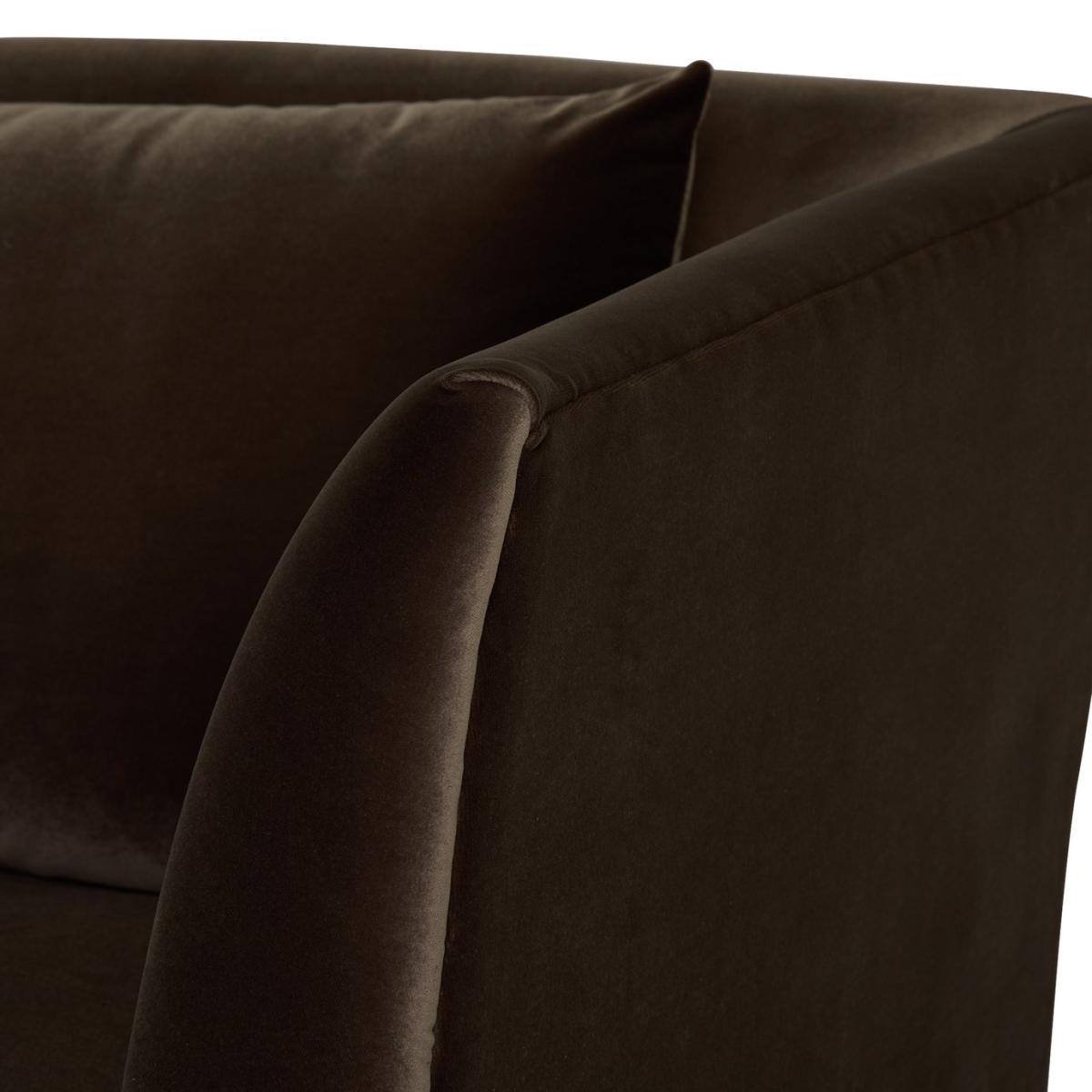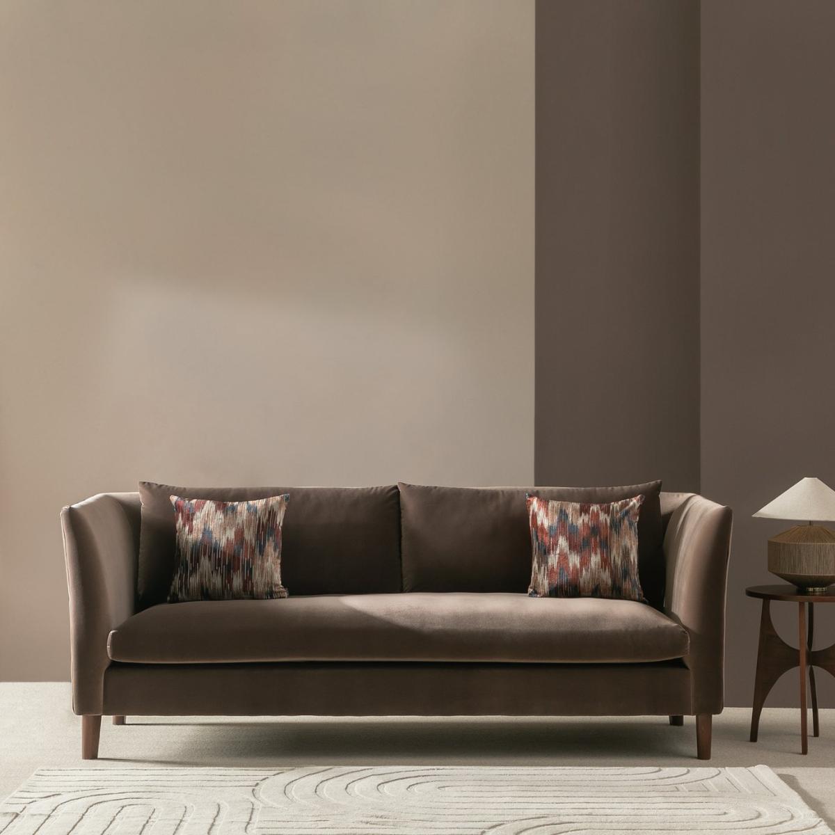 Hawley is a rich brown velvet sofa that stands out from the crowd. Borrowing from art deco design it has curves in all the right places. Two loose cushions lean on the sweeping contours of the one-piece backrest. Combine that with the fixed seat and you've a comfy and supportive 3-seater sofa. Beneath the gentle base, dark wooden feet seal its luxurious looks. Part of the Hawley collection. Material: Made from 100% polyester. Wooden feet - walnut. Soft seat cushions. Removable seats with foam filling. Removable cushion(s) with fibre filling. Free fabric swatch available on this line. Dimensions: Size H83, W226, D93cm. Floor to seat height: 48cm. Depth of seat: 55.6cm. Height of seat back: 72cm. Width of seating area between arms: 189cm. Height of arm rest: 83cm. Weight: 54kg. Packaged dimensions: Package size H72, W228, D95cm. General information: FSC certified meaning the materials used for this product are responsibly sourced. Wipe clean. Plump cushions regularly to maintain shape. Self-assembly - just add feet. Maximum individual user weight: 110kg. Manufacturer's 10 year frame guarantee.