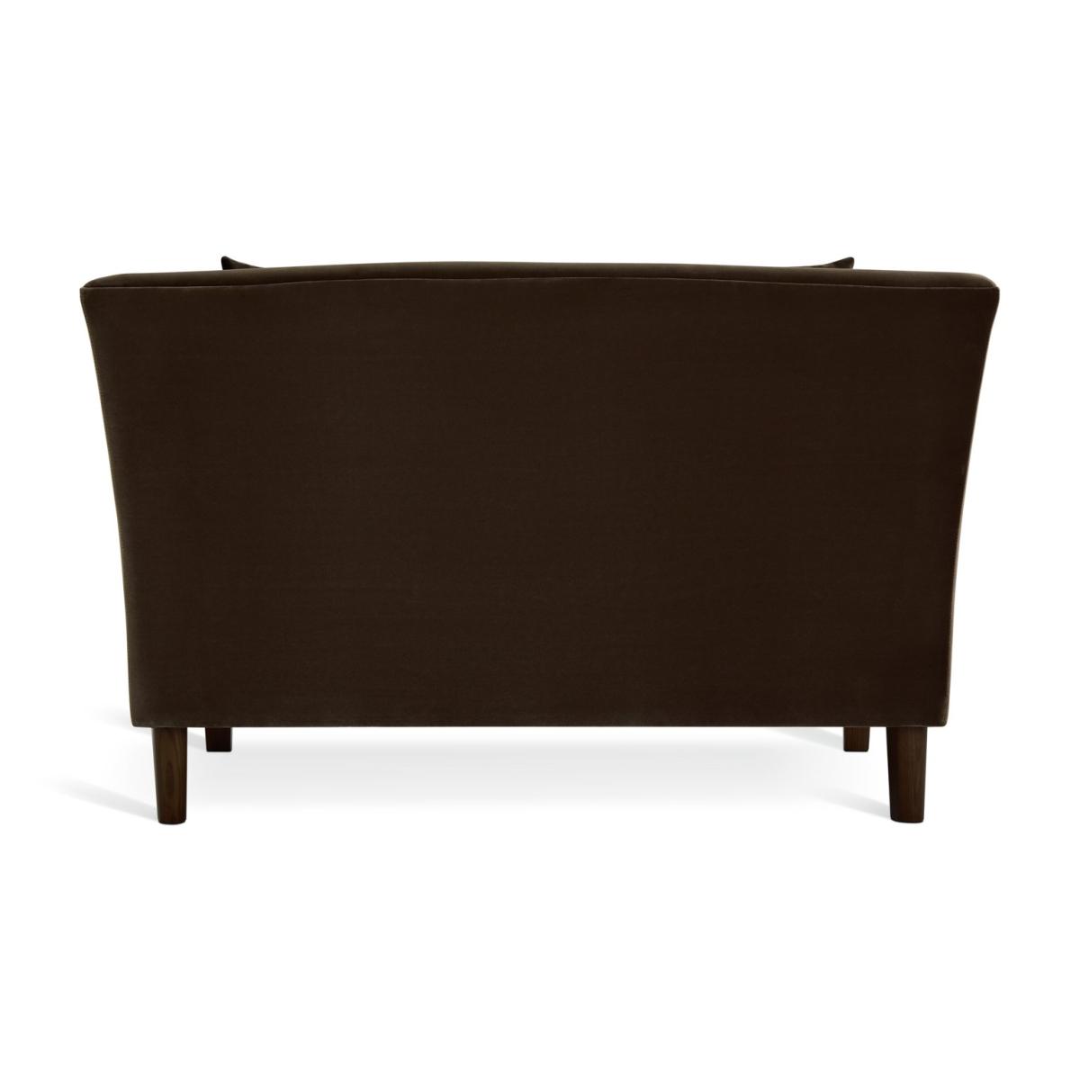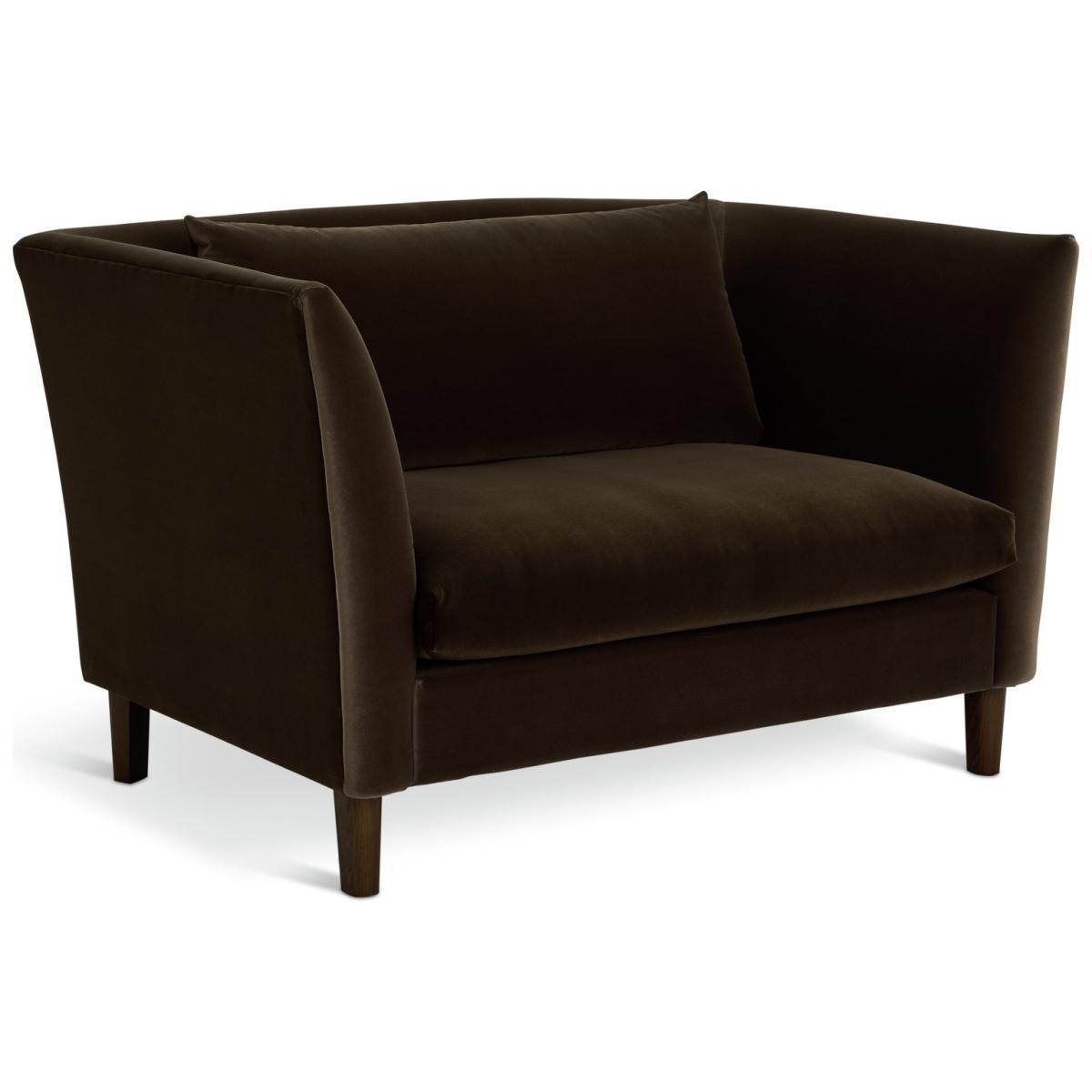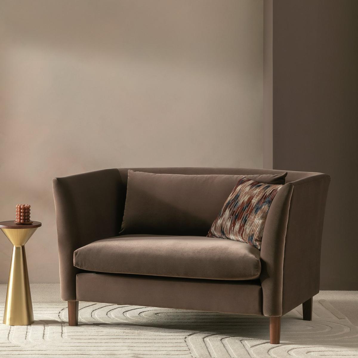 Hawley is a rich brown velvet cuddle chair that stands out from the crowd. Borrowing from art deco design it has curves in all the right places. A loose back cushion leans on the contoured one-piece backrest. Combine that with the fixed seats and you've comfy and supportive sitting. Beneath the gentle base, dark wooden feet seal its luxurious looks. Part of the Hawley collection. Material: Made from 100% polyester. Wooden feet. Removable seat with foam and fibre filling. Removable cushion(s) with fibre filling. Free fabric swatch available on this line. Dimensions: Size H83, W135, D93cm. Floor to seat height: 48cm. Depth of seat: 55.6cm. Height of seat back: 72cm. Width of seating area between arms: 100cm. Height of arm rest: 83cm. Weight: 31.3kg. Packaged dimensions: Package size H72, W137, D95cm. General information: FSC certified meaning the materials used for this product are responsibly sourced. Wipe clean. Plump cushions regularly to maintain shape. Self-assembly - just add feet. Maximum individual user weight 110kg. Manufacturer's 10 year frame guarantee.