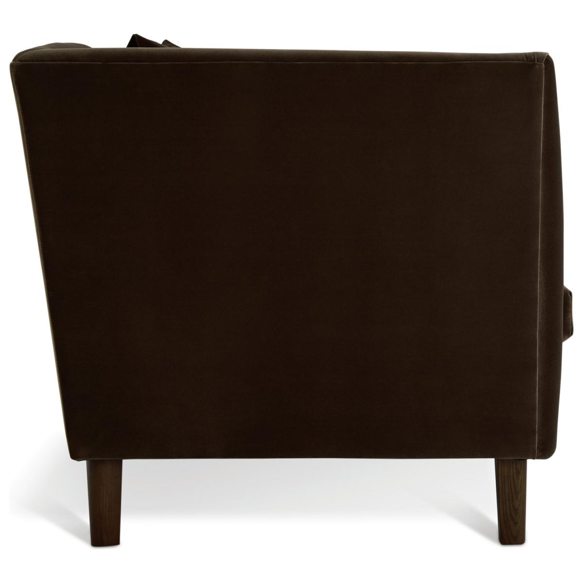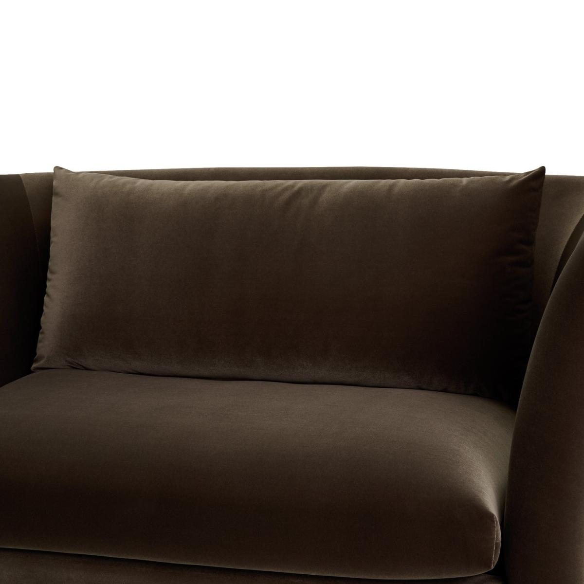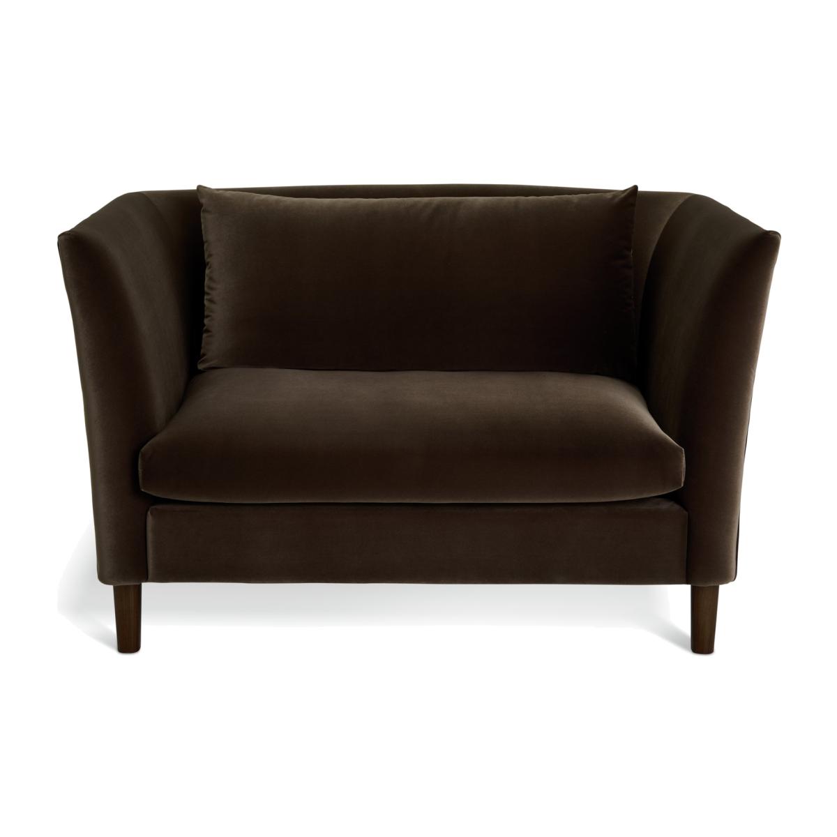 Hawley is a rich brown velvet cuddle chair that stands out from the crowd. Borrowing from art deco design it has curves in all the right places. A loose back cushion leans on the contoured one-piece backrest. Combine that with the fixed seats and you've comfy and supportive sitting. Beneath the gentle base, dark wooden feet seal its luxurious looks. Part of the Hawley collection. Material: Made from 100% polyester. Wooden feet. Removable seat with foam and fibre filling. Removable cushion(s) with fibre filling. Free fabric swatch available on this line. Dimensions: Size H83, W135, D93cm. Floor to seat height: 48cm. Depth of seat: 55.6cm. Height of seat back: 72cm. Width of seating area between arms: 100cm. Height of arm rest: 83cm. Weight: 31.3kg. Packaged dimensions: Package size H72, W137, D95cm. General information: FSC certified meaning the materials used for this product are responsibly sourced. Wipe clean. Plump cushions regularly to maintain shape. Self-assembly - just add feet. Maximum individual user weight 110kg. Manufacturer's 10 year frame guarantee.