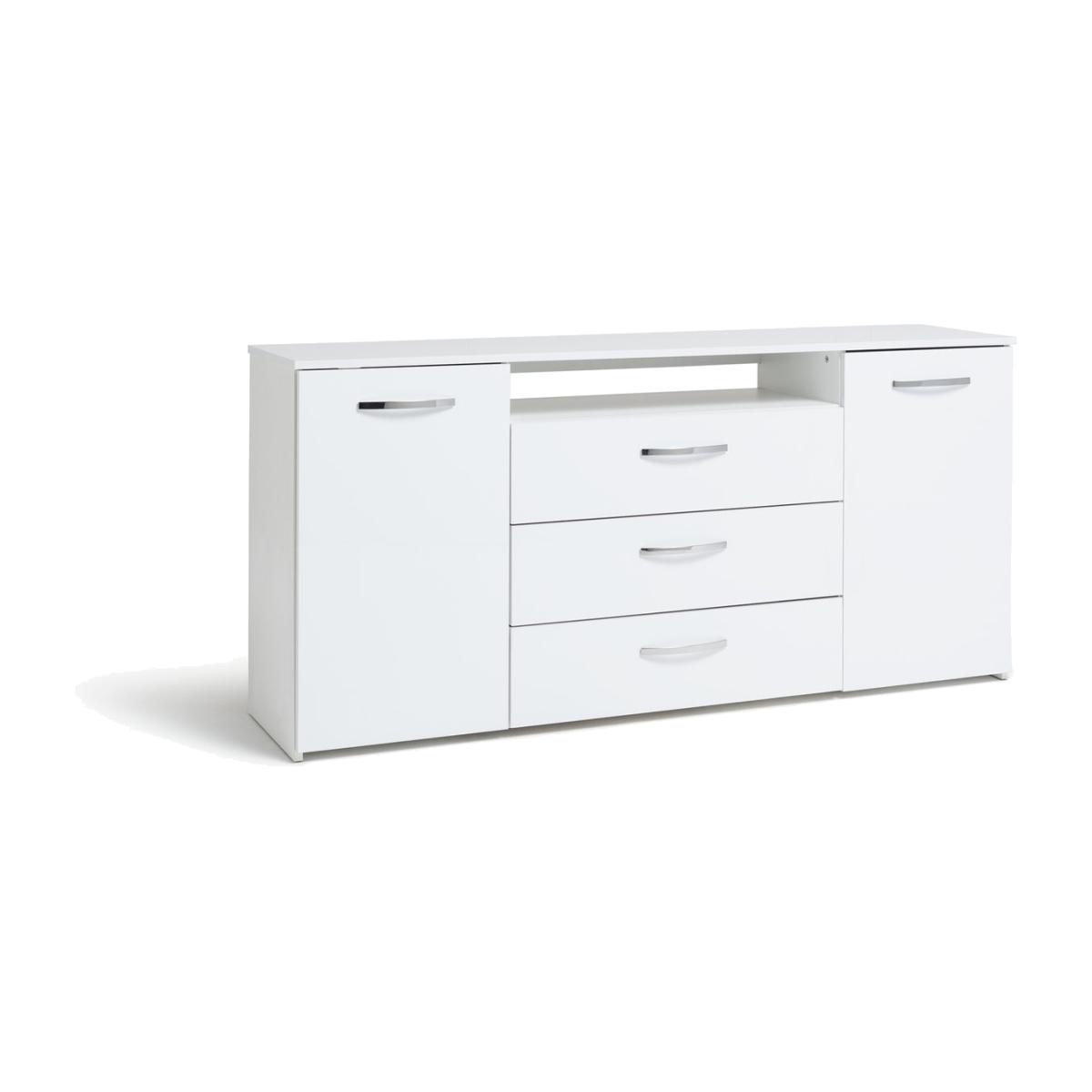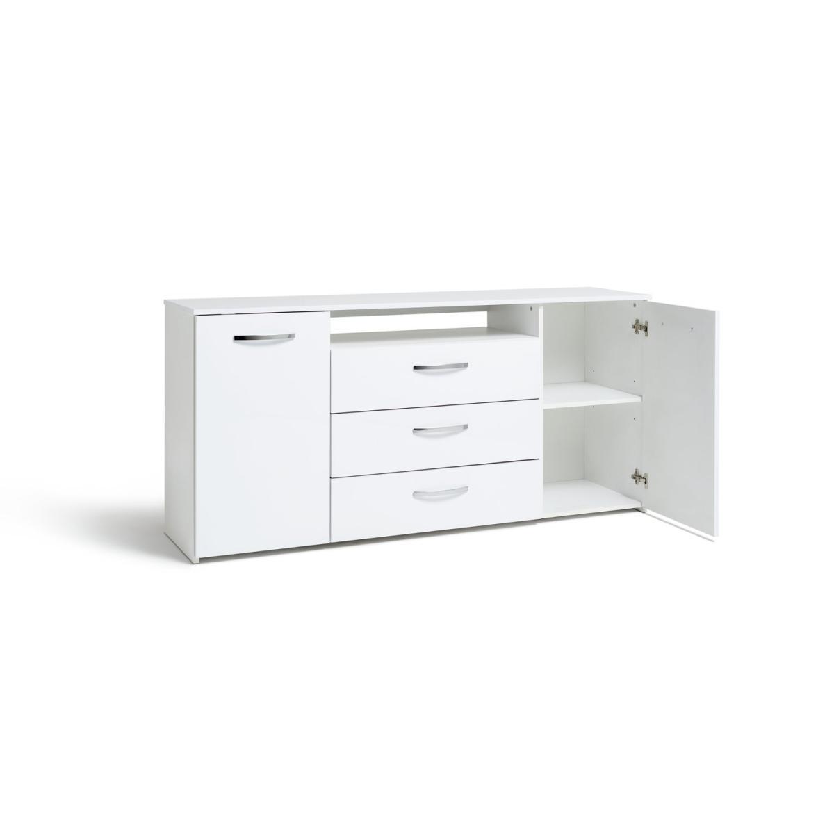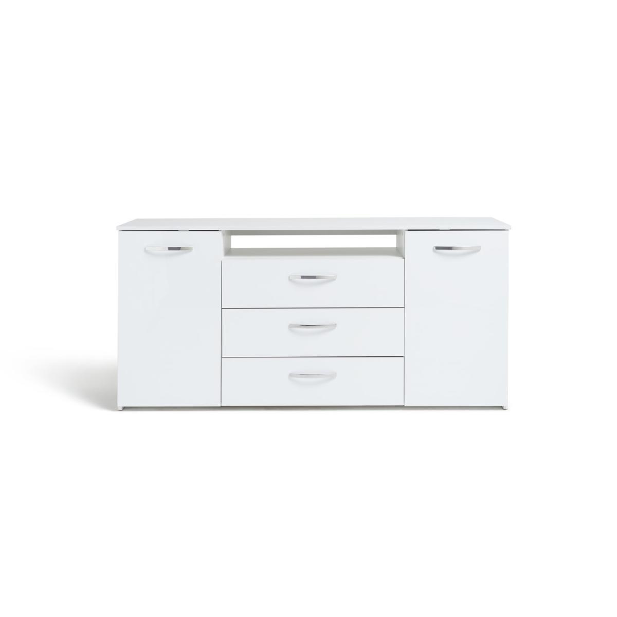 This large sideboard is perfect for contemporary homes. Ideal for use as a TV unit, the open console shelf provides easy cable access around the back for a clean and tidy look. With 3 easy-glide drawers, 2 cupboards and adjustable shelving within, this modern unit gives you plenty of storage to tuck games, DVDs and spare leads out of sight. Finished in a smooth gloss, each drawer and door is finished with a contrasting chrome handle.