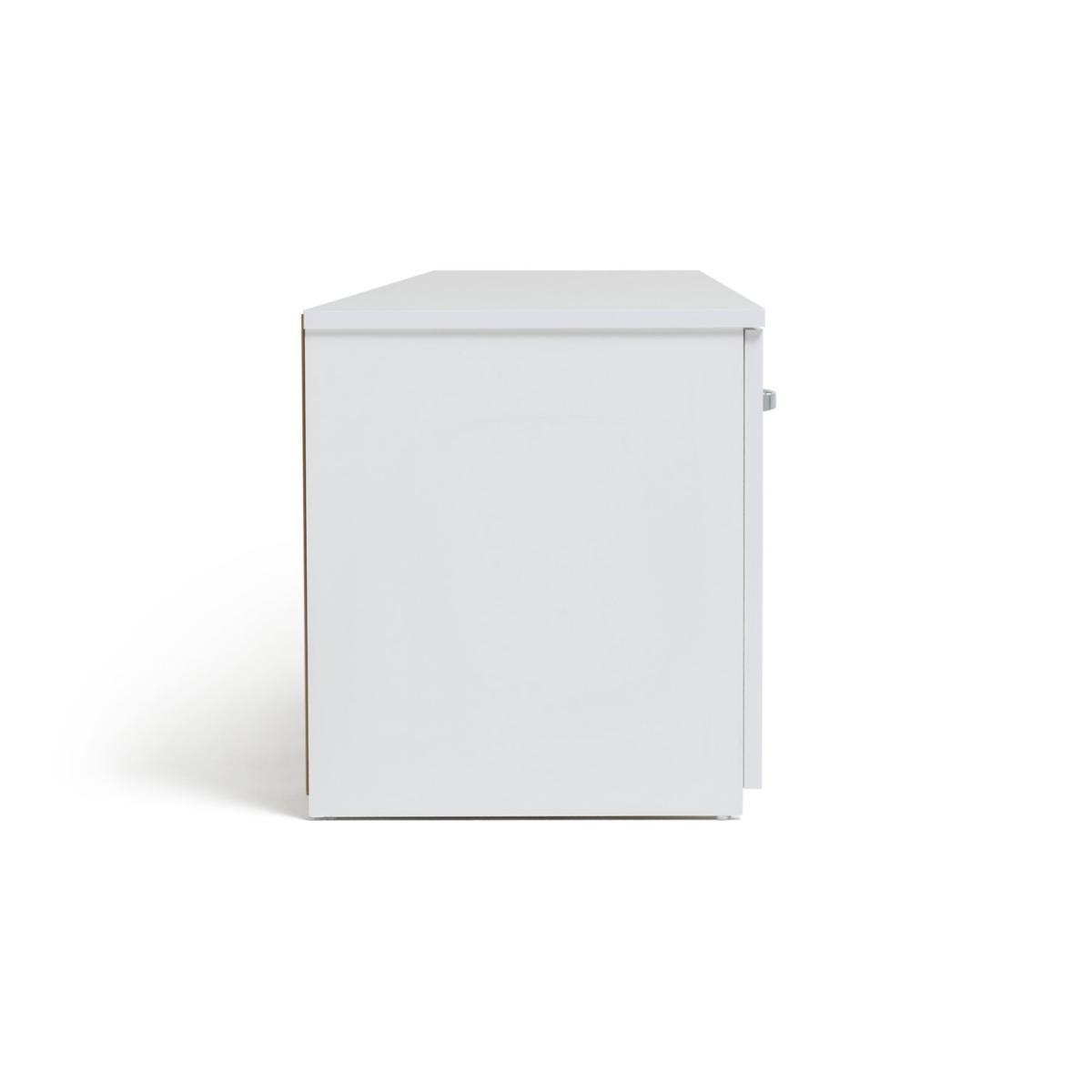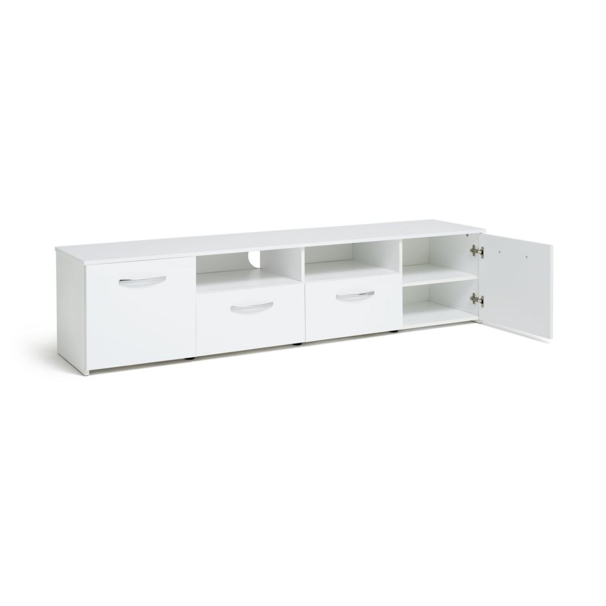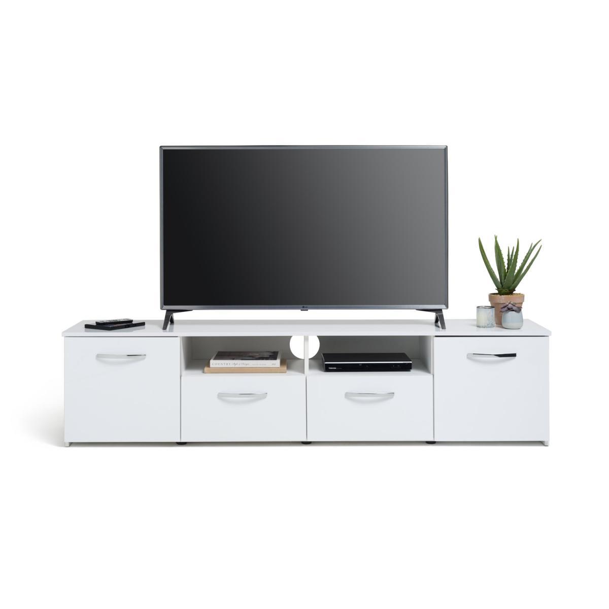 Sleek, smart and smooth. The Habitat Hayward collection's gloss finish makes it a fresh and fashionable choice. This extra wide TV stand lives to serve. With open shelving in the centre, you can get your TV box and games console set up in no time. Bit of a television connoisseur? No problem. Those of us that love a big screen will be happy to know that this stand can hold a TV of up to 75 inches. Keep clutter at bay with the two cupboards either side. Its finished with bow handles in a chrome shine. Perfectly polished.