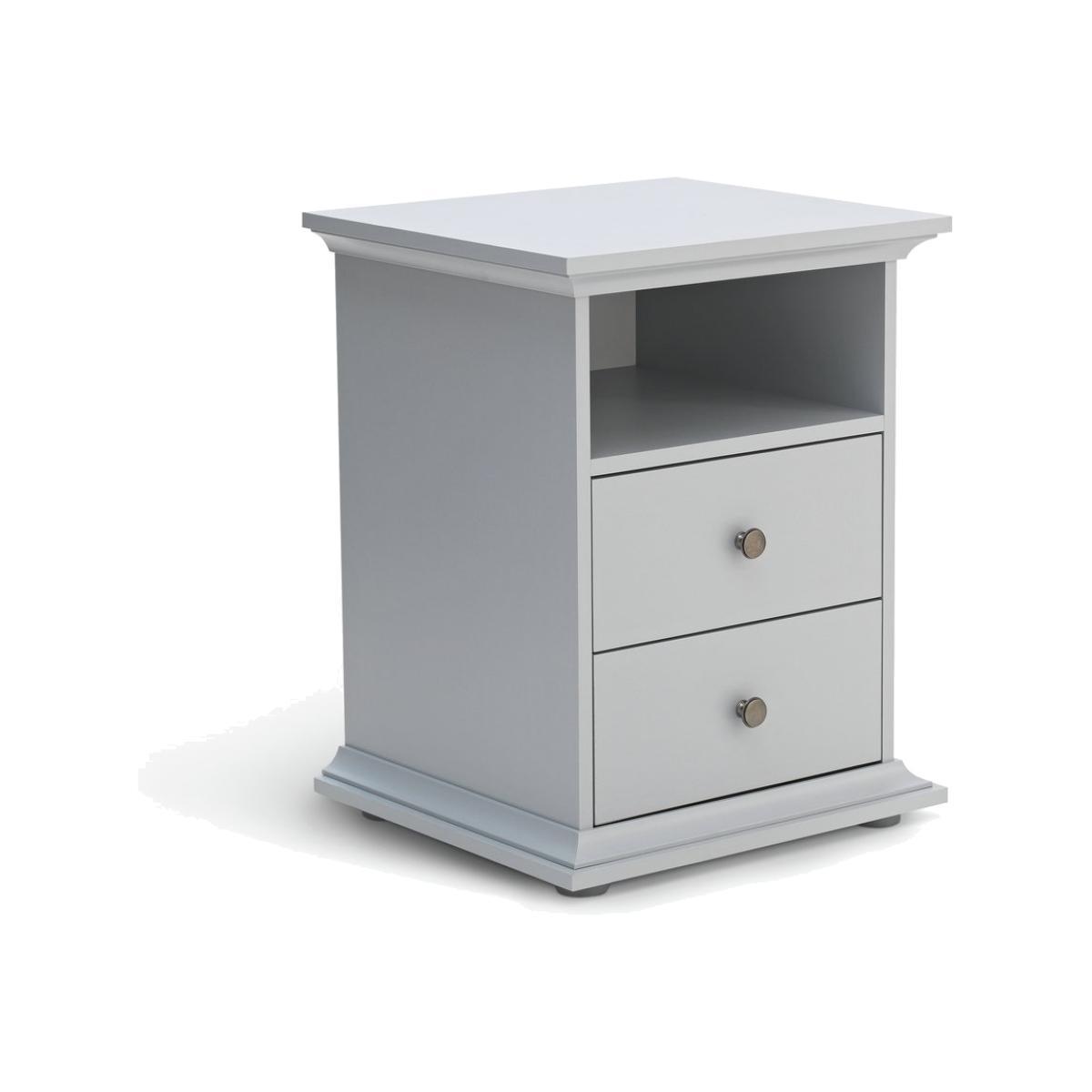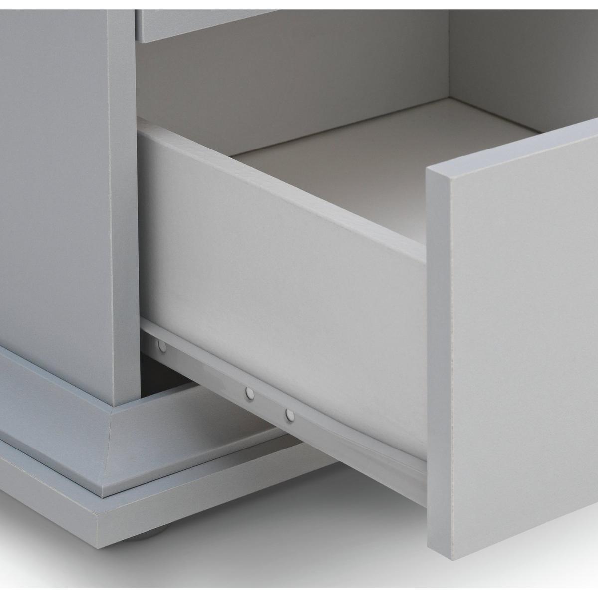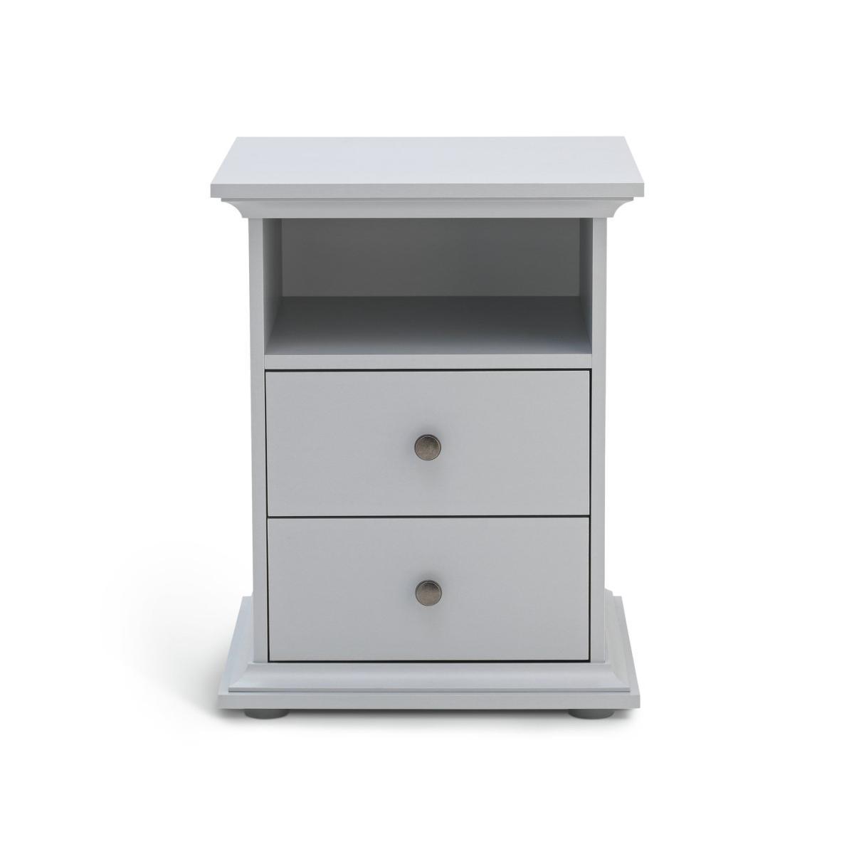 Dress your bed with this charming bedside cabinet. It's a fabulous way to add style to your bedside and so practical too. With 2 drawers for you to hide away those bedtime essentials, plus a cubbyhole for books and magazines. Plinth and cornice detailing, gunmetal handles, and a soft grey matte finish, create a classic design with modern style. Pair with matching table lamps for the perfect finishing touch. Nighty night.
