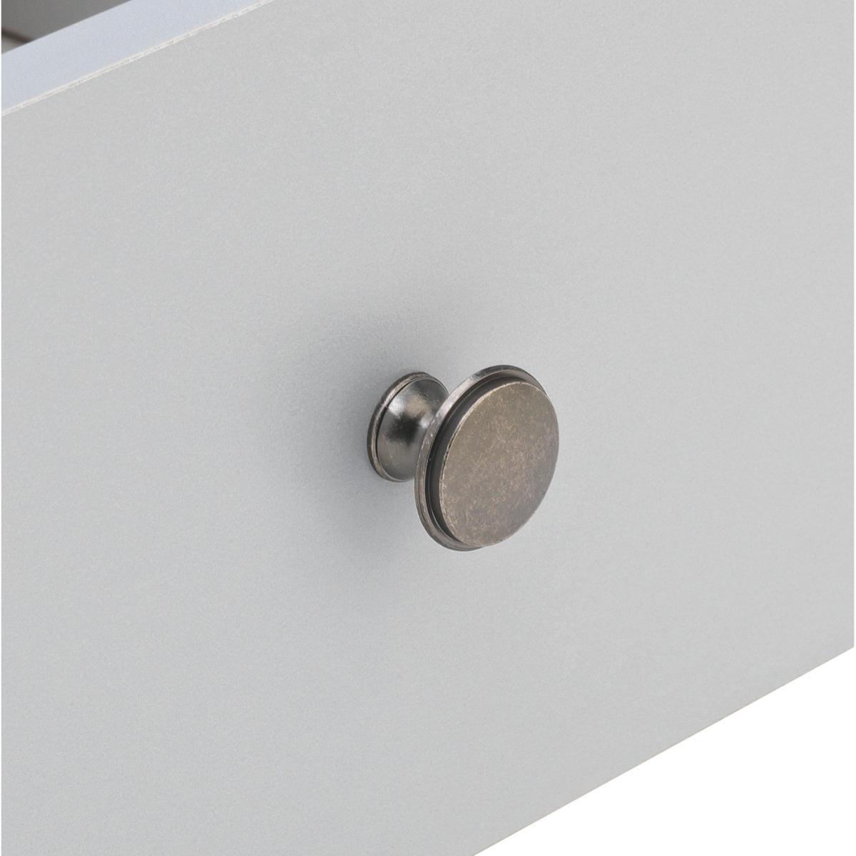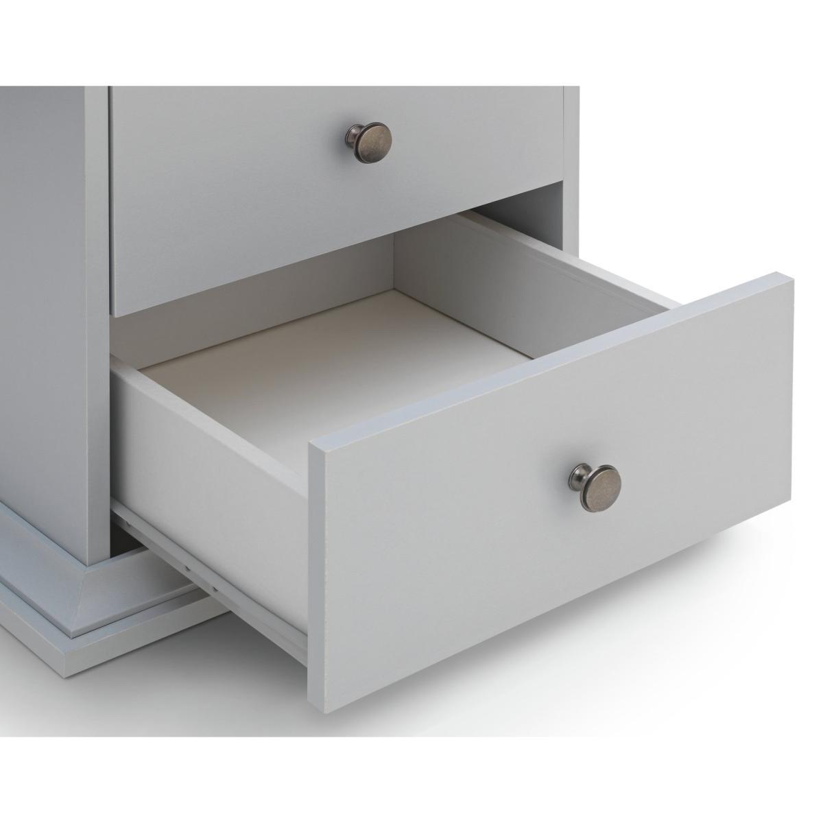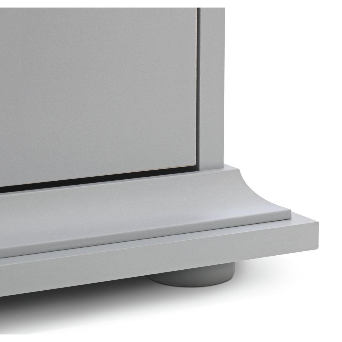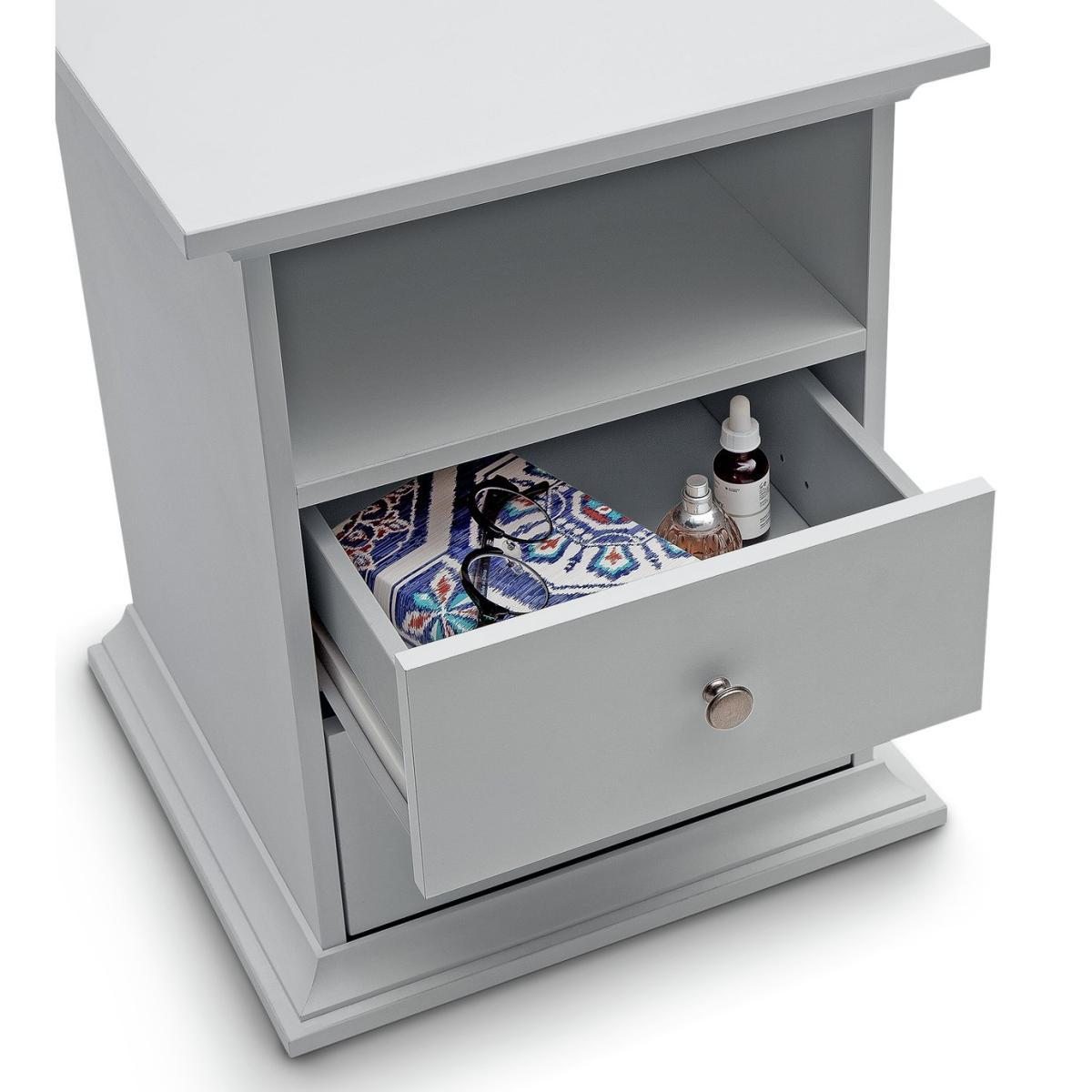 Dress your bed with this charming bedside cabinet. It's a fabulous way to add style to your bedside and so practical too. With 2 drawers for you to hide away those bedtime essentials, plus a cubbyhole for books and magazines. Plinth and cornice detailing, gunmetal handles, and a soft grey matte finish, create a classic design with modern style. Pair with matching table lamps for the perfect finishing touch. Nighty night.