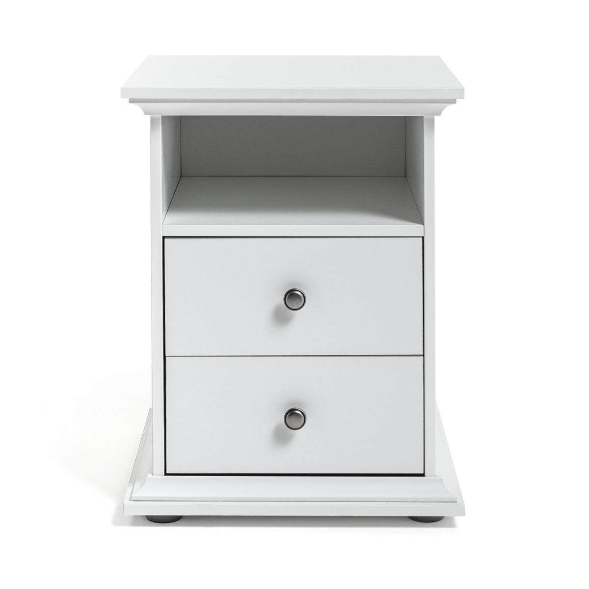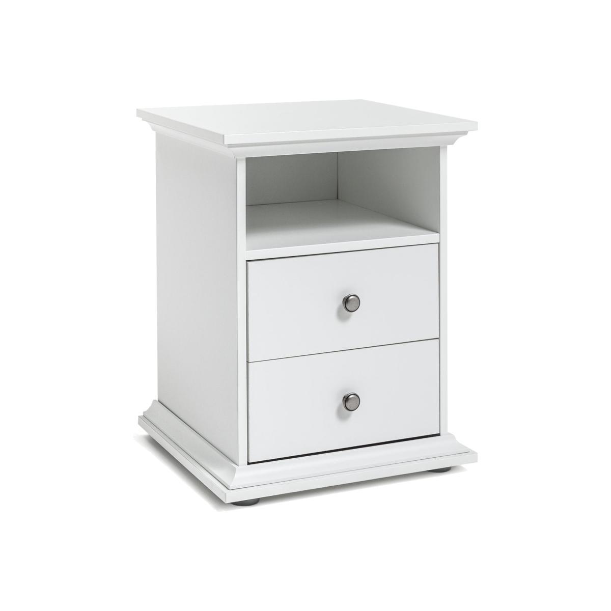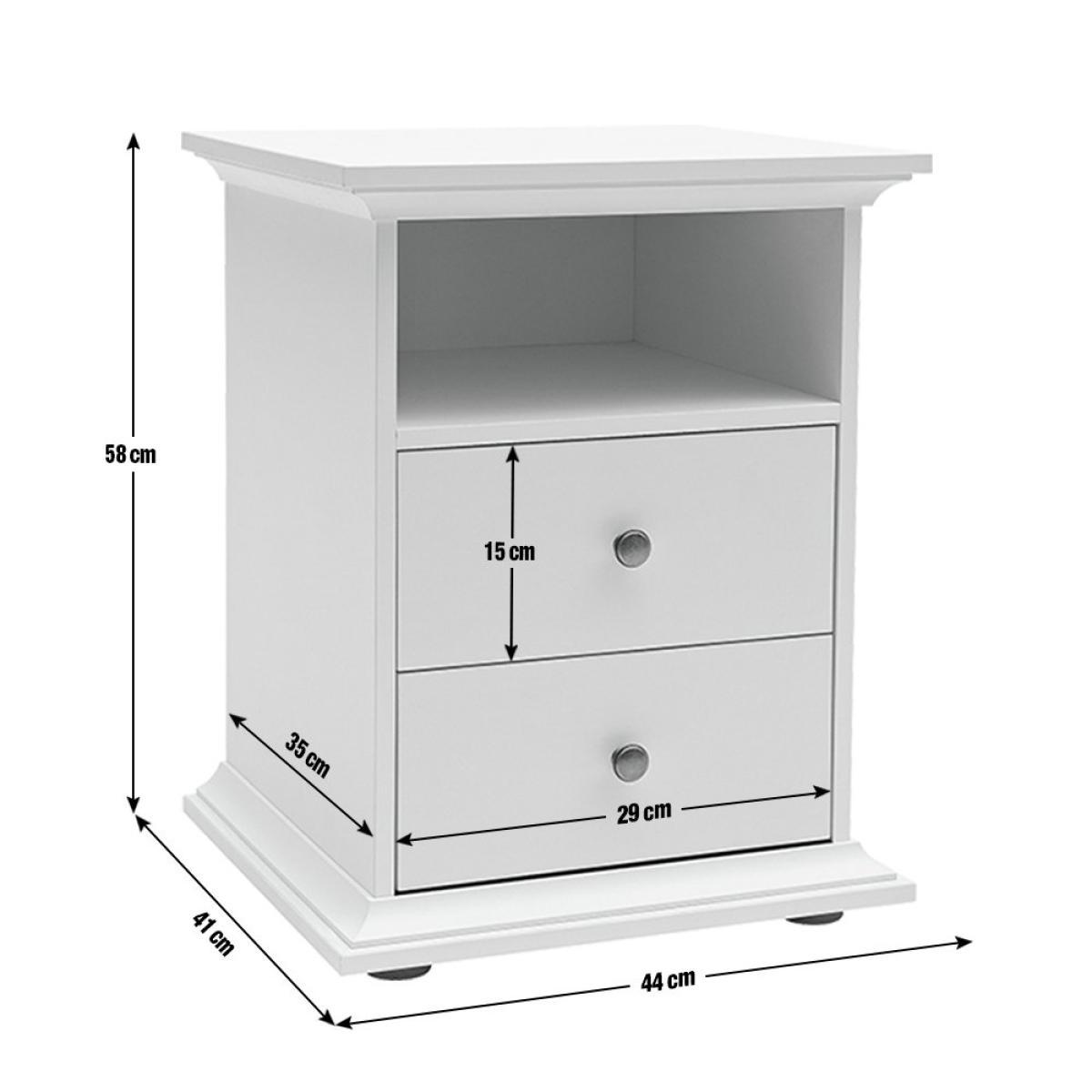 Dress your bed with this charming bedside cabinet. It's a fabulous way to add style to your bedside and so practical too. With 2 drawers for you to hide away those bedtime essentials, plus a cubbyhole for books and magazines. Plinth and cornice detailing, gunmetal handles, and a soft white matte finish, create a classic design with modern style. Pair with matching table lamps for the perfect finishing touch. Nighty night.