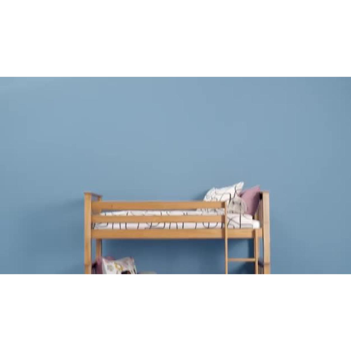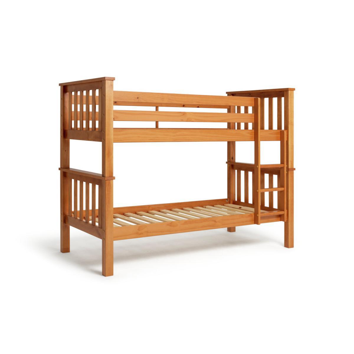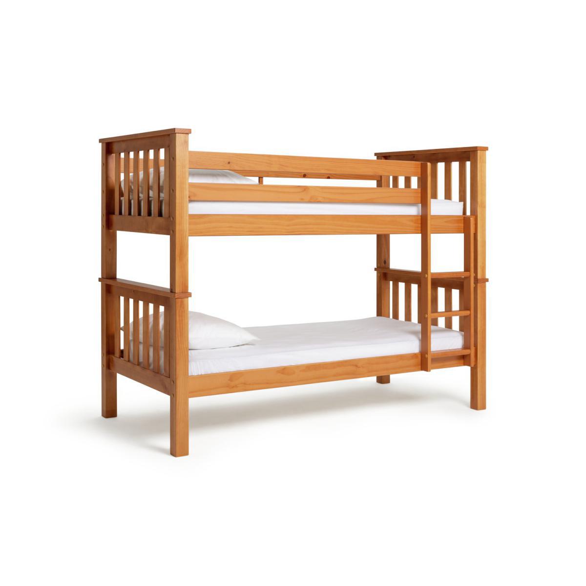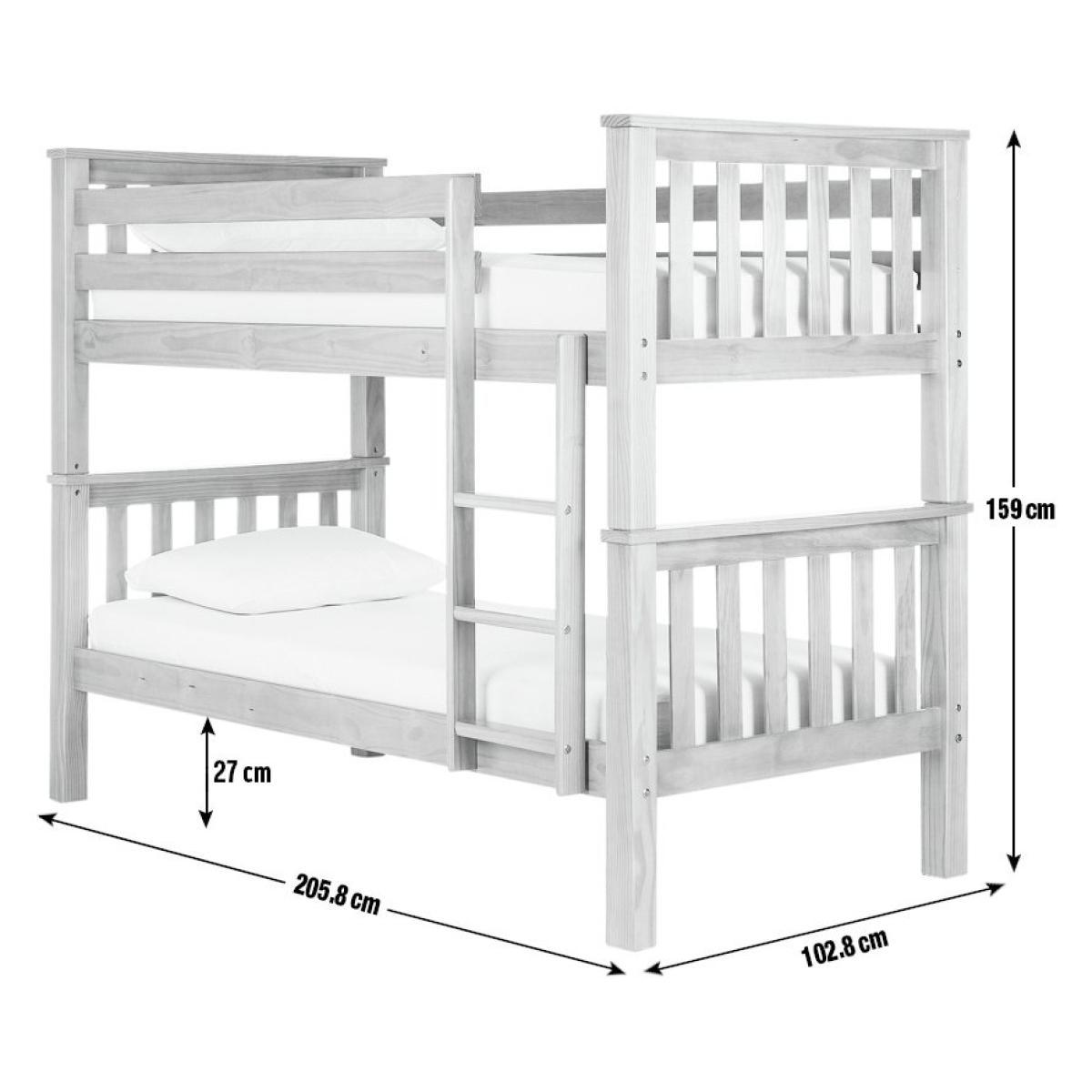 This chunky bunk bed is made with hardwearing solid wood. It comes complete with 2 Silentnight kids mattress so you can get set up as soon as it all arrives. The thick rails and slats help give it a sturdy finish and, best of all, it can be separated and used as 2 individual beds too. We've made sure the ground clearance is the same on both beds so if you use them separately, they'll look identical. Fitting holes are also plugged when you separate them so you'll still have the same high quality finish. The bunk bed comes with 2 silentnight kids mattresses (3148512). Ideal for growing children, the comfy kids mattress has an open coil design to provide firm support, while fibre filling adds a layer of cushioning. Foam free and chemical treatment free, it has a soft anti-allergy cover to help prevent dust mites, skin irritations and allergies. Part of the Heavy Duty collection. Bunk:Single bed. Pine bed with a mdf and solid wood frame. Includes wooden slats. Self-assembly - 2 people recommended. If this product is over 60cm high it must be securely attached to the wall to prevent overturning. Ladder is in a fixed position. Can be used as 2 single beds. Maximum user weight per bunk 100kg. For ages 6 years and over. Suitable for adult use (safety tested to 100kg). Mattresses:Requires 2 mattresses (included). Silentnight mattress. Medium feel mattress. Open coil mattress with 323 springs. Micro quilt finish. Flip mattress regularly. For safety, maximum depth of mattress to be used on top bunk is 16cm. Dimensions:Frame size L205.8, W102.8, H159cm. Safety rail height 36cm. Mattress size L190, W90, H16cm. Height between bunks 68.5cm. Clearance between floor and underside of bed 27cm. Bed weight 73.4kg. Package dimensions:Package 1 size H21.7, W110.8, D87cm. Package 2 size H13, W193.6, D25.2cm. Package 3 size H11.8, W95, D37.5cm. General Information: Manufacturer's 2 year guarantee.
