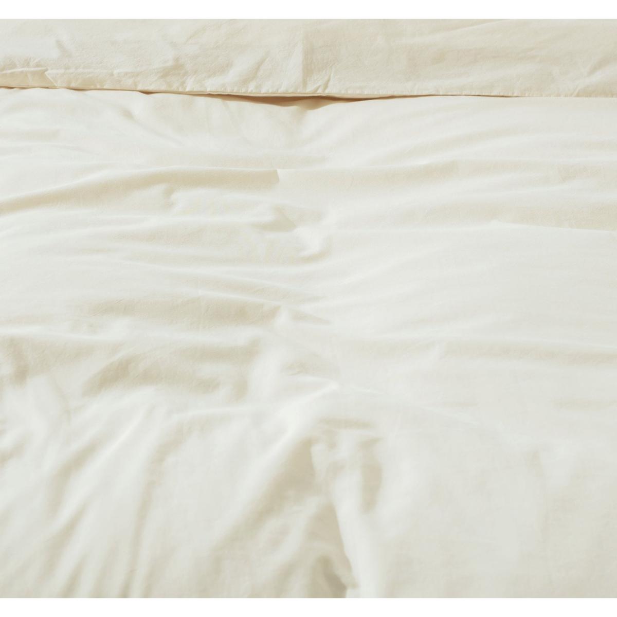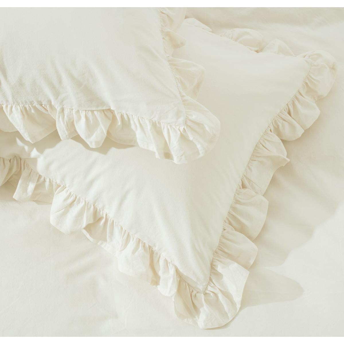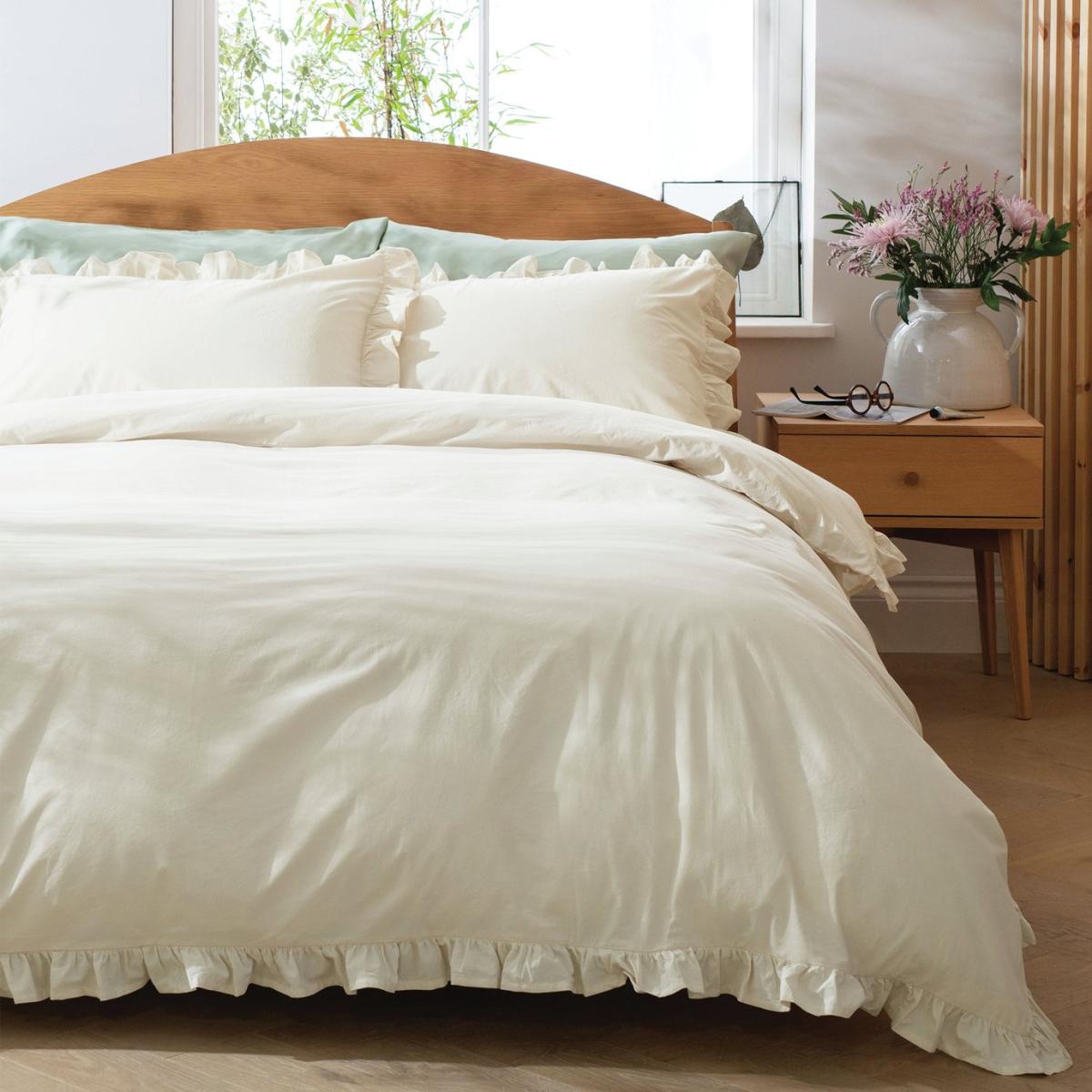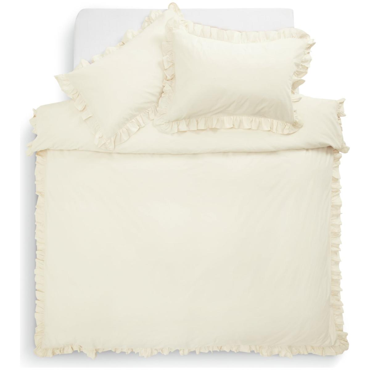 Made from 100% cotton this lovely bedding set is absolutely delightful to sleep in. Crisp but luxurious and soft. With a frill border on 3 sides of the cover and a full border on each pillow, it offers a romantic and timeless look. An easy way to bring a natural elegance back to the bedroom. Finish: percale. 100% cotton, 1006619%. 1006619% , 1006619%, 1006619%. 180 thread count. Set includes 1 duvet cover and 2 pillowcases. Bed size: double. Length 200cm, Width 200cm. Buttons for fastening. Standard pillowcase (s). Pillow case length 75cm, Width 50cm. Machine washable. Suitable for tumble drying.