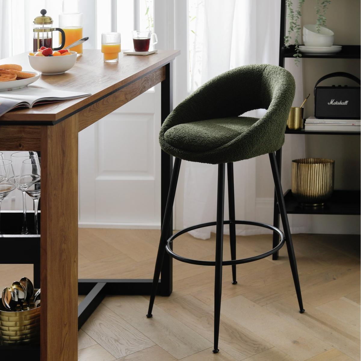 Comfortable, supportive and with a padded seat for maximum comfort, you'll be in no rush to leave Hermione. Our curvaceous bar stool, is a textured, boucle upholstered high dining chair. Legs sit comfortably on the footrest built into the black splayed leg frame too. Making it the perfect, plush perch to wine, dine and chat. Part of the Hermione collection. Chair: 1 chair supplied. Size H95, W51.5, D47cm. Seat height 74.5cm. Wood frame with metal legs. Fabric seat pad. Self-assembly - 2 people recommended. Max user weight per chair 80kg. Individual chair weight 6.5kg. Dust or wipe with a damp cloth only. Package Dimensions: Chair package size: H31, W72, D59cm. General information: We are excited to be welcoming some of our favourite HOME products into the Habitat range. Your product may arrive in Habitat or HOME packaging. Manufacturer's 1 year guarantee. FSC certified meaning the materials used for this product are responsibly sourced.