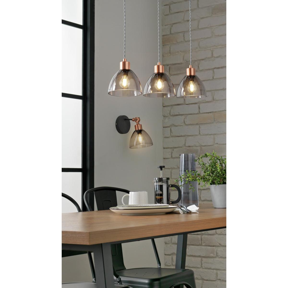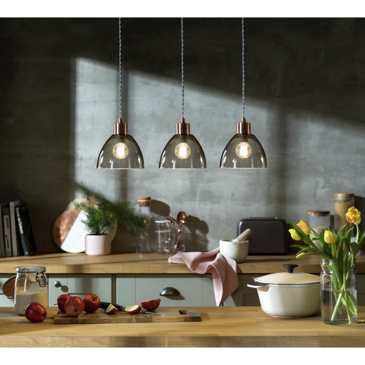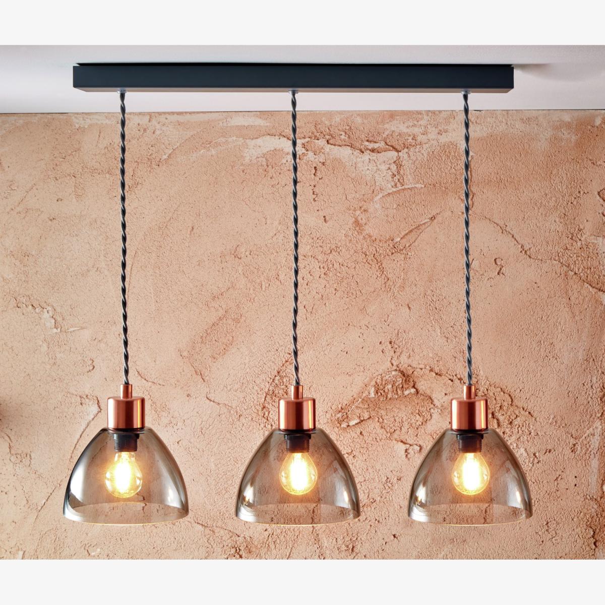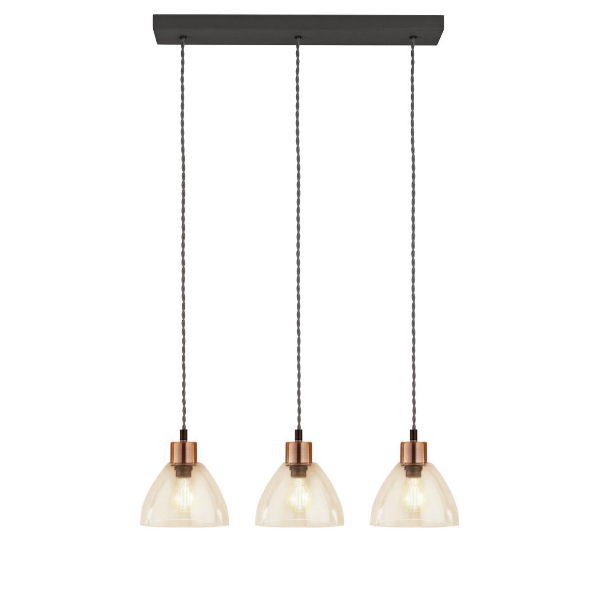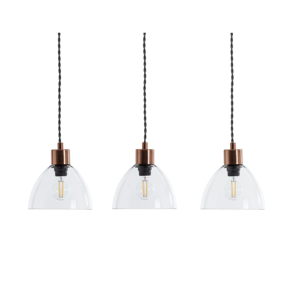 Crisp copper, smoked glass and sophisticated twisted cords combine to make the Highland Lodge 3 light pendant ceiling light a real showstopper. Simple yet elegant, this light creates a timeless mood of stylish country living, effortlessly. You can adjust the cord lengths to suit your space. Dimensions: W55, D15cm. Adjustable drop. 30 - 88cm drop. Bulb Information: Bulbs required 3 x candle E14 small edison screw LED (not included). Recommended maximum wattage: 40 watts. Can be used with a dimmer switch. General Information: Iron + glass. IP rating 20 - not suitable for bathroom use. Weight: 2kg. Minimal assembly. Product is hard-wired into electrics. This lighting product is a class 1 fitting. Manufacturer's 1 year guarantee.