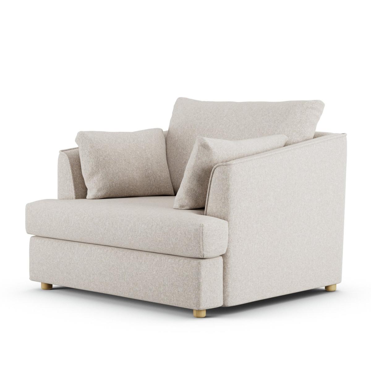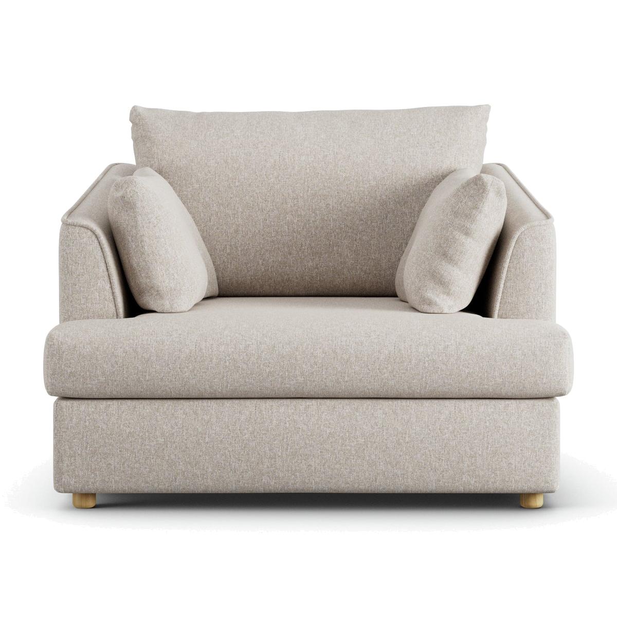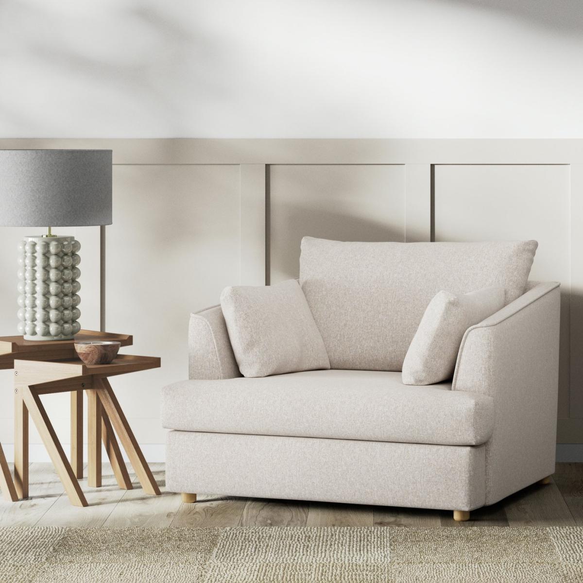 When it's made for you, you know you'll love it. Invitingly soft and ultra-comfortable, our Holmfirth cuddle chair features a wide T-shaped seat cushion that nestles into tapered armrests. Perfect to stretch out and relax on after a long day. And upholstered in a contemporary Flat Weave, the Holmfirth has a smooth but tonal look. Finished with thick piped detail, this impressive sofa gives an attractive layered appearance. Offering relaxed comfort Holmfirth's high density foam seat cushions sandwiched between softer foam layers and generously wrapped in soft wadding, create a more tailored look while providing the perfect balance of support, durability and recovery. Handmade to order in the UK. The Holmfirth uses quality materials and traditional techniques for furniture that's unique to you. Available in a choice of sizes and fabrics including Aquaclean technology protection built into the yarn, which is easy to clean with just water. Part of the Holmfirth collection. Material: Made from 100% polyester. Wooden feet. Removable seat with foam fibre wrap filling. Removable cushion(s) with foam fibre wrap filling. Dimensions: Size H86, W114, D110cm. Floor to seat height: 45cm. Depth of seat: 64cm. Height of seat back: 44cm. Width of seating area between arms: 51cm. Height of ARM rest: 64cm. Weight: 51kg. Packaged dimensions: Package size H91, W119, D115cm. General information: We do more than deliver your product, we unpack, set it up and take away the packaging. Manufactured in the UK using components sourced globally. Professional clean only. Plump cushions regularly to maintain shape. Manufacturer's 15 year frame guarantee.