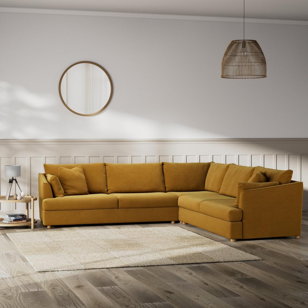 I love the bold gold hue of this corner sofa, which instantly elevates a neutral or minimalist interior. Its reversible design offers versatile placement options, making it adaptable to most living spaces. This sofa works particularly well in contemporary or eclectic interiors, where a statement piece is desired; it can also add warmth and a touch of glamour to more traditional settings when styled thoughtfully. Practical styling tips include pairing it with textured cushions and layered throws in complementary colours or metallic accents to enhance its luxe vibe. Given its striking colour, keeping surrounding décor understated helps the sofa remain a focal point without overwhelming the room.