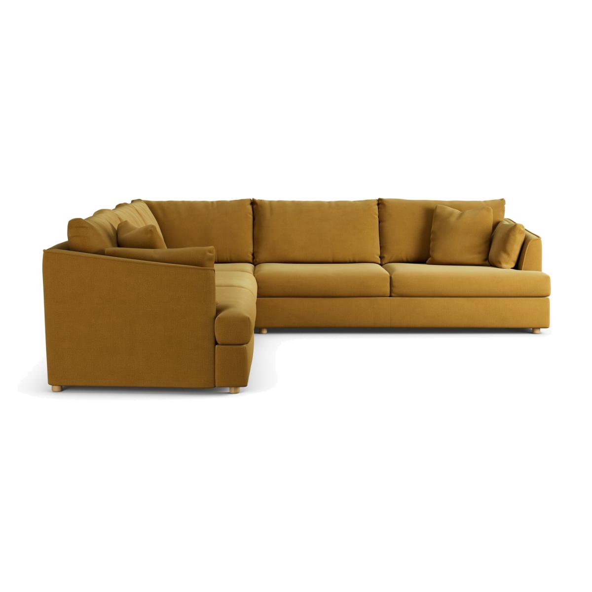 When it's made for you, you know you'll love it. Invitingly soft and ultra comfortable, our Holmfirth 4-seater corner sofa features wide T-shaped seat cushions that nestle into tapered armrests. Perfect to stretch out and relax on after a long day. And upholstered in rich velvet, it takes on a luxe look. Finished with thick piped detail and scatter cushions, this impressive 4-seater corner sofa gives an attractive layered appearance. Offering relaxed comfort Holmfirth's high density foam seat cushions sandwiched between softer foam layers and generously wrapped in soft wadding, create a more tailored look while providing the perfect balance of support, durability and recovery. Handmade to order in the UK. The Holmfirth uses quality materials and traditional techniques for furniture that's unique to you. Available in a choice of sizes and fabrics including Aquaclean technology protection built into the yarn, which is easy to clean with just water. Part of the Holmfirth collection. Reversible corner. Material: Made from 100% polyester. Wooden feet. Removable seats with foam fibre wrap filling. Removable cushion(s) with foam fibre wrap filling. Free fabric swatch available on this line. Dimensions: Size H86, longer width 292, shorter width 292,. Floor to seat height: 45cm. Depth of seat: 64cm. Height of seat back: 44cm. Shorter seating area width between arms: 196cm. Longer seating area width between arms: 196cm. Height of arm rest: 64cm. Weight: 120kg. Packaged dimensions: Package size H100, W174, D114cm. Second package size H100, W204, D114cm. General information: FSC certified meaning the materials used for this product are responsibly sourced. We do more than deliver your product, we unpack, set it up and take away the packaging. Manufactured in the UK using components sourced globally. Professional clean only. Plump cushions regularly to maintain shape. Manufacturer's 15 year frame guarantee.