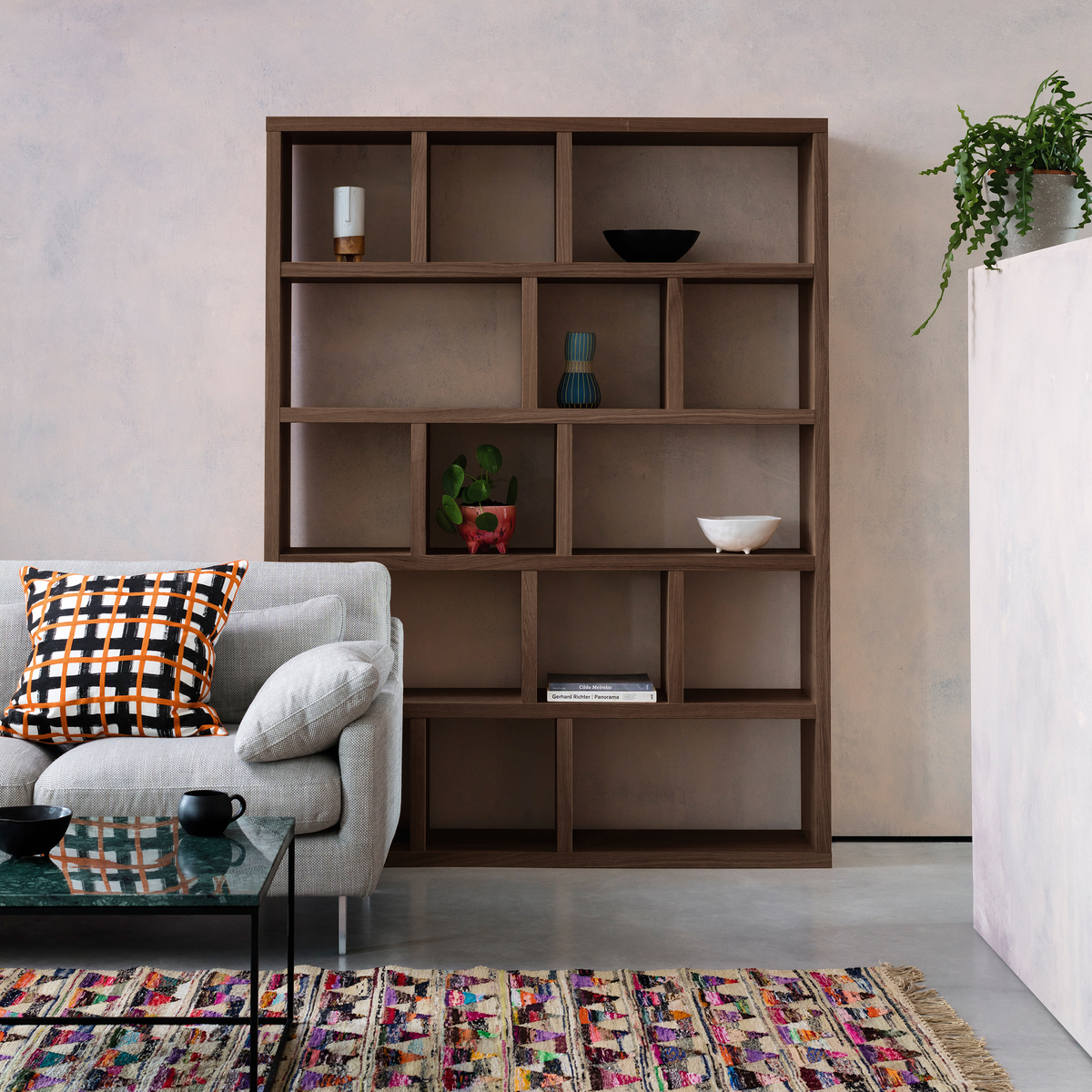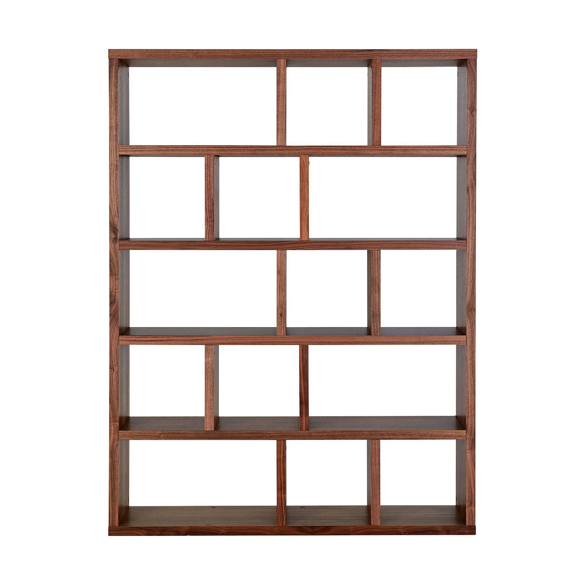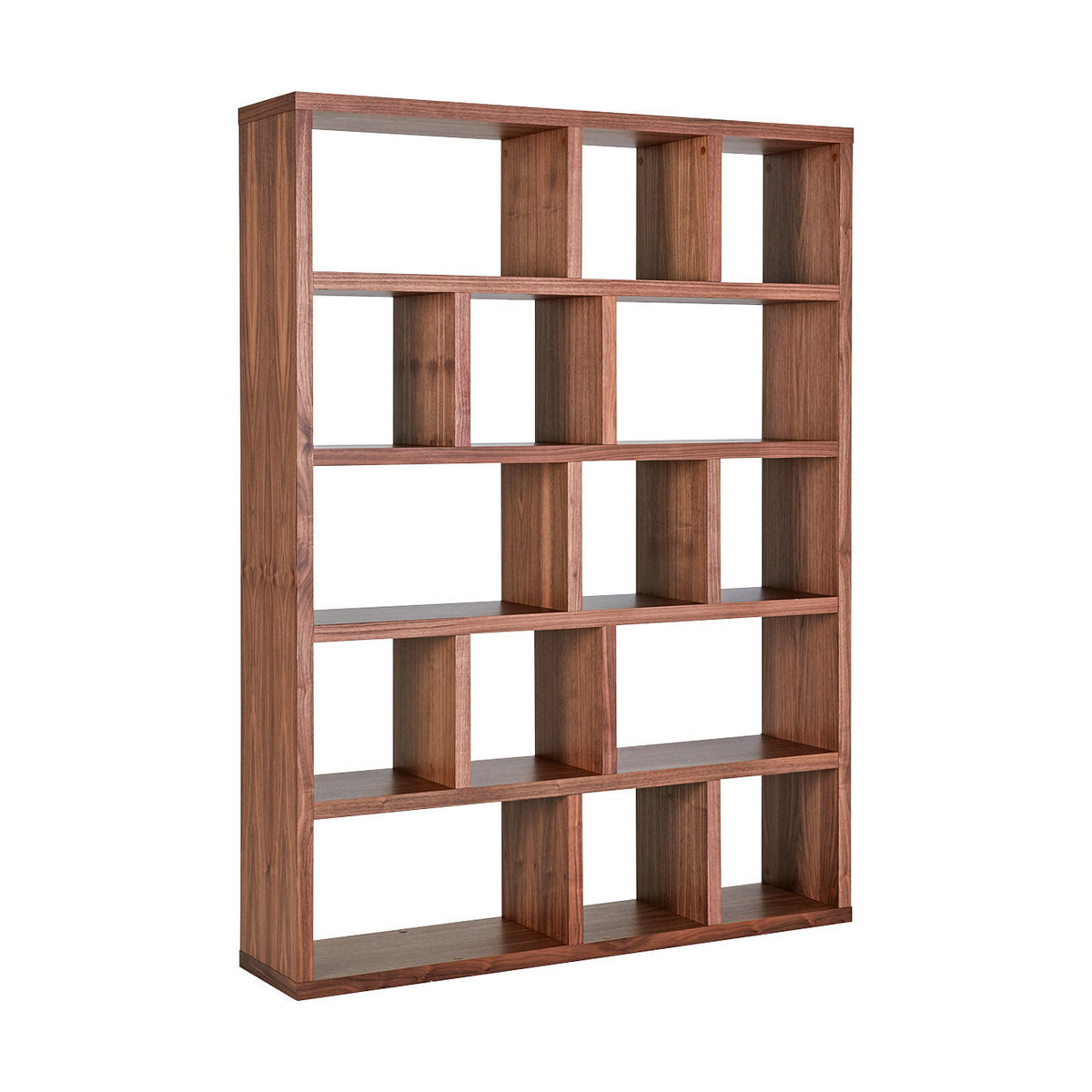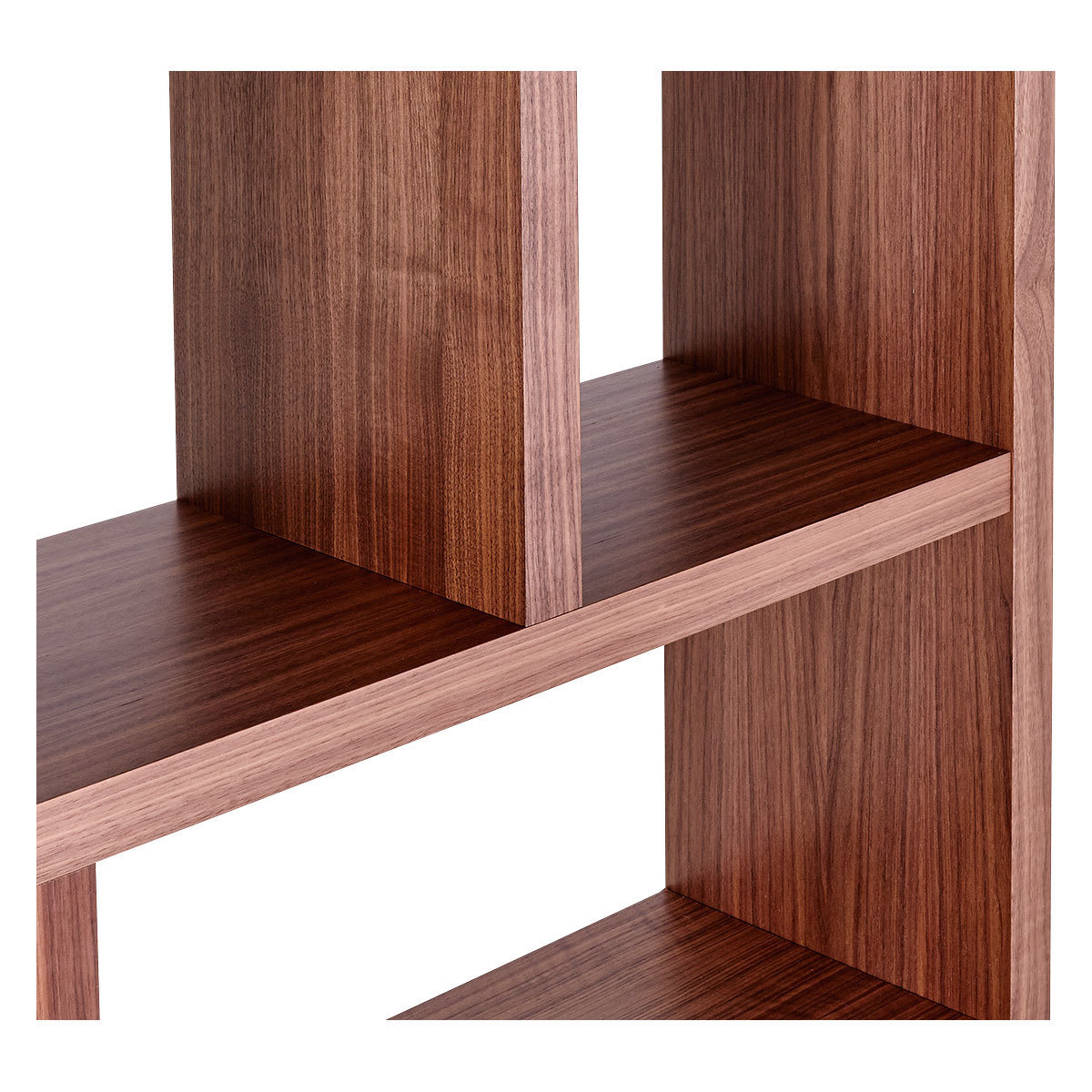 The great divide. The distinctive design of this solid wood bookcase is fresh and contemporary. The feature offset dividers are aesthetically pleasing. The walnut finish shows off the beauty of the wood grain for a warm natural vibe. Not just a bookcase, it's a showcase as well. Embrace your eye for design. Have fun putting just the right object in the right space. Stand back and admire. Designed to be versatile, this is a showstopper in the living room, a real advantage in the study or WFH area, and invaluable in a nursery.