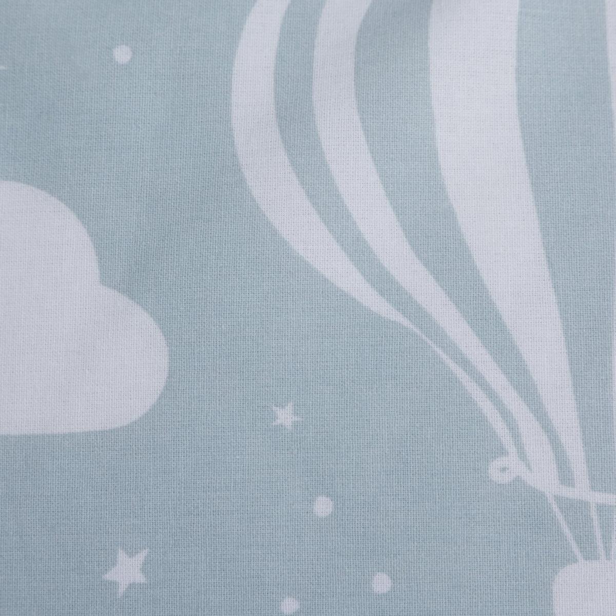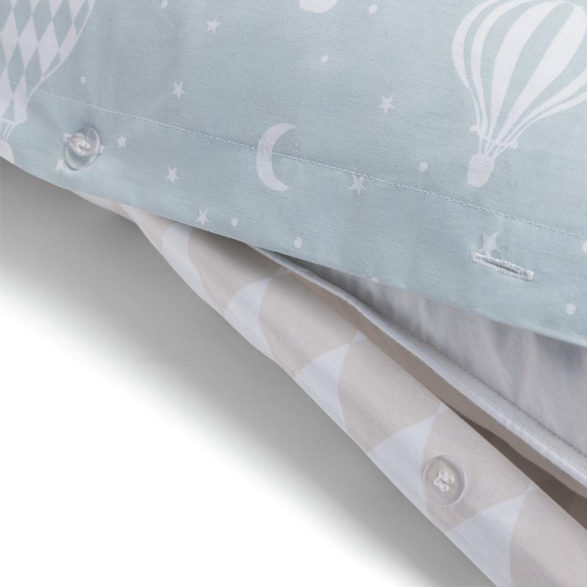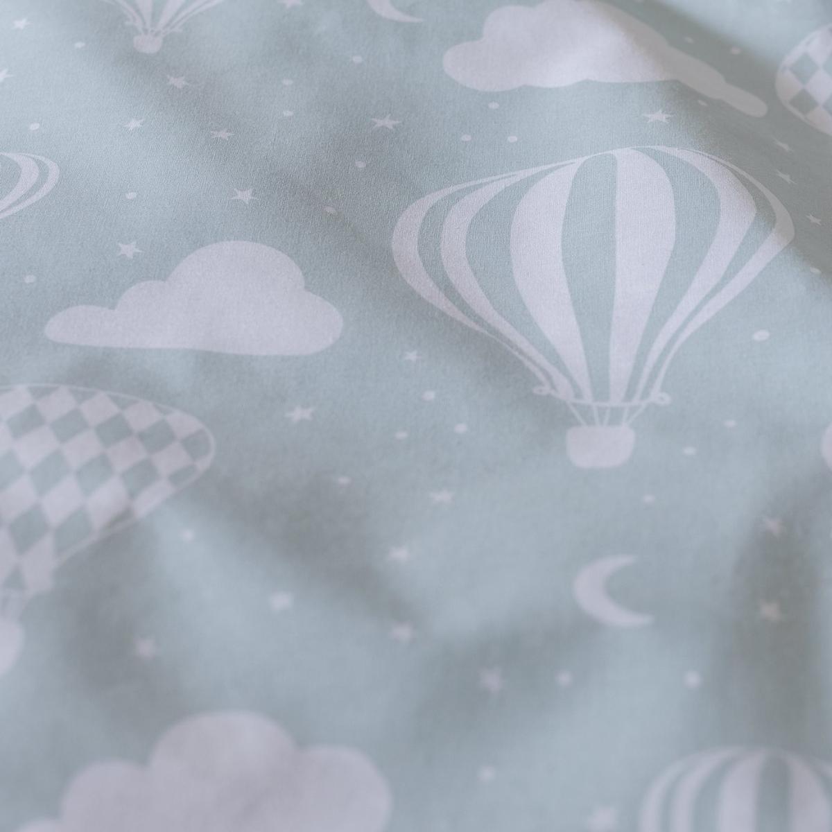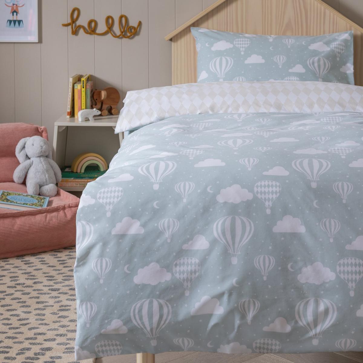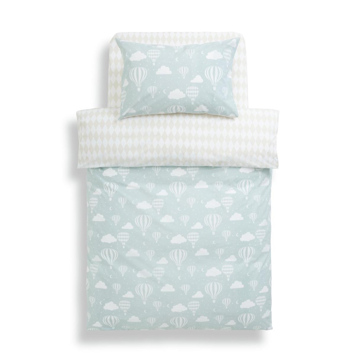 What a dream scene? Imagine floating through the fluffy clouds in a hot air balloon. So much better than counting sheep. This sweet bedding set is designed to soothe and encourage sleep. With a diamond reverse print option to ring the changes. Muted and mellow. Set comprises of 1 duvet cover, 1 pillowcase and 1 sheet. Blue Balloons pattern. Finish: woven. Size L150 x W120cm. Pillow case length 75cm, Width 50cm. Standard pillowcase (s). Reversible pillowcase (s). Reversible. Buttons for fastening. Machine washable at 40 C. Suitable for tumble drying. 52% recycled polyester, 48% cotton. 144 thread count.