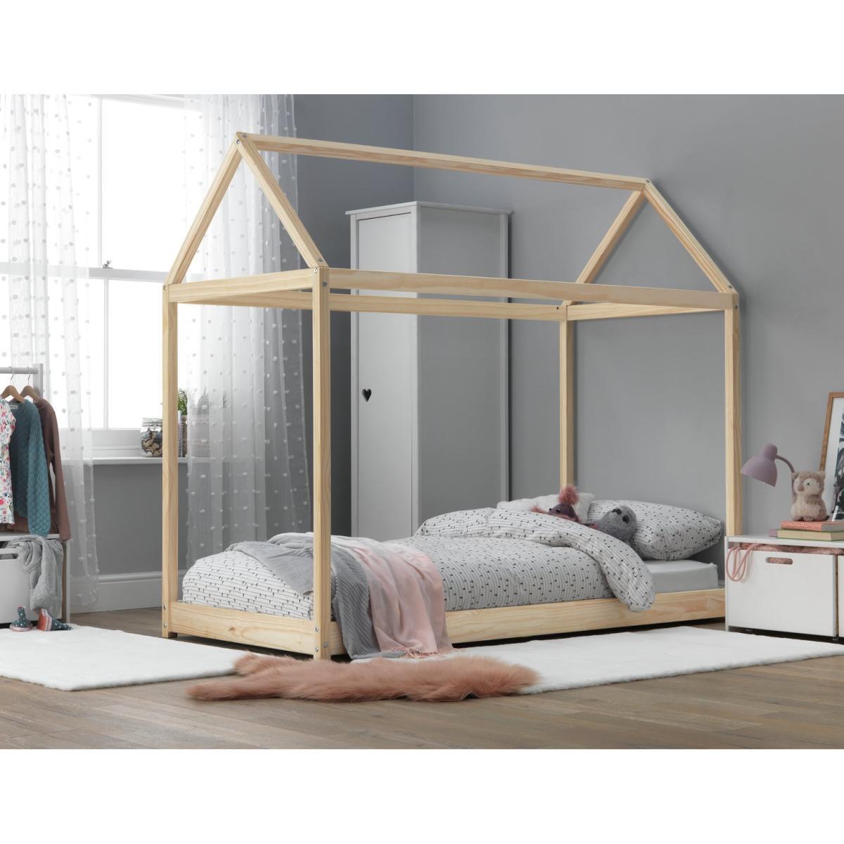 Build a little home they can call their own. This charming wooden house bed makes the perfect centrepiece to any little sanctuary. With its low base, it's perfect for young sleepers making the transition to their first big bed, and for older children, it's a fun and cosy place to snuggle up and get comfy on. Made from solid FSC wood, it's both natural and sustainable. Want to personalise it? As untreated wood, you can stain, paint or varnish this bed frame in any colour or finish you choose (paints sold separately). Or simply leave it as it is. Comes complete with an Argos Home Alexis single mattress. Medium feel, it's a comfy foam free open coil mattress with 192 springs, filled with soft fillings and a supportive core. Its soft knitted fabric sleeping surface has anti-allergy properties for a safe and healthy night's sleep, and to give you peace of mind. Our products are designed with kids in mind and are built to cope with everyday use. Tested to the latest safety regulations, they comply with British and European safety standards. Part of the House collection. Bed frame:Single bed. Pine bed with a solid wood frame. Includes wooden slats. Packed flat - 2 people recommended. Maximum user weight 100kg. For ages 4 years and over. Mattress:Requires 1 mattress (included). Argos Home mattress. Medium feel mattress. Open coil mattress with 192 springs. Knit cover with flat top finish. Anti allergy. Easy care no turn mattress. Dimensions:Frame size L197.4, W97.3, H174.6cm. Mattress size L190, W90, D16cm. General information:Manufacturer's 1 year guarantee.