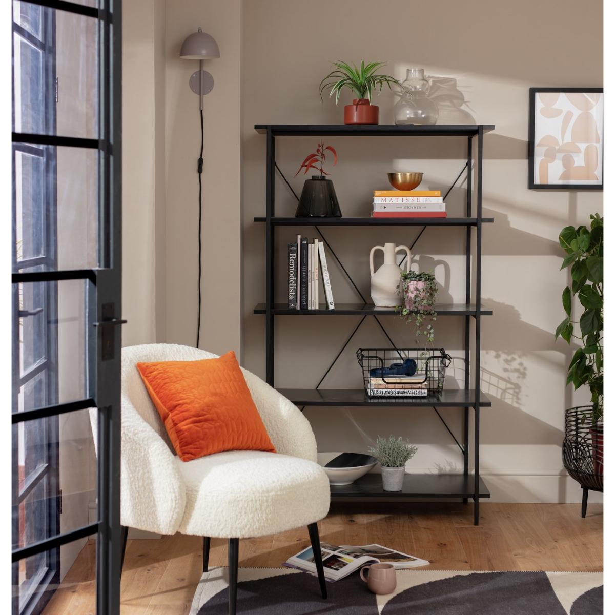 How useful is this Huckley shelving unit? Very. Standing free and crafted from stark black steel, its industrial credentials are on display. Yet Huckley loves showing off a softer side. See how pots, plants and artwork look comfortably at home nestled between books or boxes on the 5 tiers. A practical piece with a very long shelf life. Pair with more of our industrial items to create a modular look.