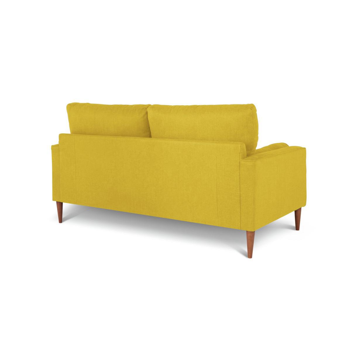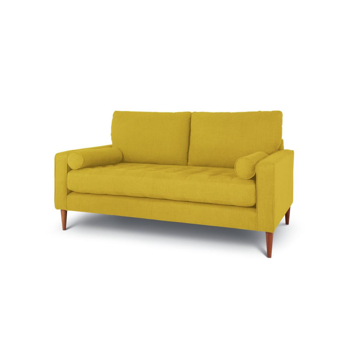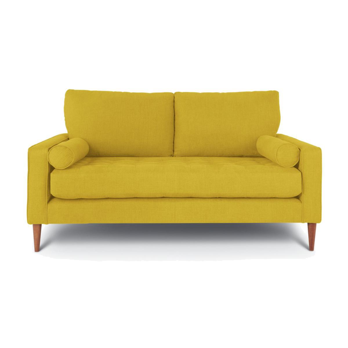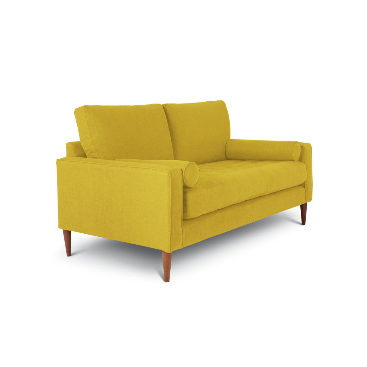 Buttons, bolsters, British. That's our Hudson. This fab 3-seater has a wonderful yellow tone that will create a soothing setting. Its soft-to-touch fabric wows. One of a kind, Hudson is characterised by its buttoned seat and striking bolster cushions. It has a stand-out style that just works. Hudson is raised up on slender wooden feet to give it an elegant edge. Best of British, its manufactured right here in the UK. Bolster up.