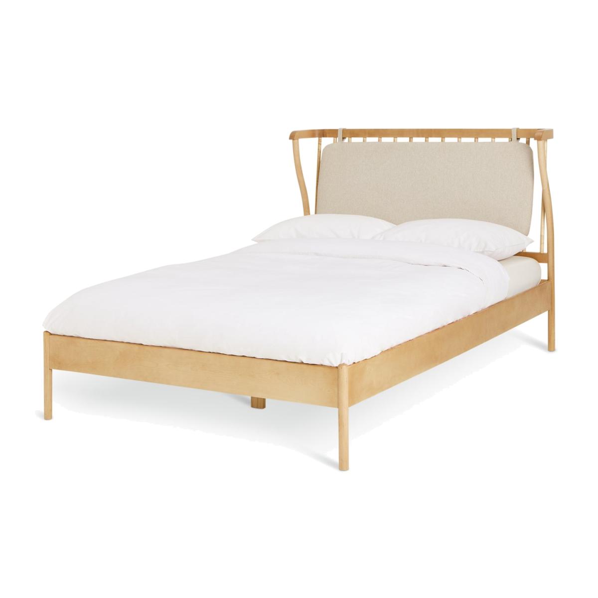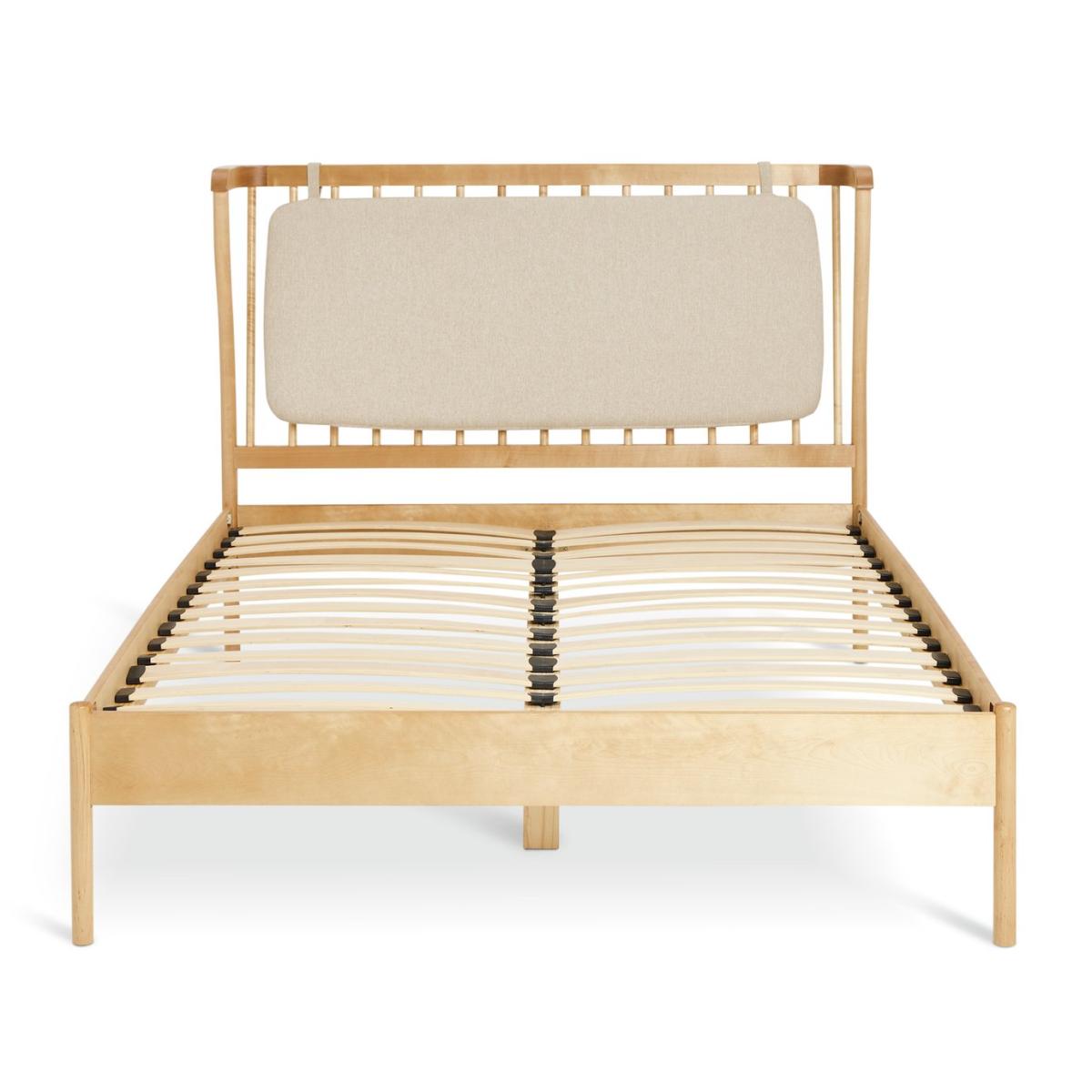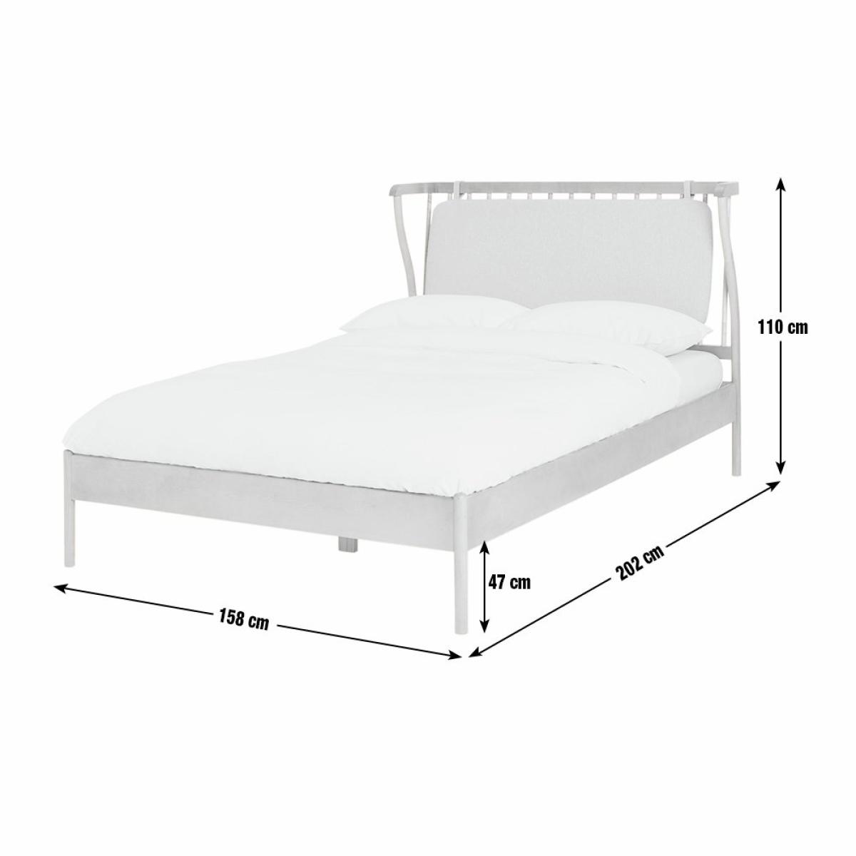 Retro looks. Comfort where it matters. Hugh blends sculptural curves and spindle details with a cushioned back pad. This removable fabric-wrapped headboard velcros on when you want extra softness, and off when you want clean lines. Slim wooden wings make you feel snug as a bug. Set on solid wood legs with a sprung slatted base for built-in bounce and proper mattress support. This bed is designed to give sleepy heads a good night's rest. Part of the Hugh collection. Wooden feet. Base with wooden slats. No storage. Size W158, L202, H110cm. 47cm clearance between floor and underside of bed. Weight 32.15kg. Total maximum user weight 110kg. Self-assembly - 2 people recommended. Package Dimensions: Package 1 dimensions: H28.5, W118, D165cm. Package 1 weight: 22.5kg. Package 2 dimensions: H10, W43, D207.5cm. Package 2 weight: 19.45kg. General Information: By choosing FSC certified products, you are supporting responsible management of the world's forests. Manufacturer's 2 year guarantee.