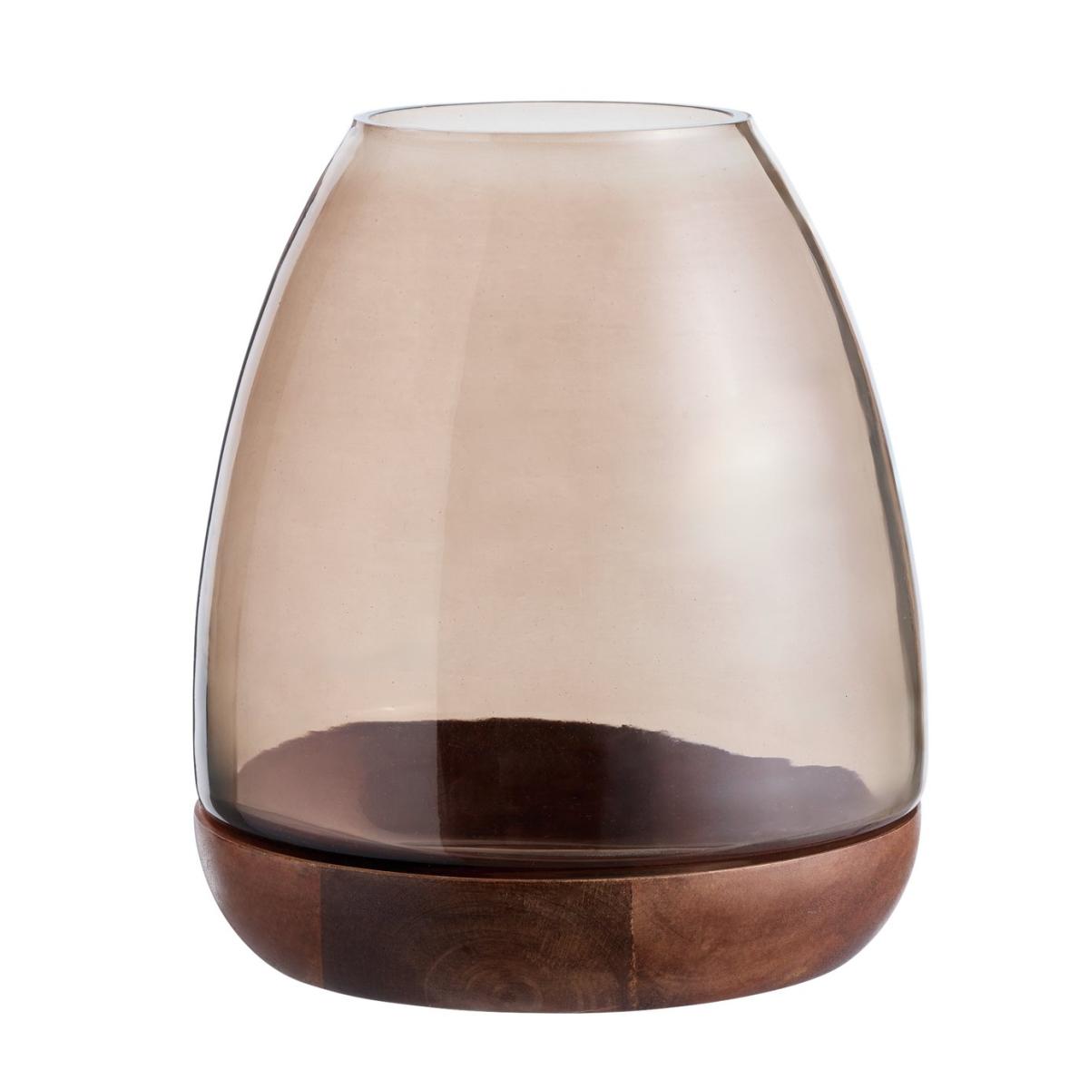 Modern, moody and minimal. Our acorn-inspired hurricane candle holder pairs glass with a smooth mango wood base. Perfect for holding pillar candles. The bold, sculptural silhouette makes a striking statement while the gentle tint softens the flickering flame. Glowing gently in the hallway or as a dining table centrepiece, this sets the ambience to 'just right'. Size H22, W19, D19cm. Diameter 19cm.