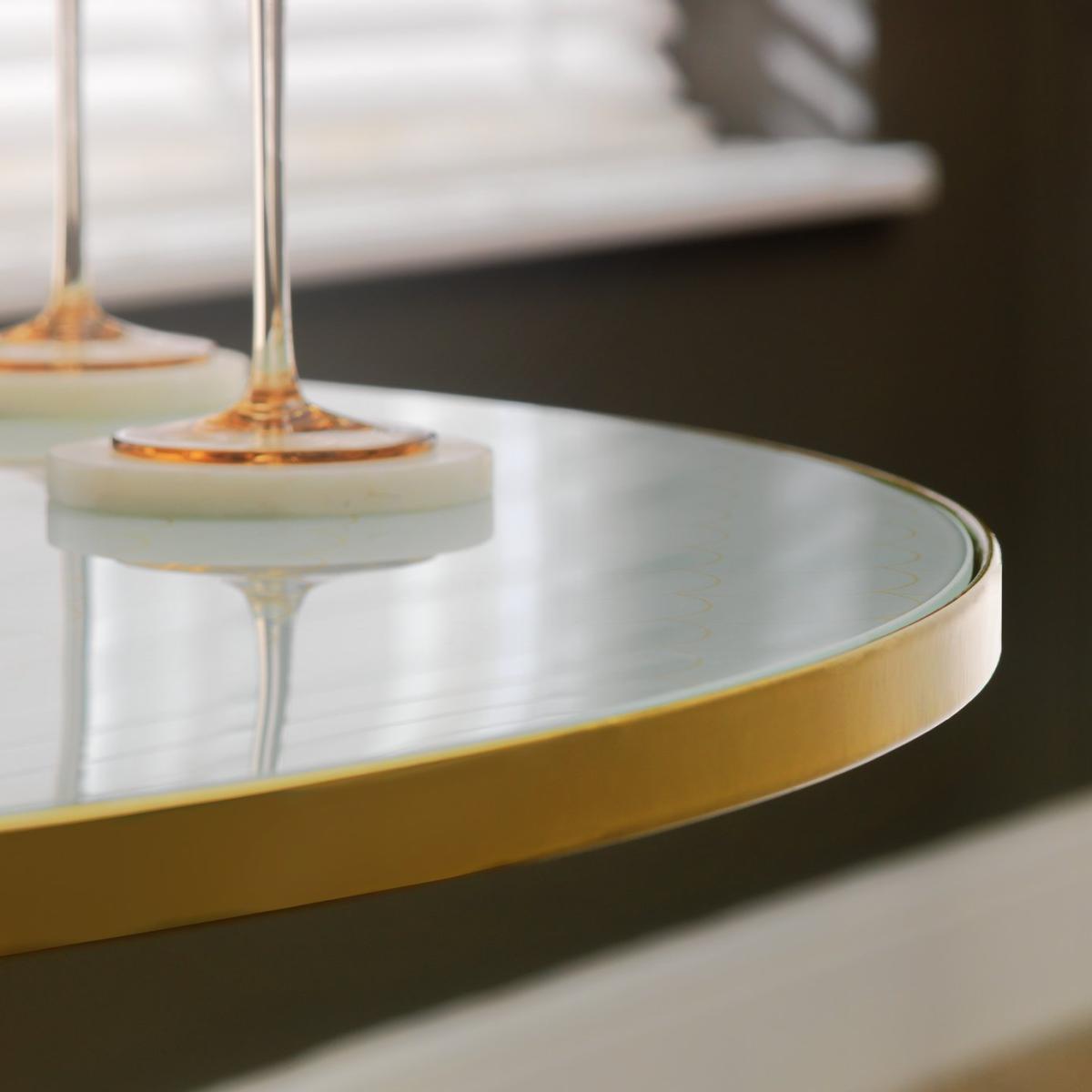 What a show stopper. We can't take our eyes off this fabulous hourglass table and 4 matching chairs. We're loving the fusion of decorative glass and polished brass. Pure glamour. Take a look at the scalloped pattern glass table. It's the hot design trend. The brass base and 4 chairs are stylishly cool with a unique industrial vibe. Crack open the wine, serve up the nibbles.