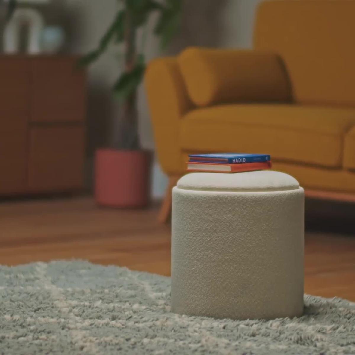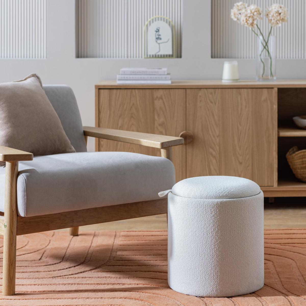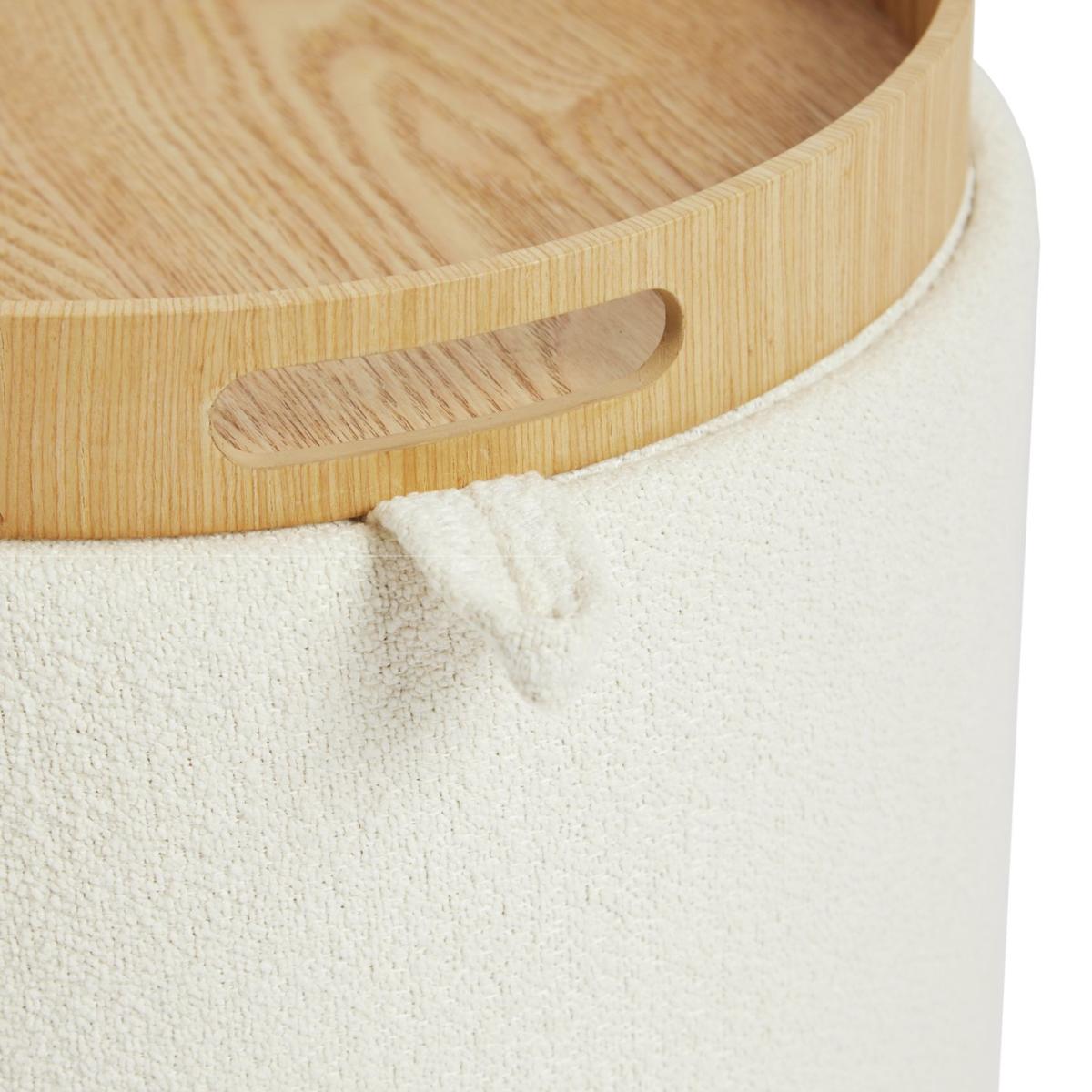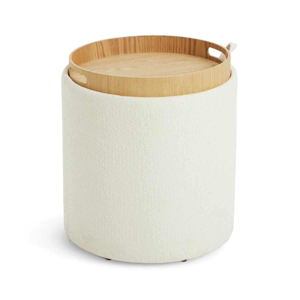 There's more to our comfy cream Ingo side table than meets the eye. Remove the padded lid and flip, and voila. You have a smart side table with an oak veneer tray top. Then lift again to see the hidden storage space. What a versatile, space saving star. Part of the Ingo collection. Size H 38, W 34, D 34cm. Made from fabric and MDF with a wood effect finish. 1 undershelf. Weight 2.6kg. Fully assembled. Maximum load weight 130kg. Package Dimensions: Package 1 dimensions: H43, W36.5, D36.5cm. General information: Manufacturer's 1 year guarantee. FSC certified meaning the materials used for this product are responsibly sourced.