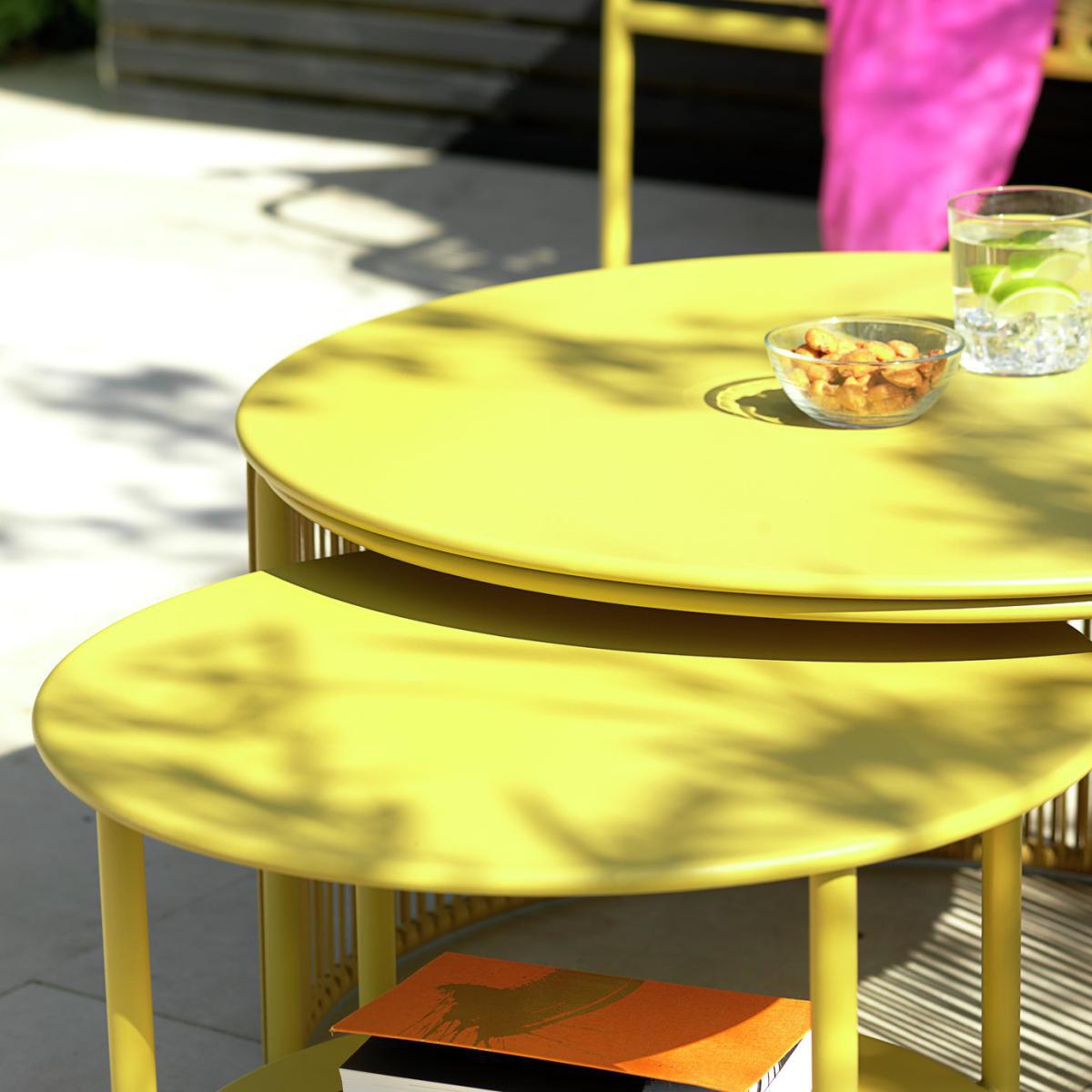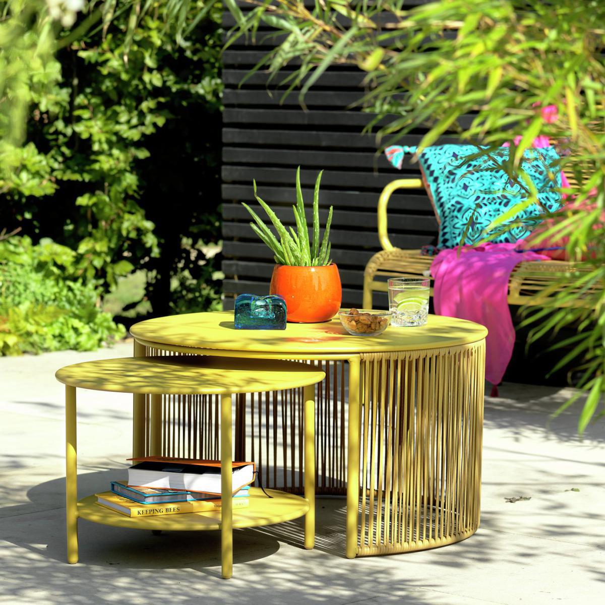 We love clever design, don't you? And this Ipanema coffee table set is clever and showy. The circular yellow metal table is contemporary cool. But get this, it comes with a smaller version. A mini me that neatly fits underneath. Call it smart storage. Bring both out when you've a crowd round. Other times keep it safely tucked away. Ideal for a patio. It's eye-catching and practically perfect. Comes fully assembled so that's easy too. Just put it outside or pop it in the conservatory and you're good to go.