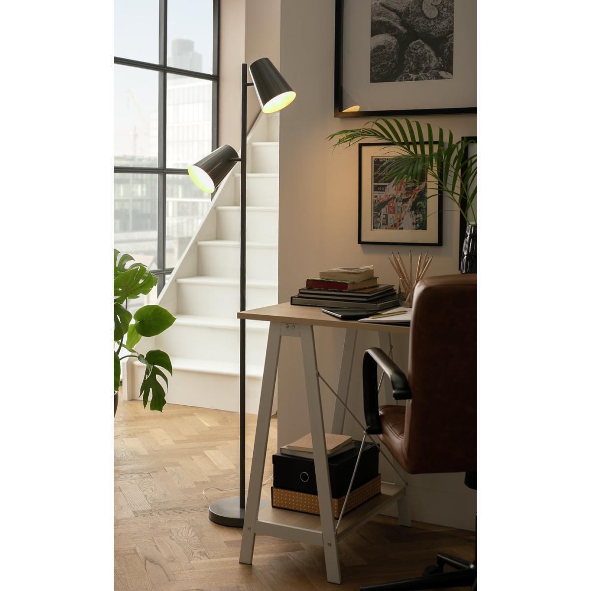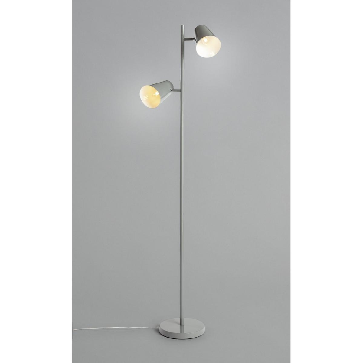 One stand, two lamps. Brilliant. Our 5ft double shade floor lamp is a trendsetter. Industrial and sleek in warm grey, it's twice as nice for brightening a dark corner. The handsome cone-shaped fixtures are designed to widen each bulb's reach, giving off soft, ambient light. Want to create a luxe loft look? Match with neutral colours and a wooden floor. Doubly cool.