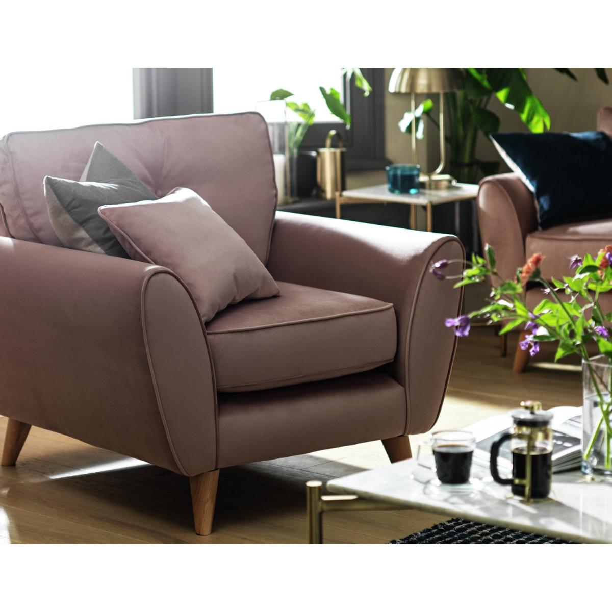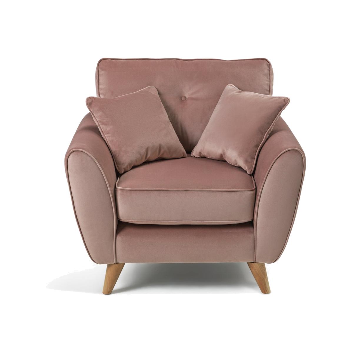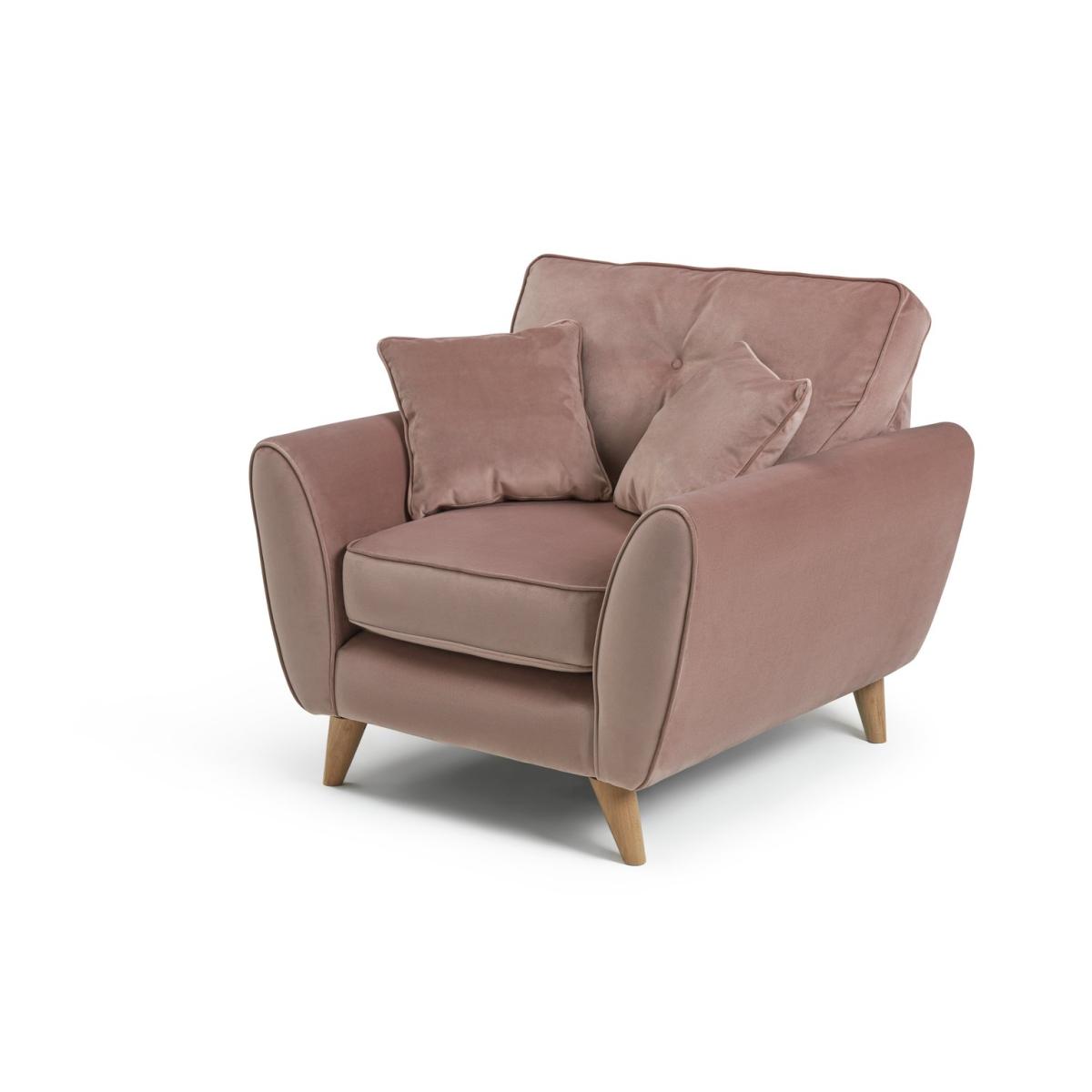 Elegant and snuggly soft, that's Isla. Our irresistible armchair is designed with mid-century modern comfort in mind. Just look at those clean curves and traditional button details. Retro, right? While tapered, slim wooden legs lend a contemporary edge. Upholstered in 100% velvet, its smooth texture and beautiful blush pink tones bring a luxe, romantic touch to your living room. And we've thrown in a couple of scatter cushions for extra comfiness. A chair that feels just as good as it looks.